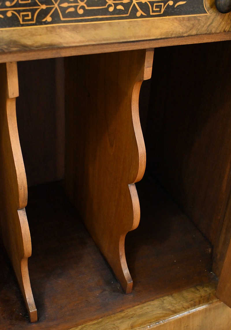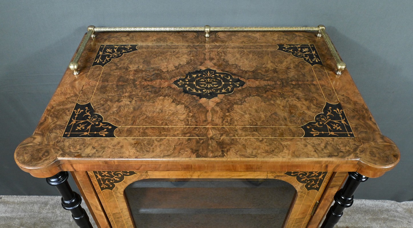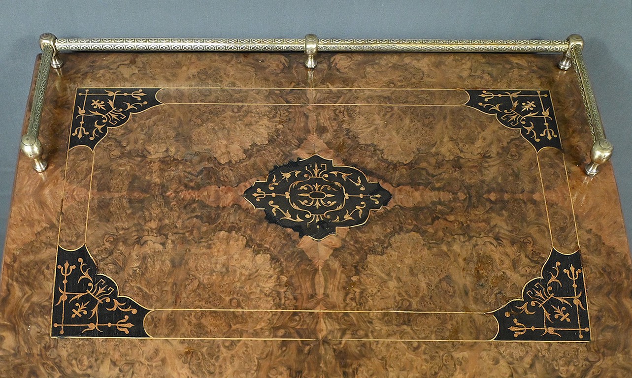 Son dessus est doté d’une structure tubulaire en laiton ouvragé surmontant un plateau en placage de ronce de noyer avec marqueterie de bois noirci et de bois clair formant rinceaux et volutes.