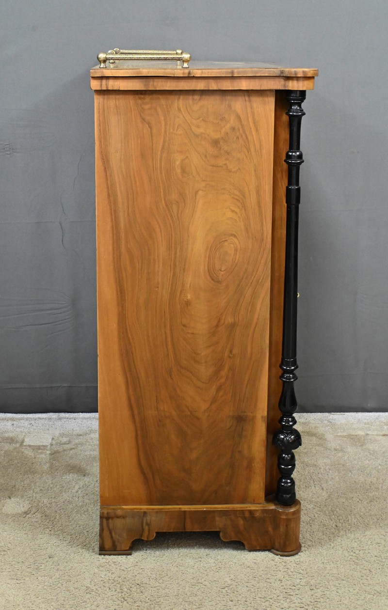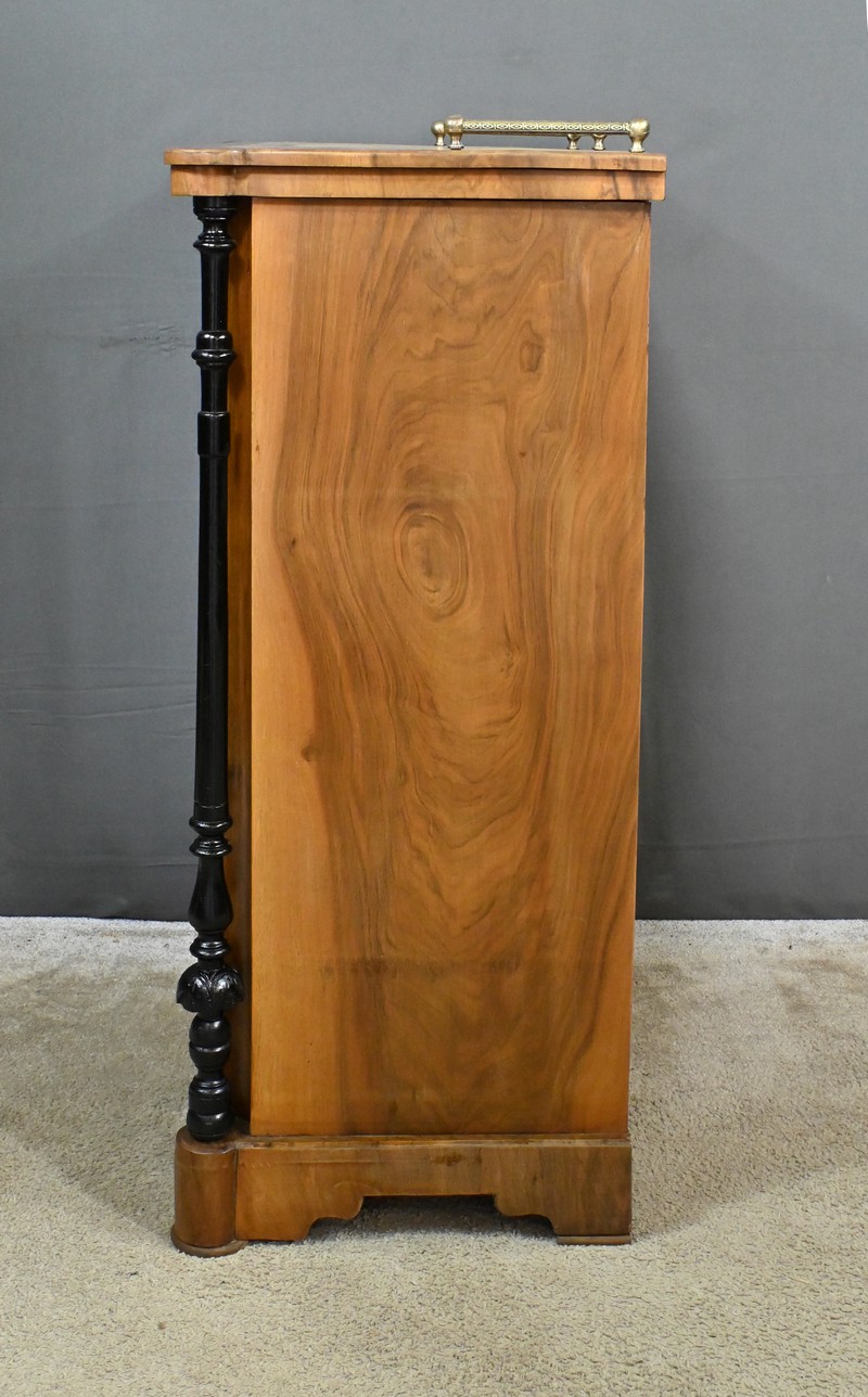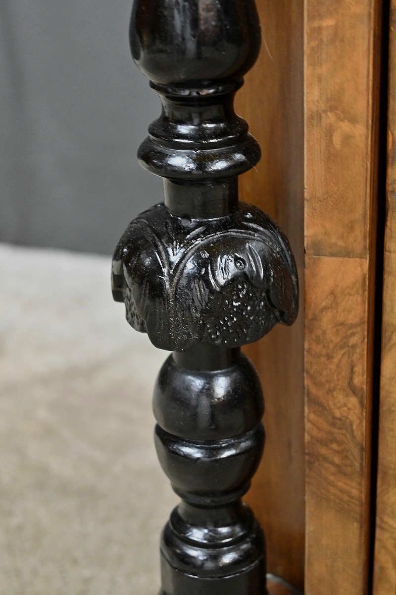 Ce petit meuble est flanqué de colonnes en bois noirci, tournées et sculptées, offrant un jeu subtil de motifs et de proportions.