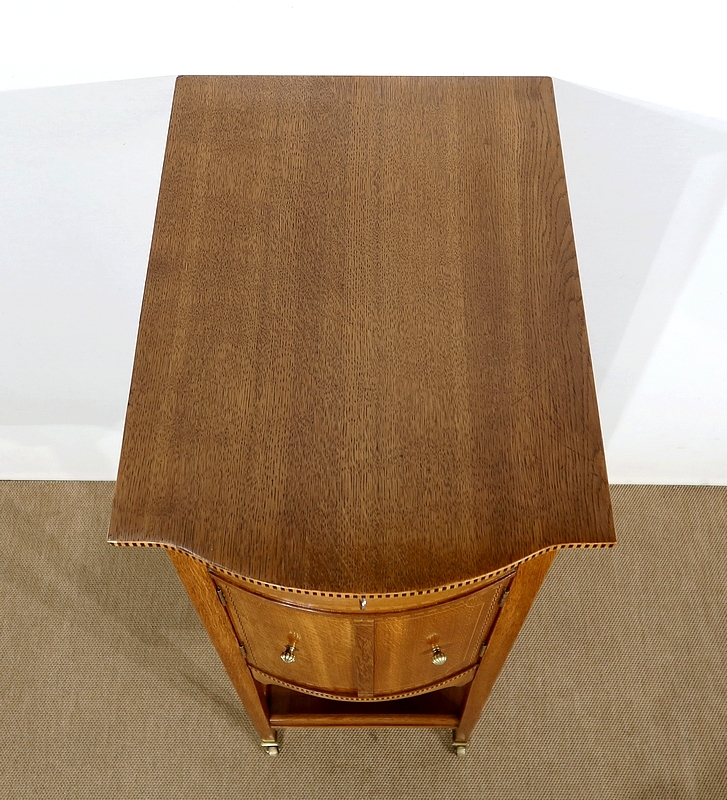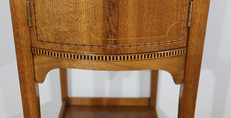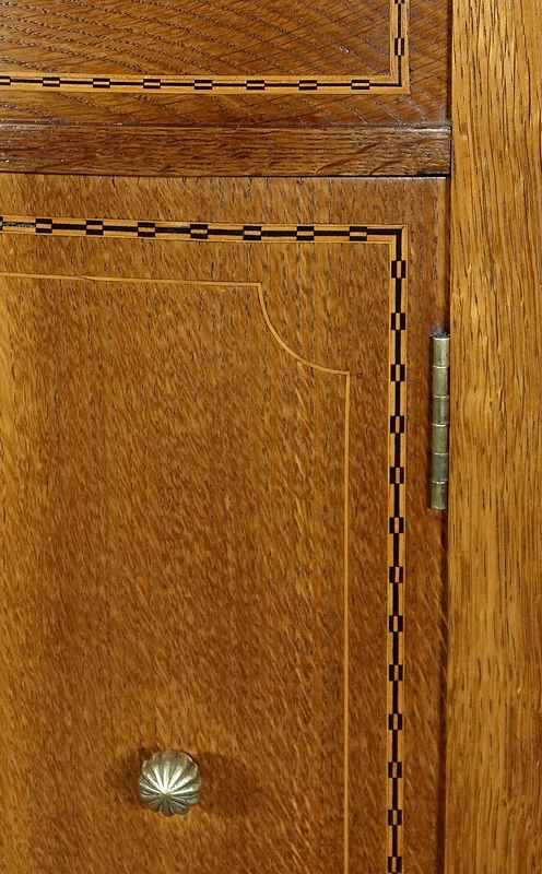 Le Meuble est doté d’une façade légèrement galbée, comme ses portes munies de charnières et de boutons en bronze strié. Ces deux portes sont en chêne légèrement marronné incrusté de marqueterie de citronnier et d’éléments d’ébène comme le chant du couvercle avec son alternance verticale d’essences de bois différentes.