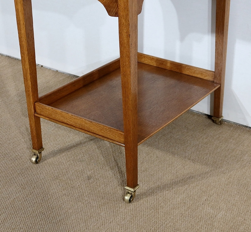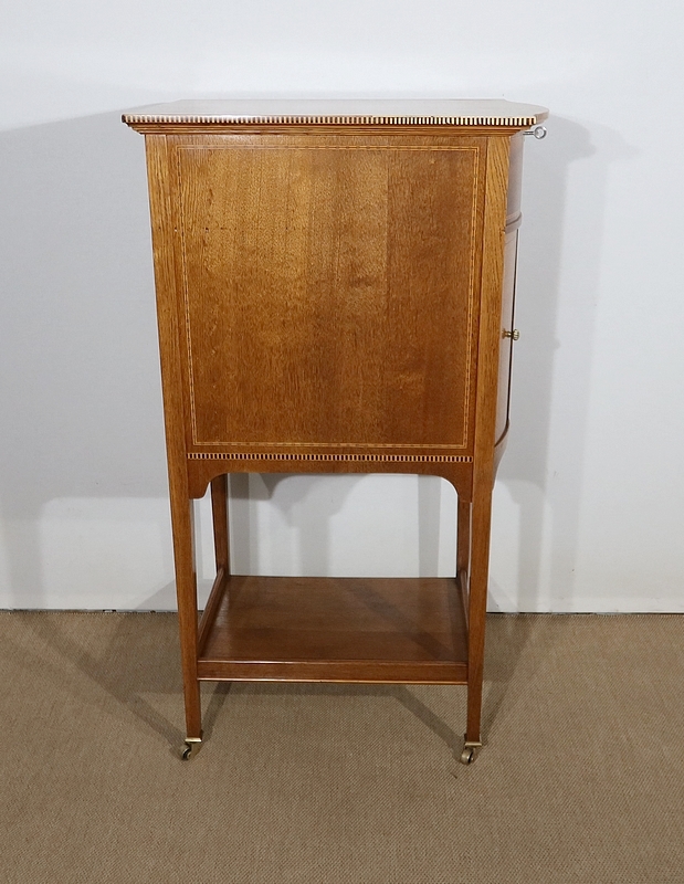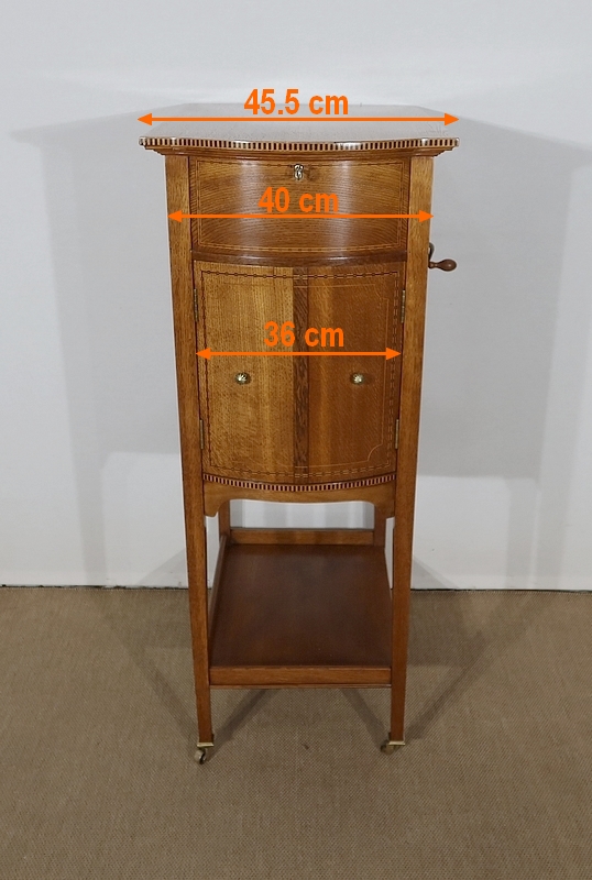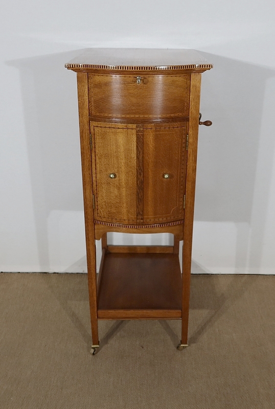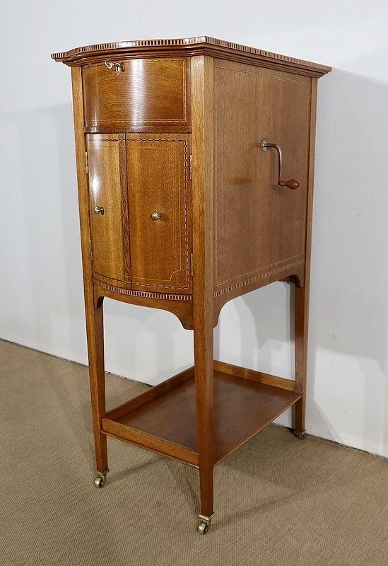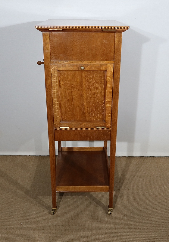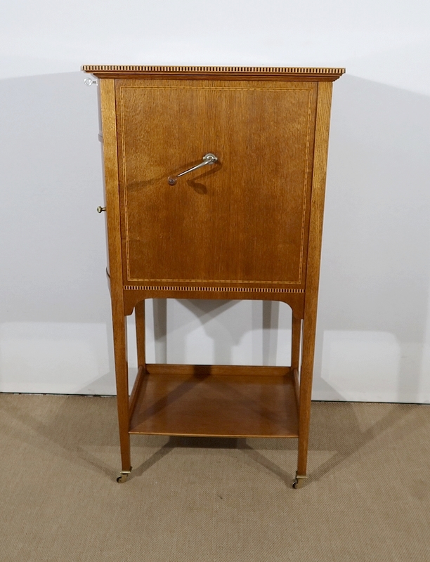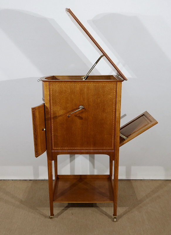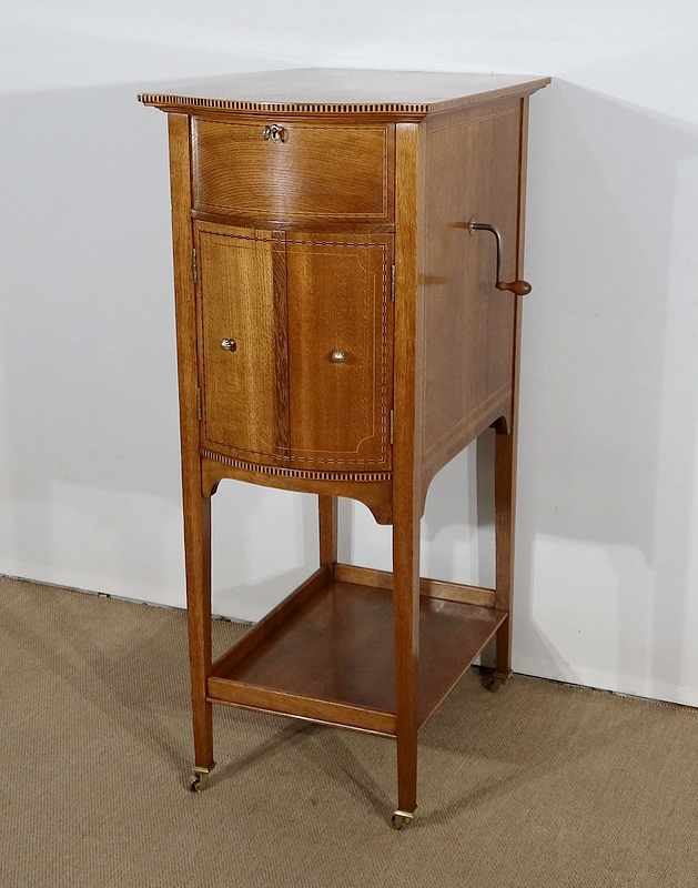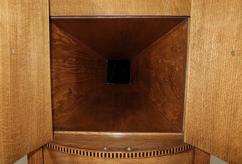 Les côtés de ce meuble à musique sont également en chêne agrémenté de citronnier et d’ébène. En partie arrière, une porte à encadrement avec charnière en laiton et bouton en bronze s’ouvre permettant d’accéder au mécanisme du gramophone.
