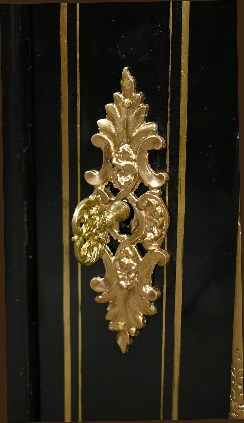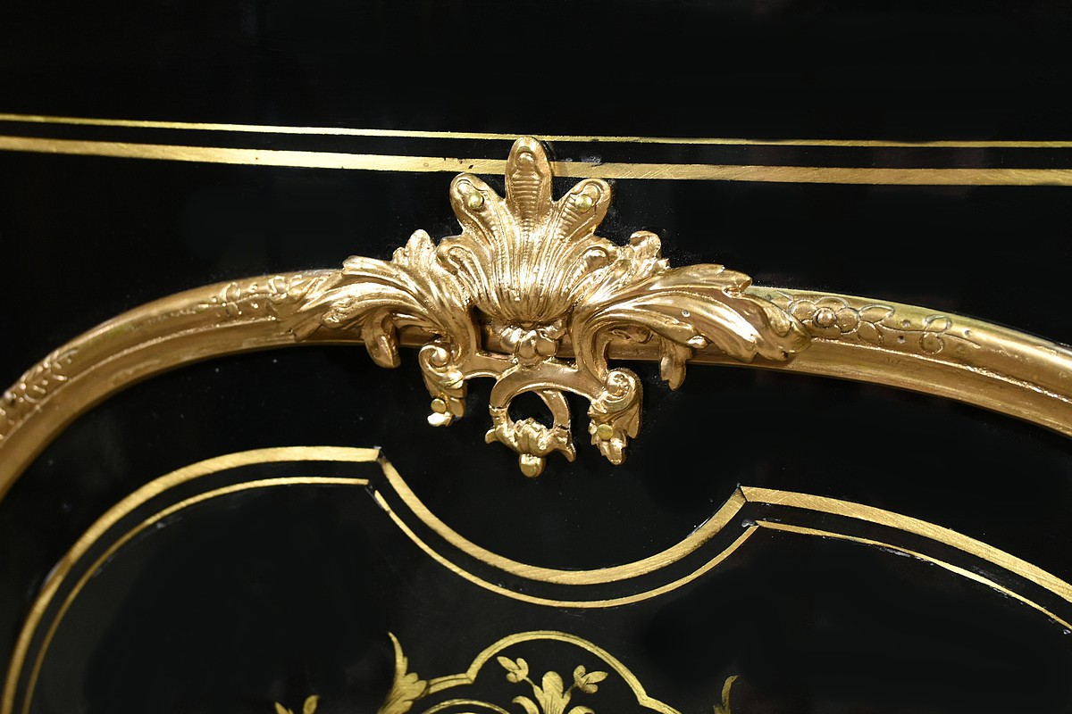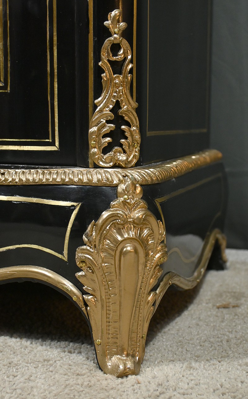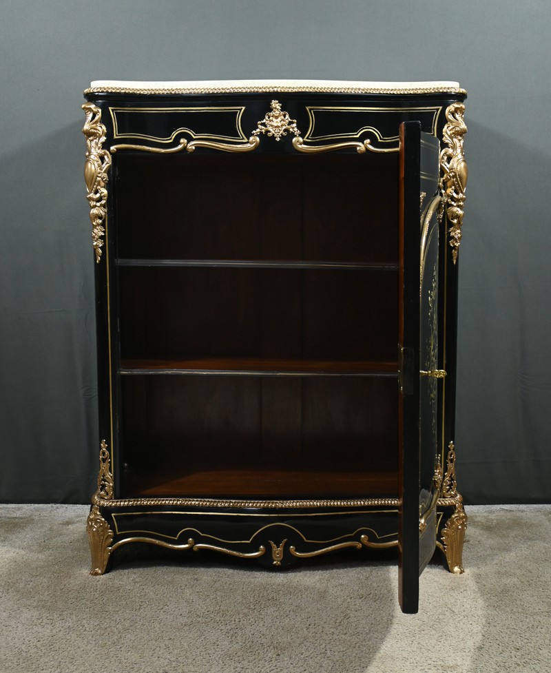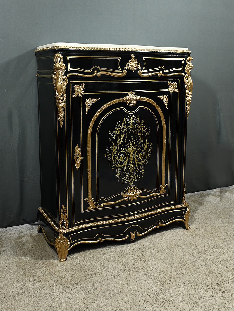 Il s’ouvre par une porte à encadrement, ornée d’une belle composition de laiton ciselé formant rubans, guirlandes de fleurs et feuilles d’acanthe entourant un vase. Celle-ci est entourée de filets de laiton incrustés et d’une arche en bronze festonné. Cette porte est dotée d’une clé ouvragée accompagnant la serrure d’origine en état de fonctionnement. De chaque côté de ce meuble, les montants sont dotés de chutes en bronze doré. En partie basse, des baguettes godronnées en bronze font le pourtour du meuble en décrochement. L’ensemble repose sur quatre pieds volutés. La partie supérieur de ce meuble d’appui est ornementée d’une frise florale entourée de filets de laiton incrustés. Au dessus, un marbre blanc de Carrare veiné de gris est encastré et ceint de lingotières bronze façonné.