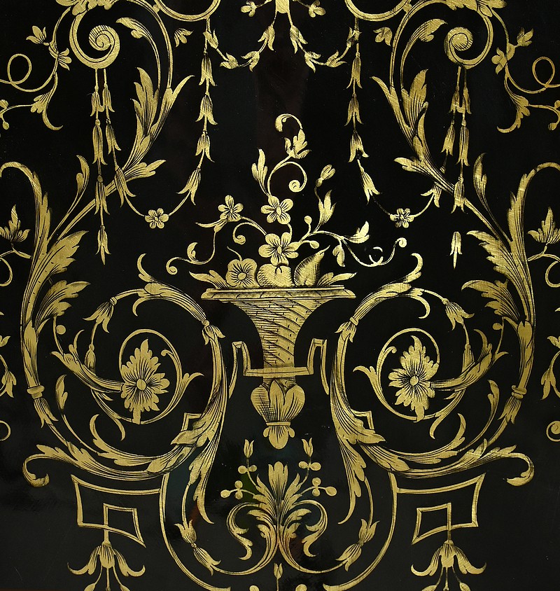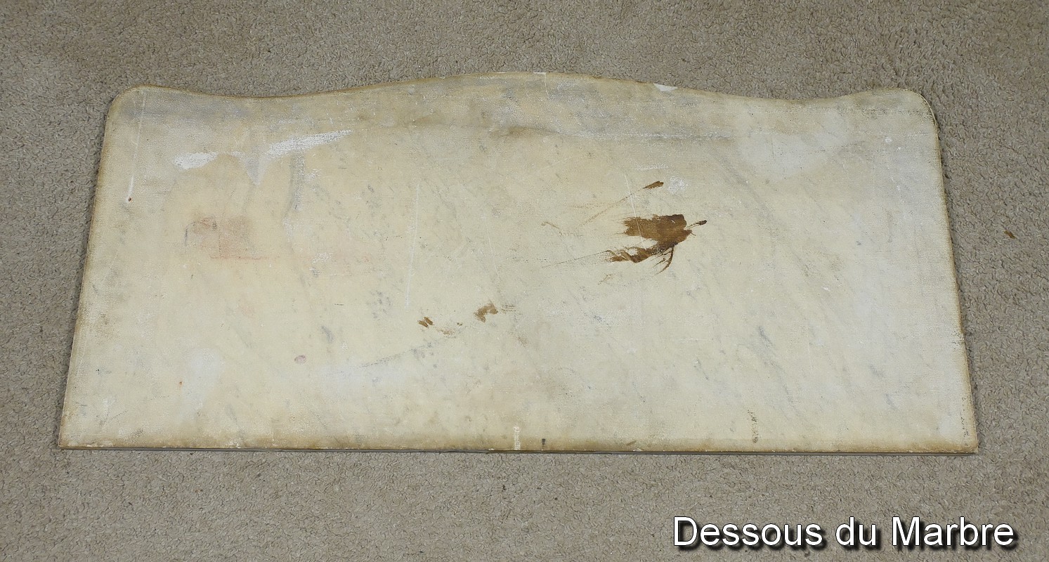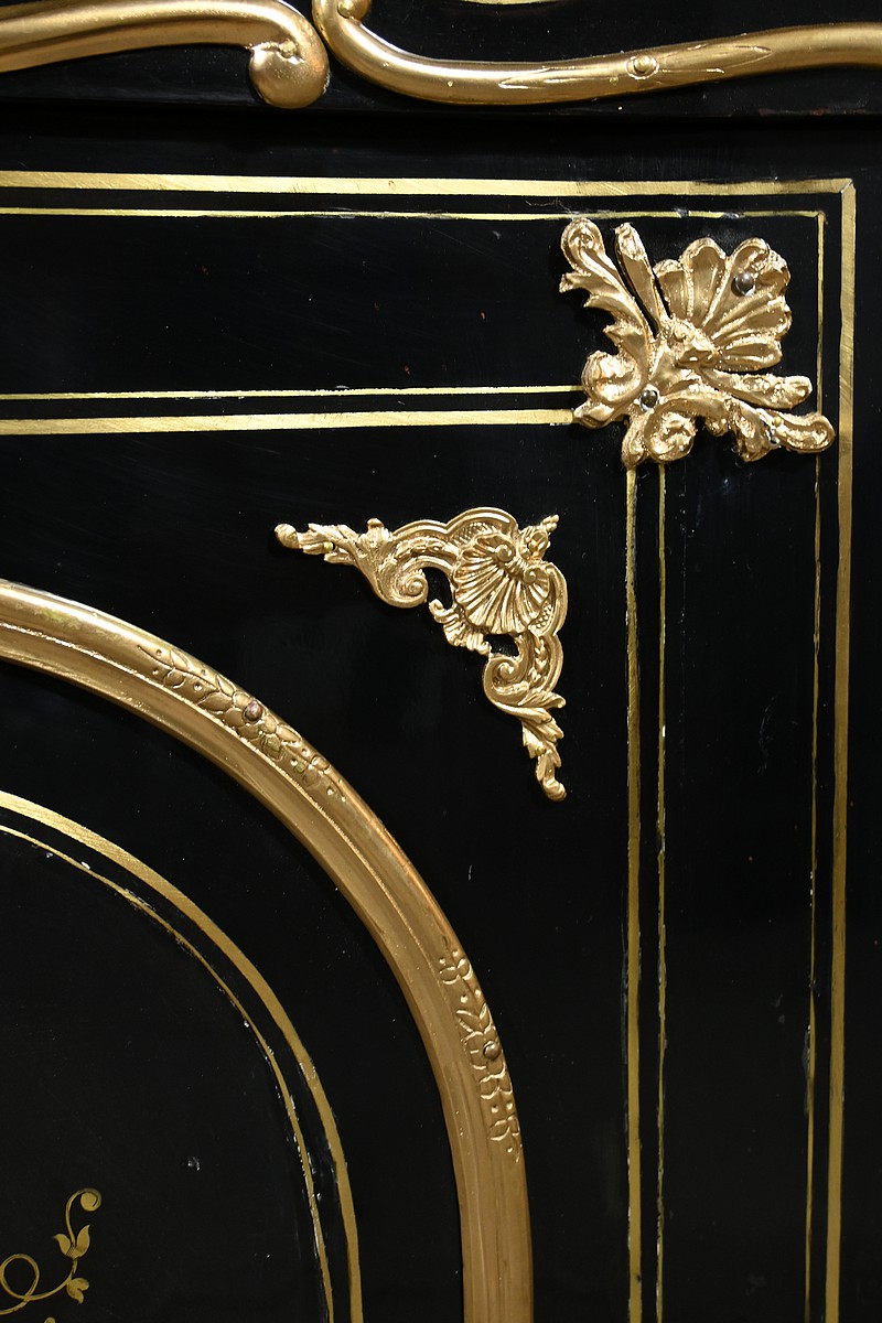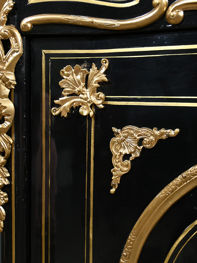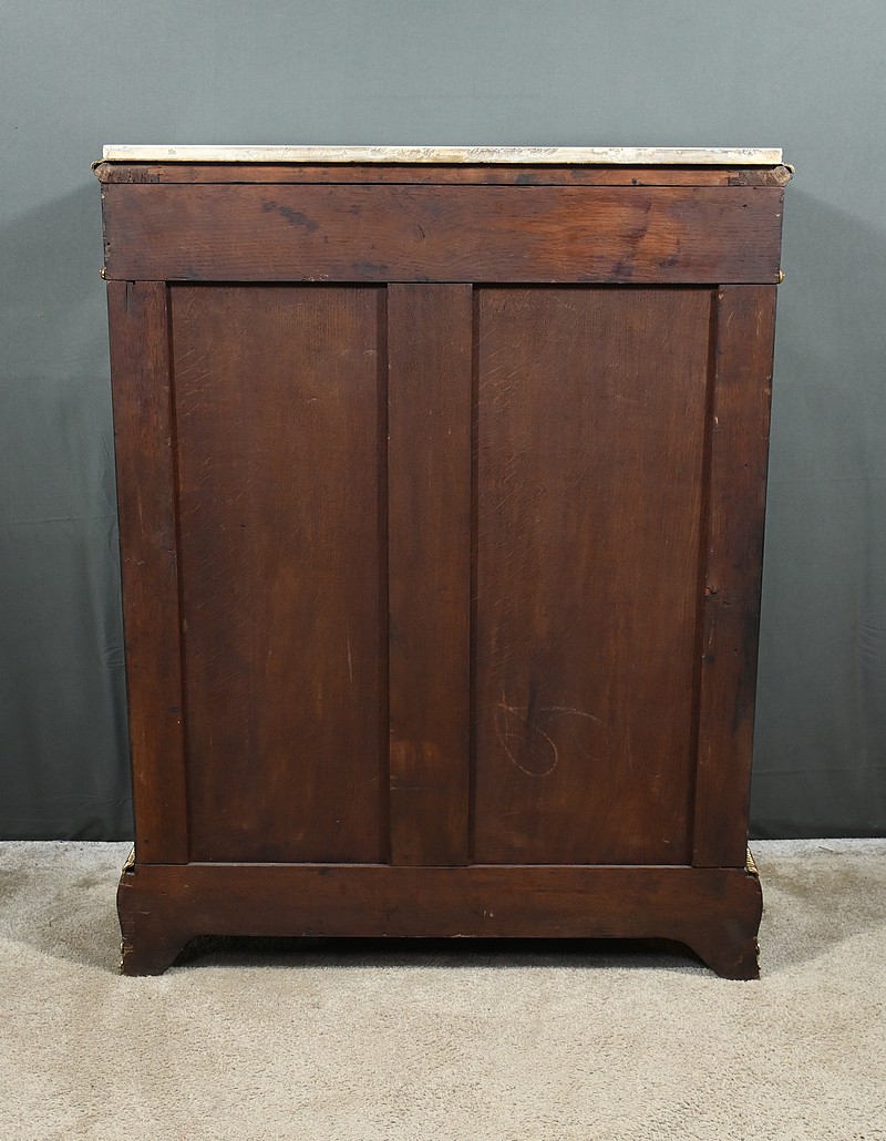 Il s’ouvre par une porte à encadrement, ornée d’une belle composition de laiton ciselé formant rubans, guirlandes de fleurs et feuilles d’acanthe entourant un vase. Celle-ci est entourée de filets de laiton incrustés et d’une arche en bronze festonné. Cette porte est dotée d’une clé ouvragée accompagnant la serrure d’origine en état de fonctionnement. De chaque côté de ce meuble, les montants sont dotés de chutes en bronze doré. En partie basse, des baguettes godronnées en bronze font le pourtour du meuble en décrochement. L’ensemble repose sur quatre pieds volutés. La partie supérieur de ce meuble d’appui est ornementée d’une frise florale entourée de filets de laiton incrustés. Au dessus, un marbre blanc de Carrare veiné de gris est encastré et ceint de lingotières bronze façonné.