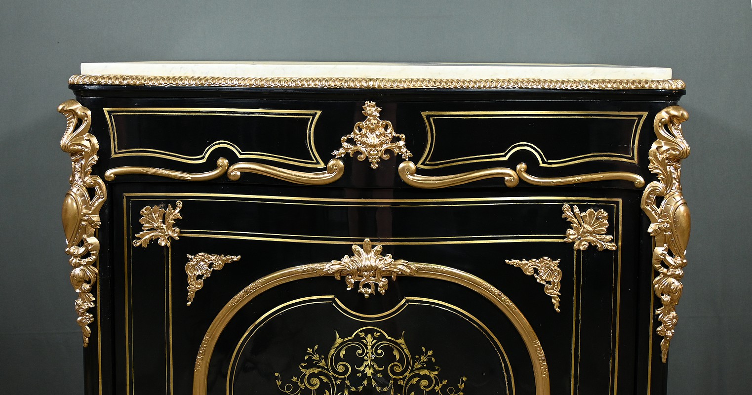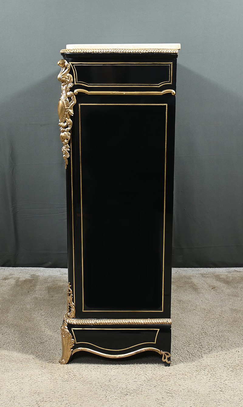 Élégant meuble d’appui Napoléon III en poirier noirci, sommé d’un marbre de Carrare, agrémenté d’ornementations en bronze doré et incrusté de laiton ciselé à motifs de rinceaux, de feuillage, de fleurs et de rubans.