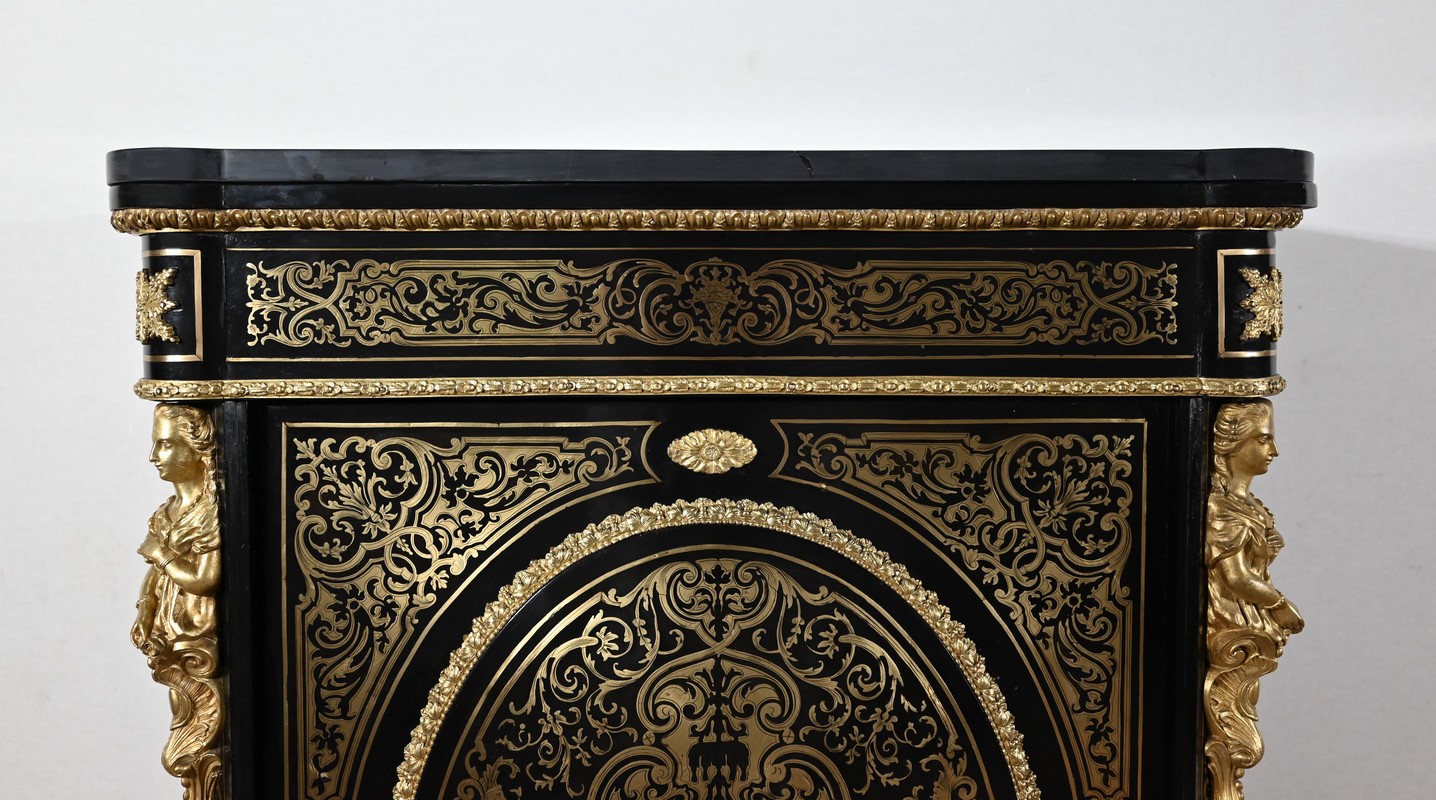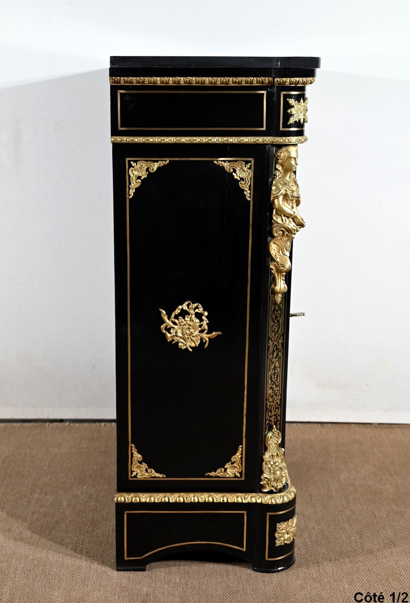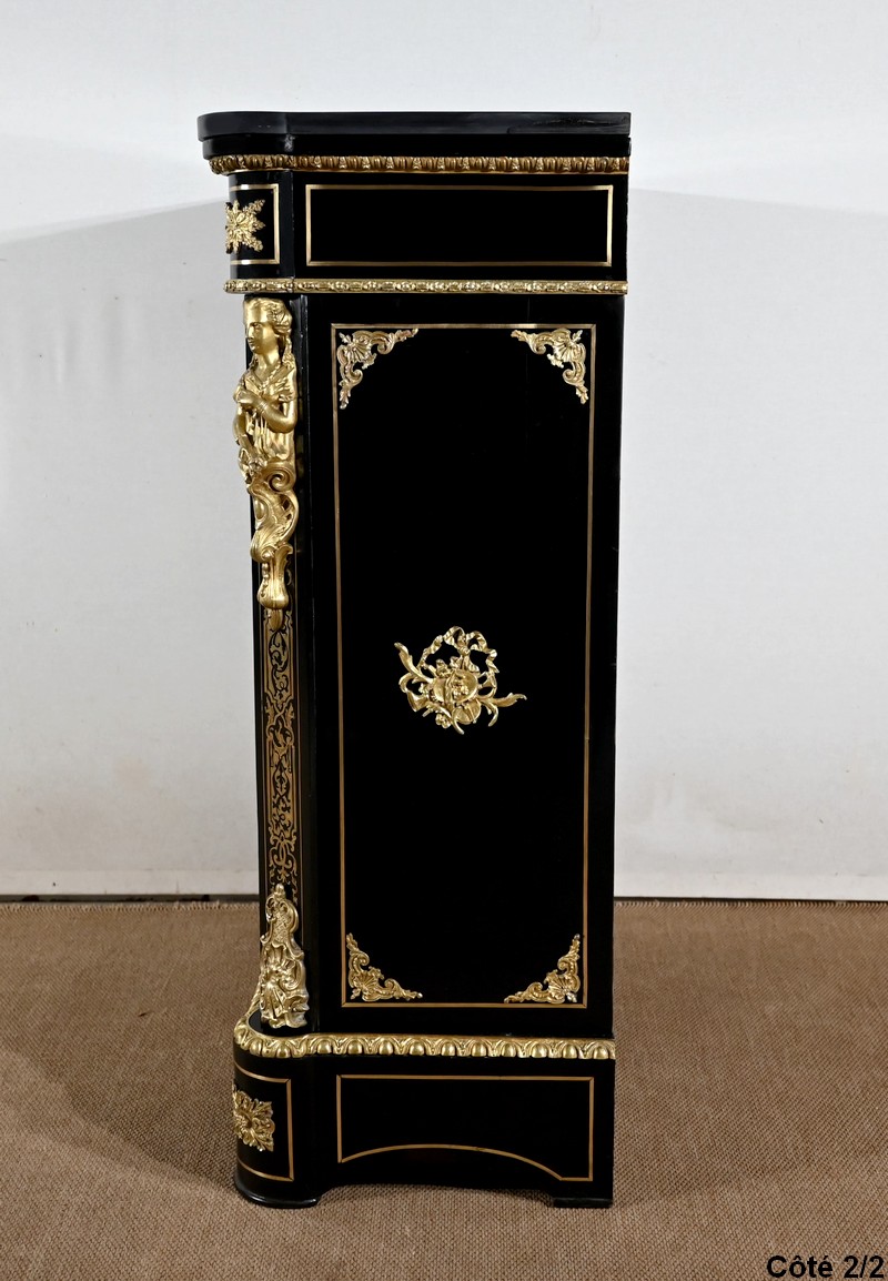 Élégant meuble d’appui, en poirier noirci, sommé d’un marbre noir et incrusté de laiton ciselé à motifs de rinceaux, de feuillage, de papillons et de créatures chimériques.