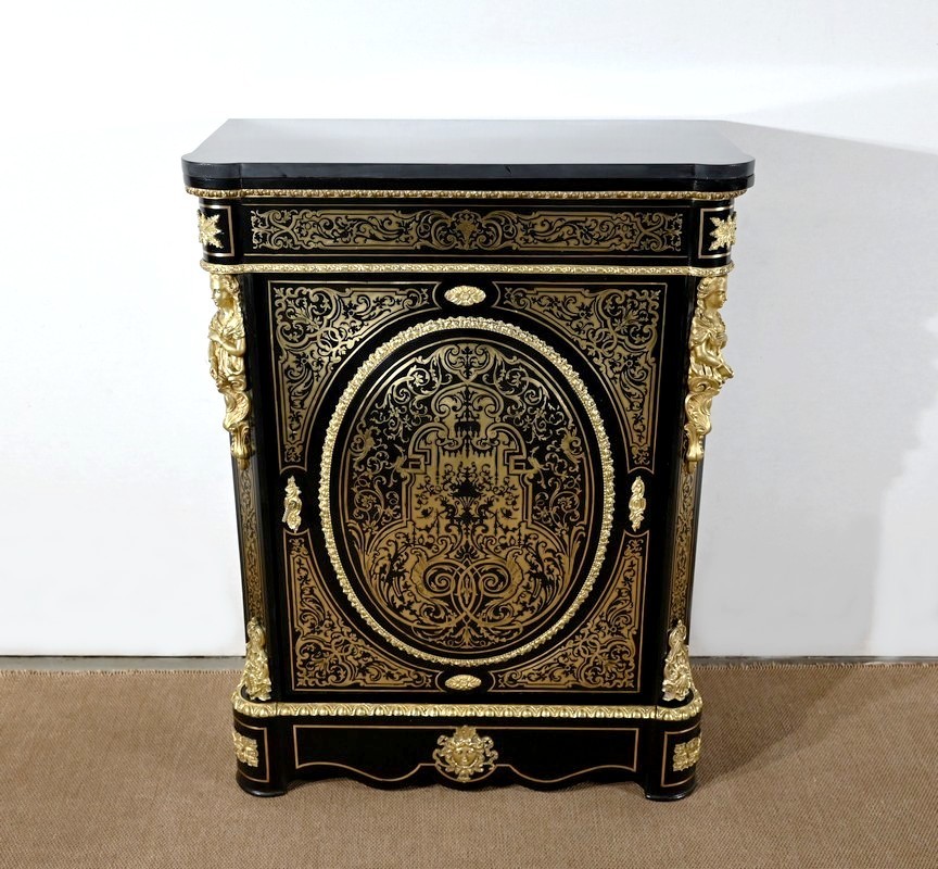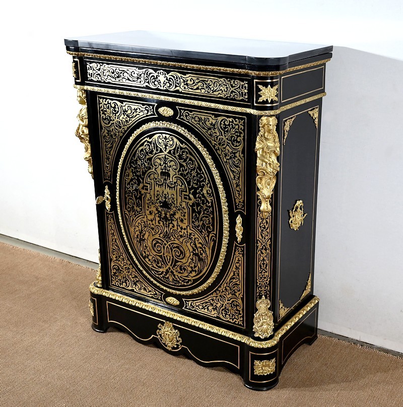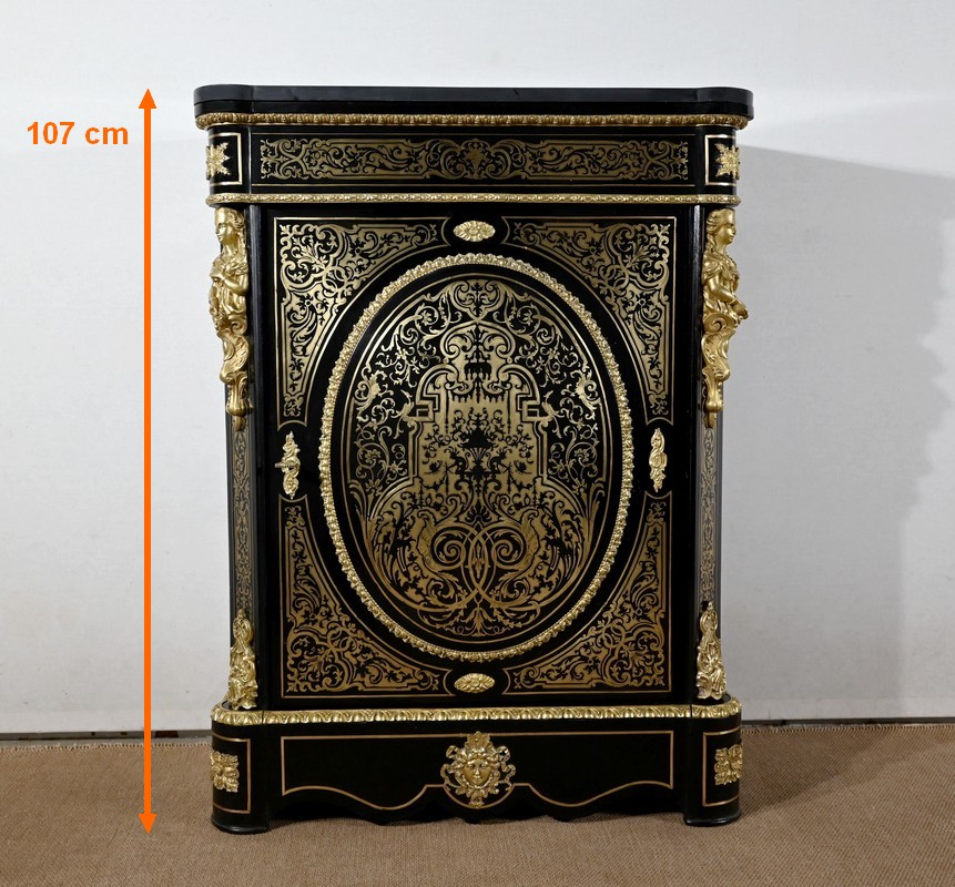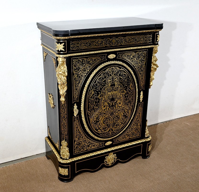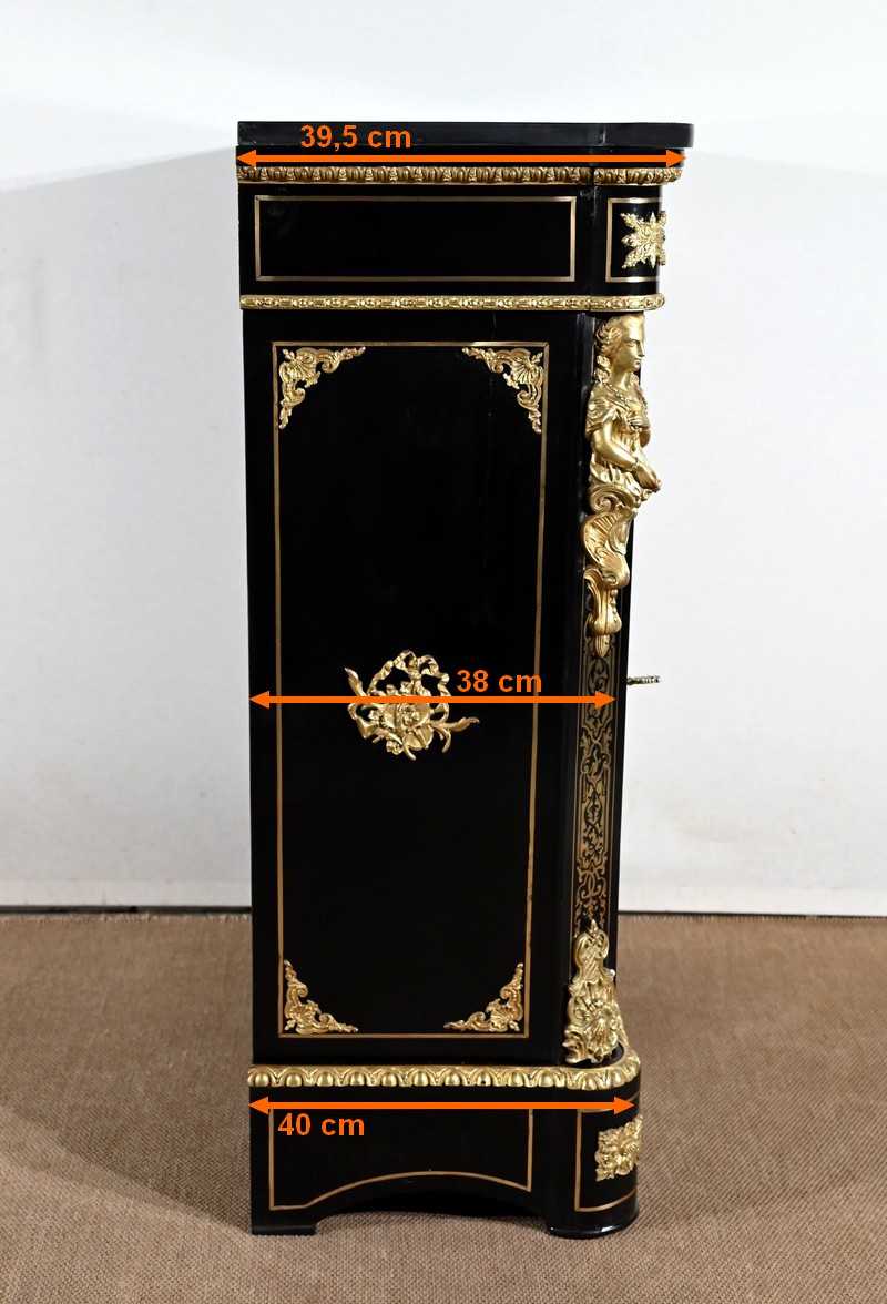 Élégant meuble d’appui, en poirier noirci, sommé d’un marbre noir et incrusté de laiton ciselé à motifs de rinceaux, de feuillage, de papillons et de créatures chimériques.