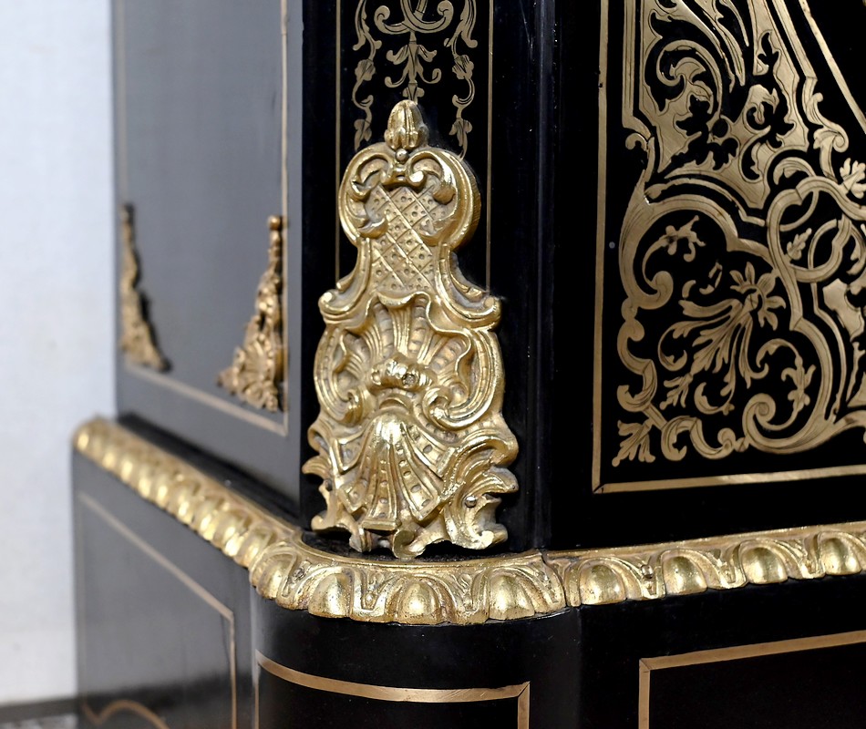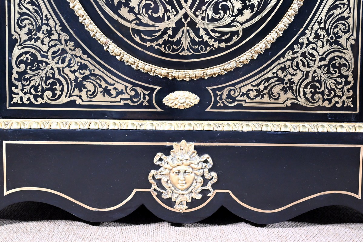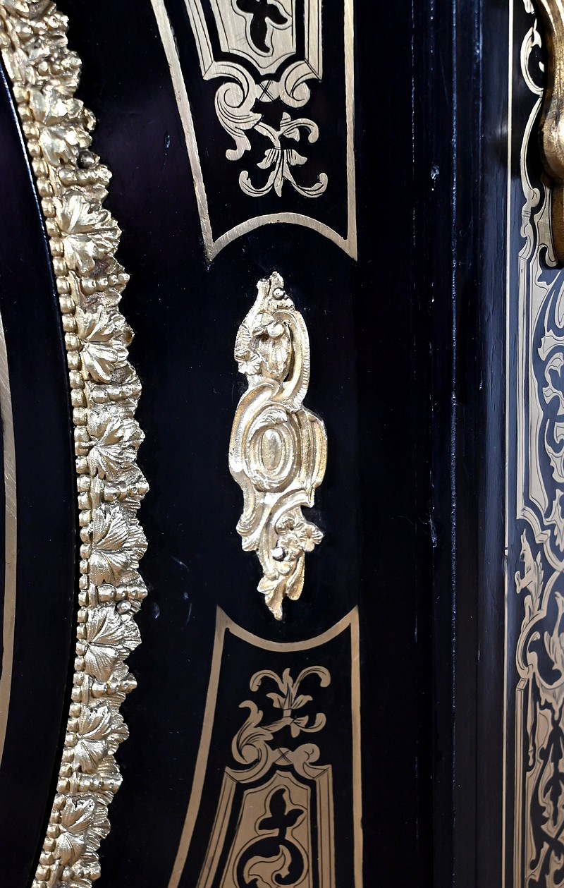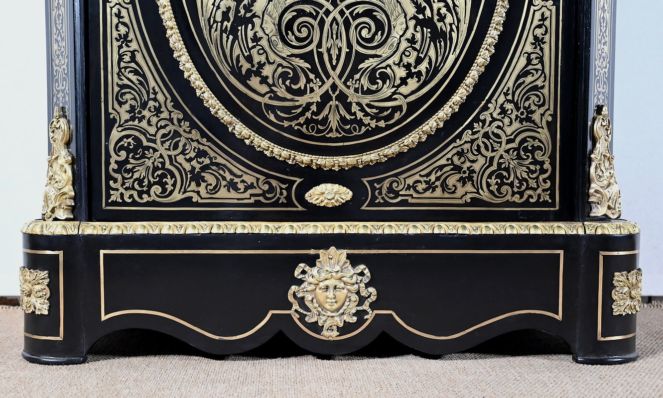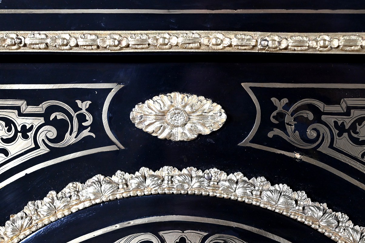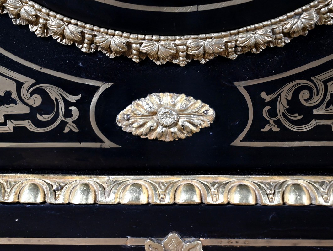 Également à incrustations de laiton, la ceinture est soulignée par des moulures festonnées, et les montants à pans coupés sont agrémentés de motifs, d’espagnolettes et de chutes.