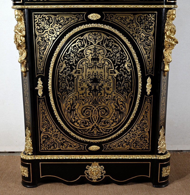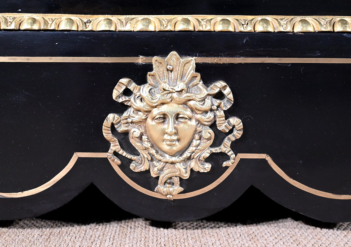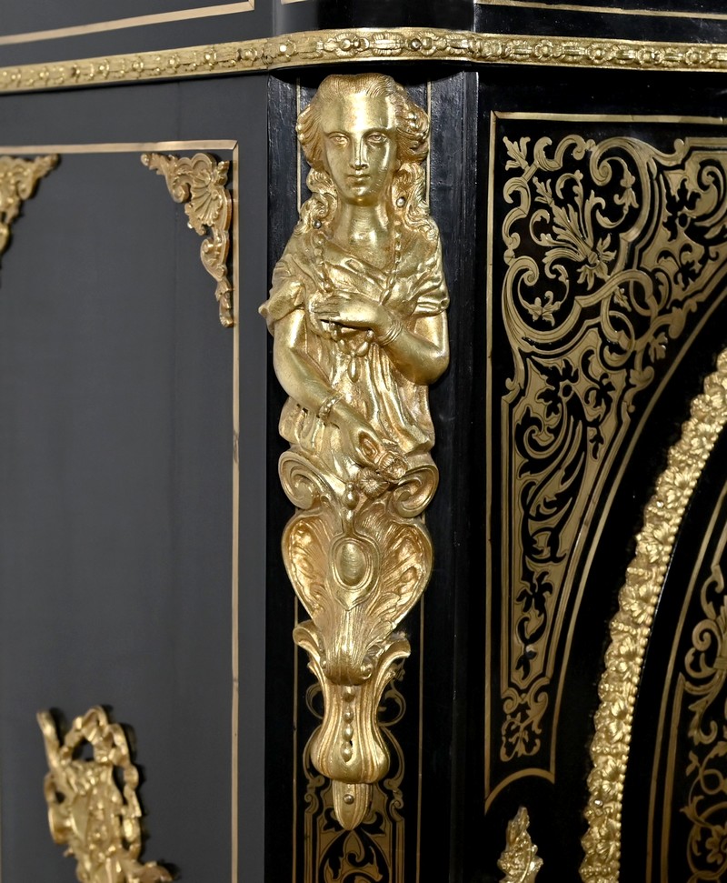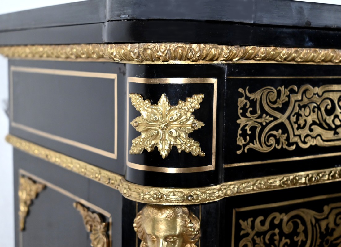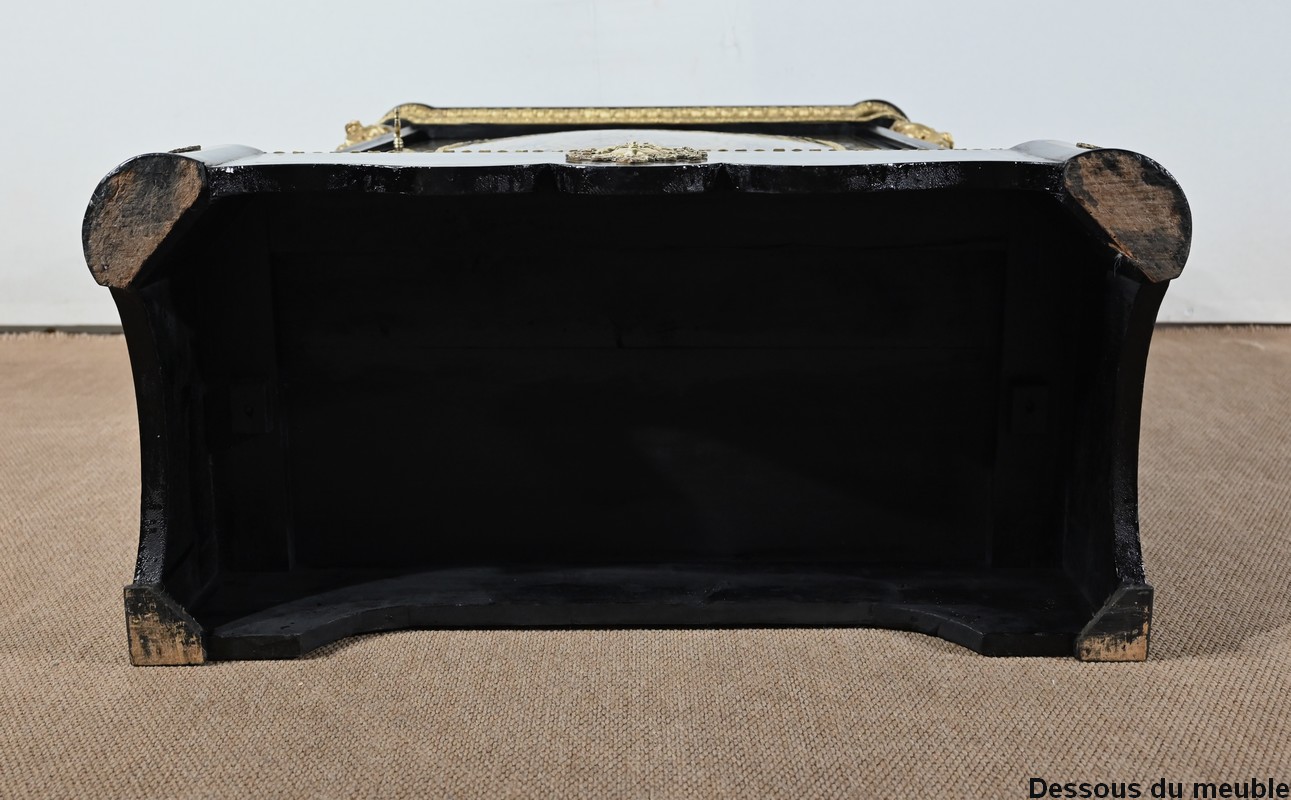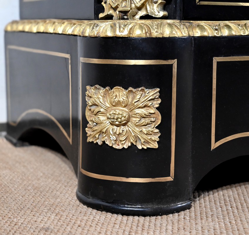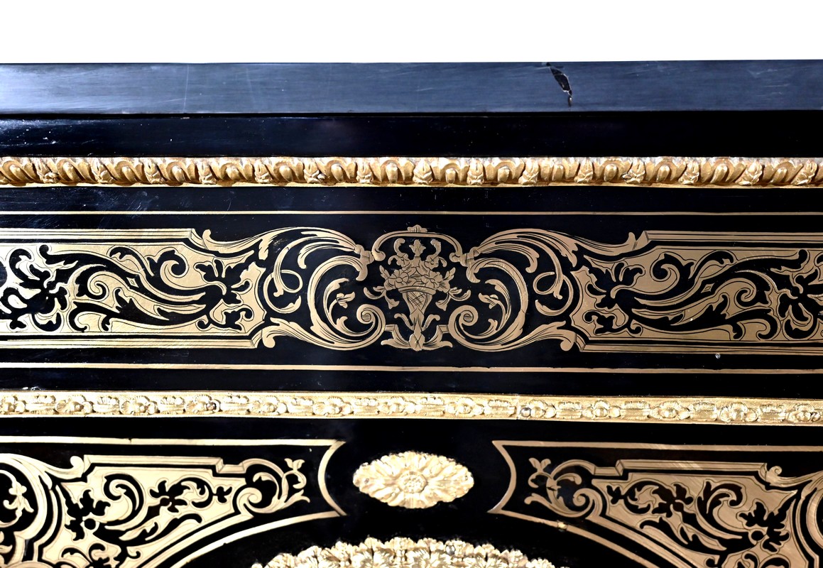 Également à incrustations de laiton, la ceinture est soulignée par des moulures festonnées, et les montants à pans coupés sont agrémentés de motifs, d’espagnolettes et de chutes.