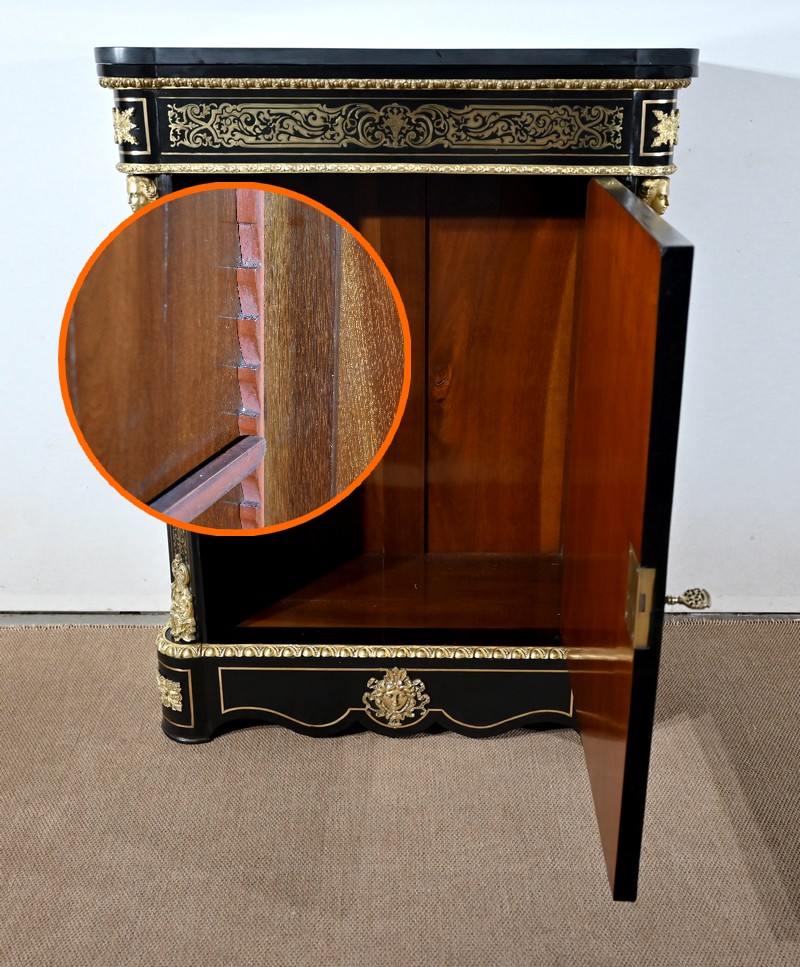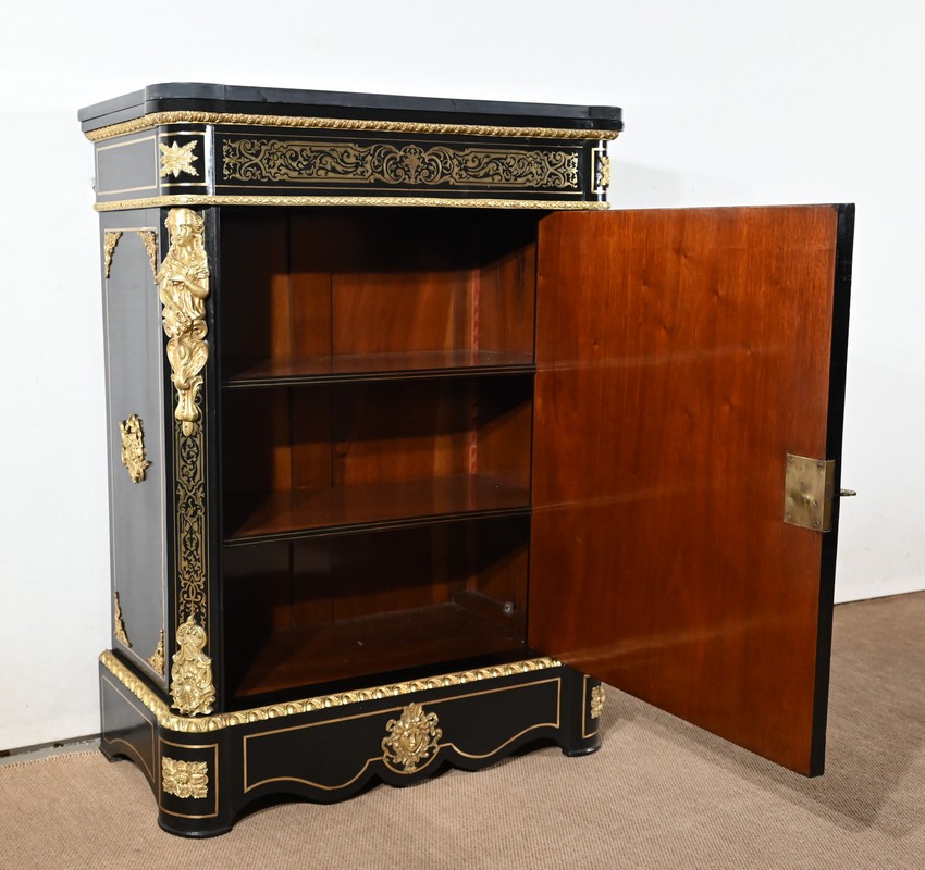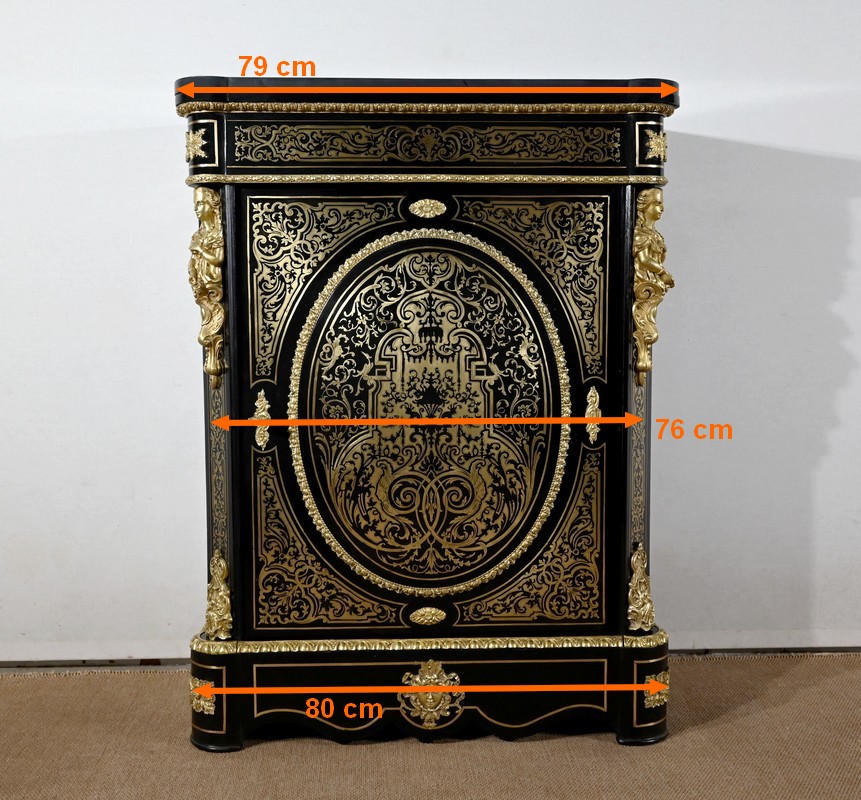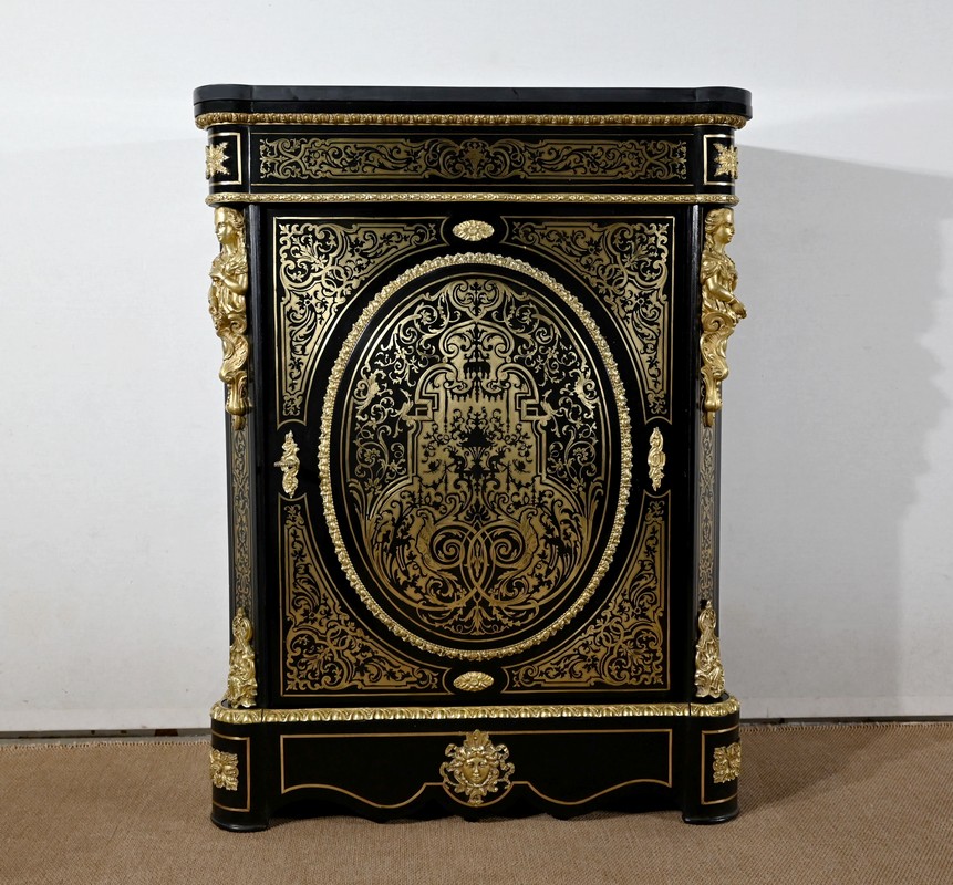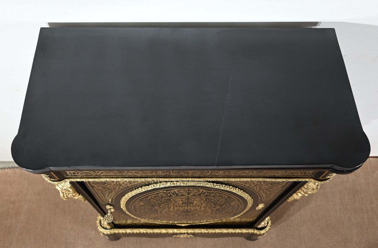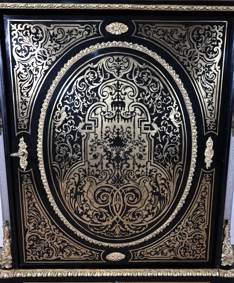 Il s’ouvre par une porte, se tirant par la droite, ornée de motifs et munie d’une serrure d’origine en état de fonctionnement avec clé et entrée. Le panneau central bombé, de forme ovale, est entouré par une moulure en bronze à décors de fleurs et d’un perlé.