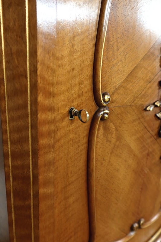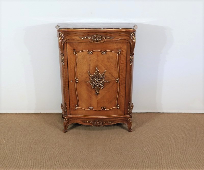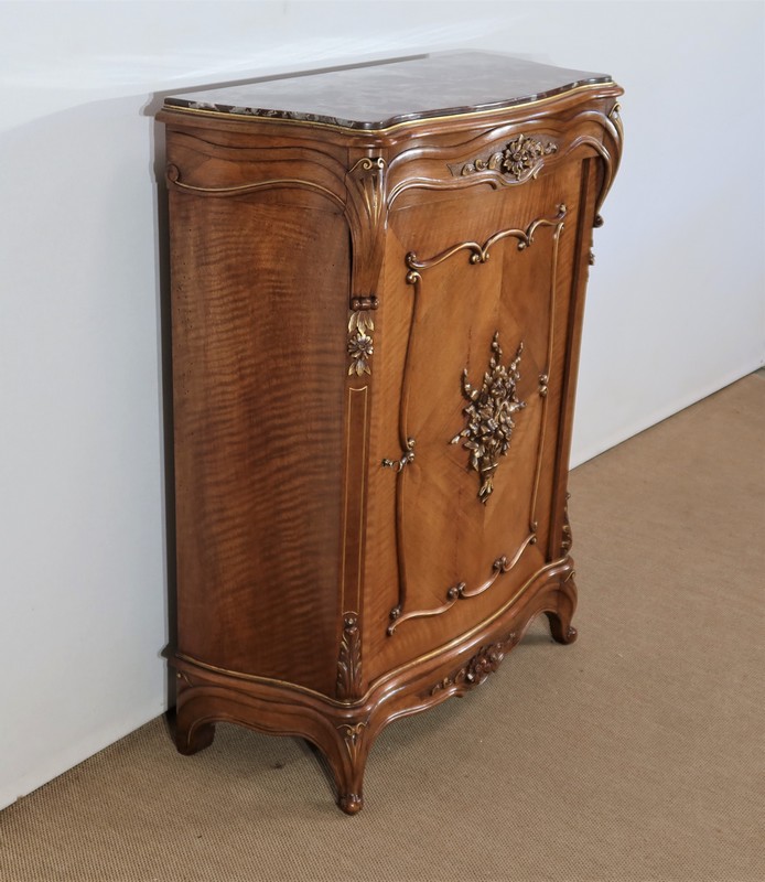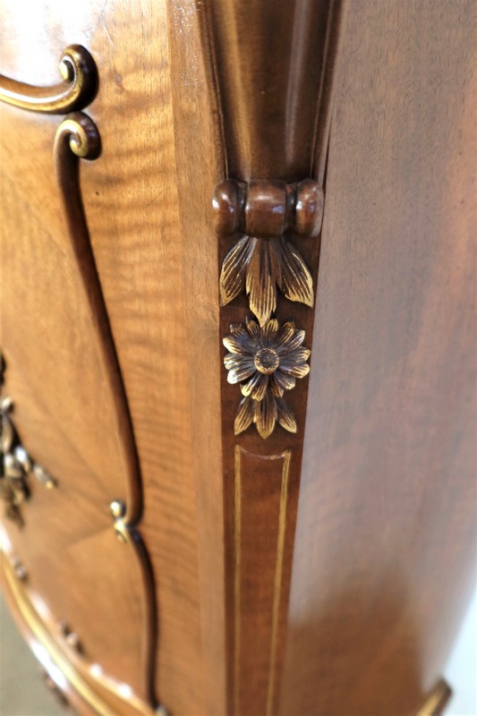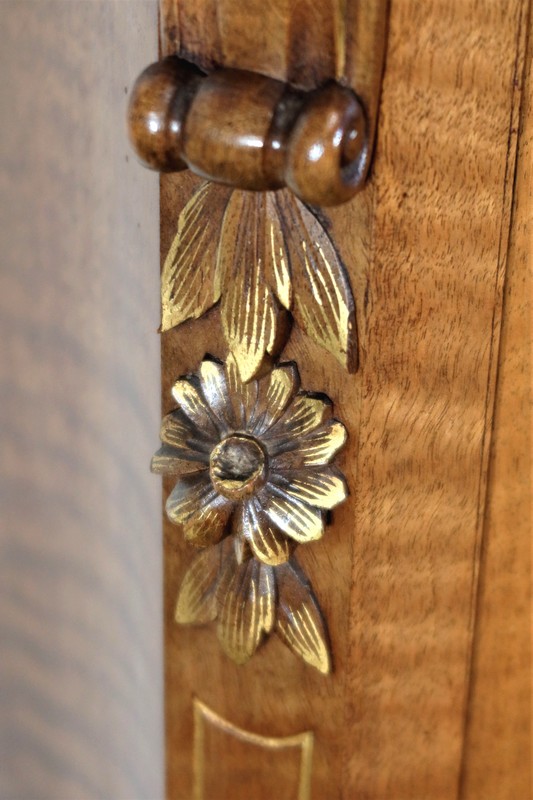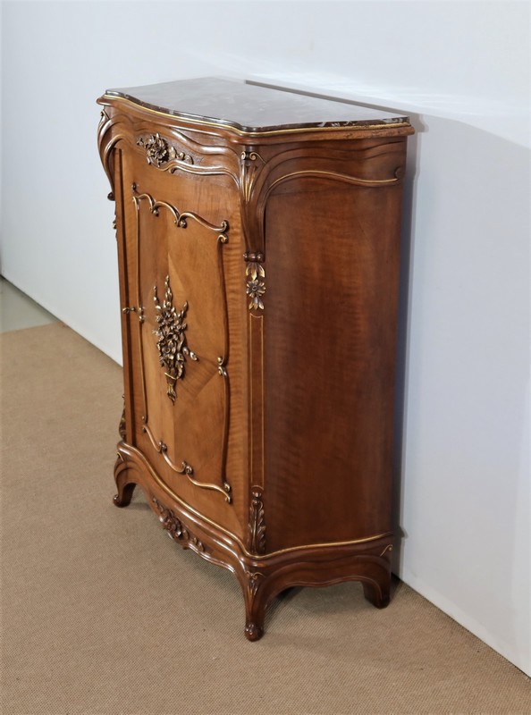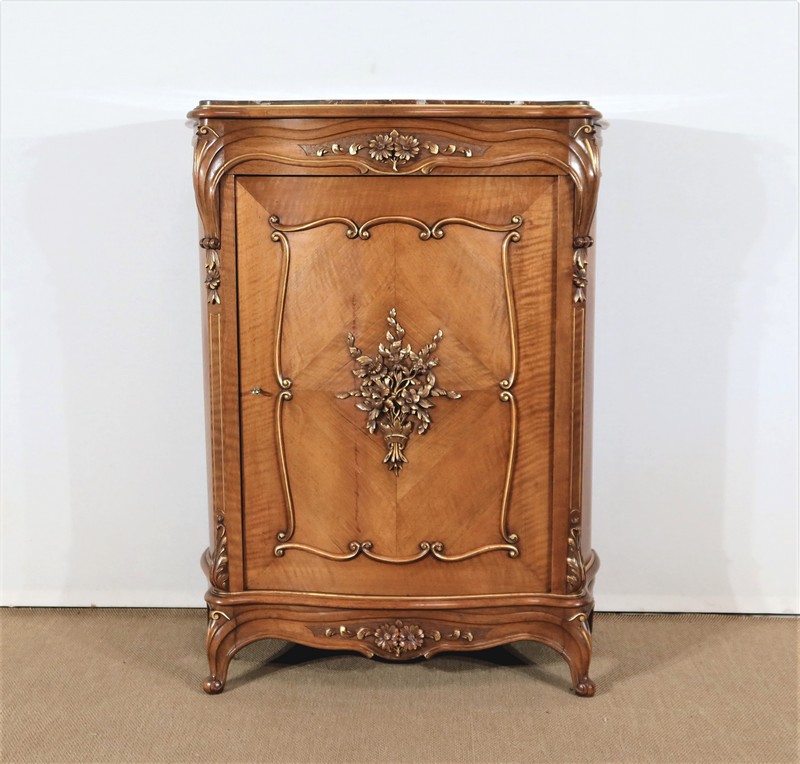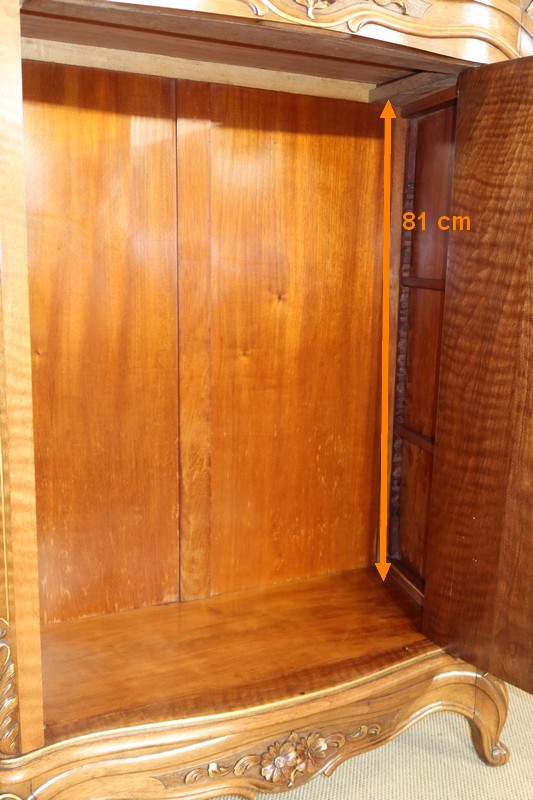 La porte, en placage de noyer, est légèrement cintrée. Son encadrement est réalisé à coupe d’onglet dans le pourtour et en bois de fil. Le centre de cet ouvrant est constitué d’un placage en quatre feuilles et doté d’une moulure demi-ronde en applique à découpe et volute. Un important motif représentant un bouquet de fleurs et de feuillages y est très finement sculpté et légèrement doré en rappel.