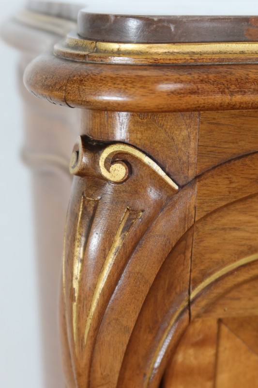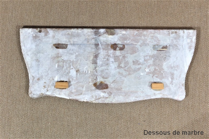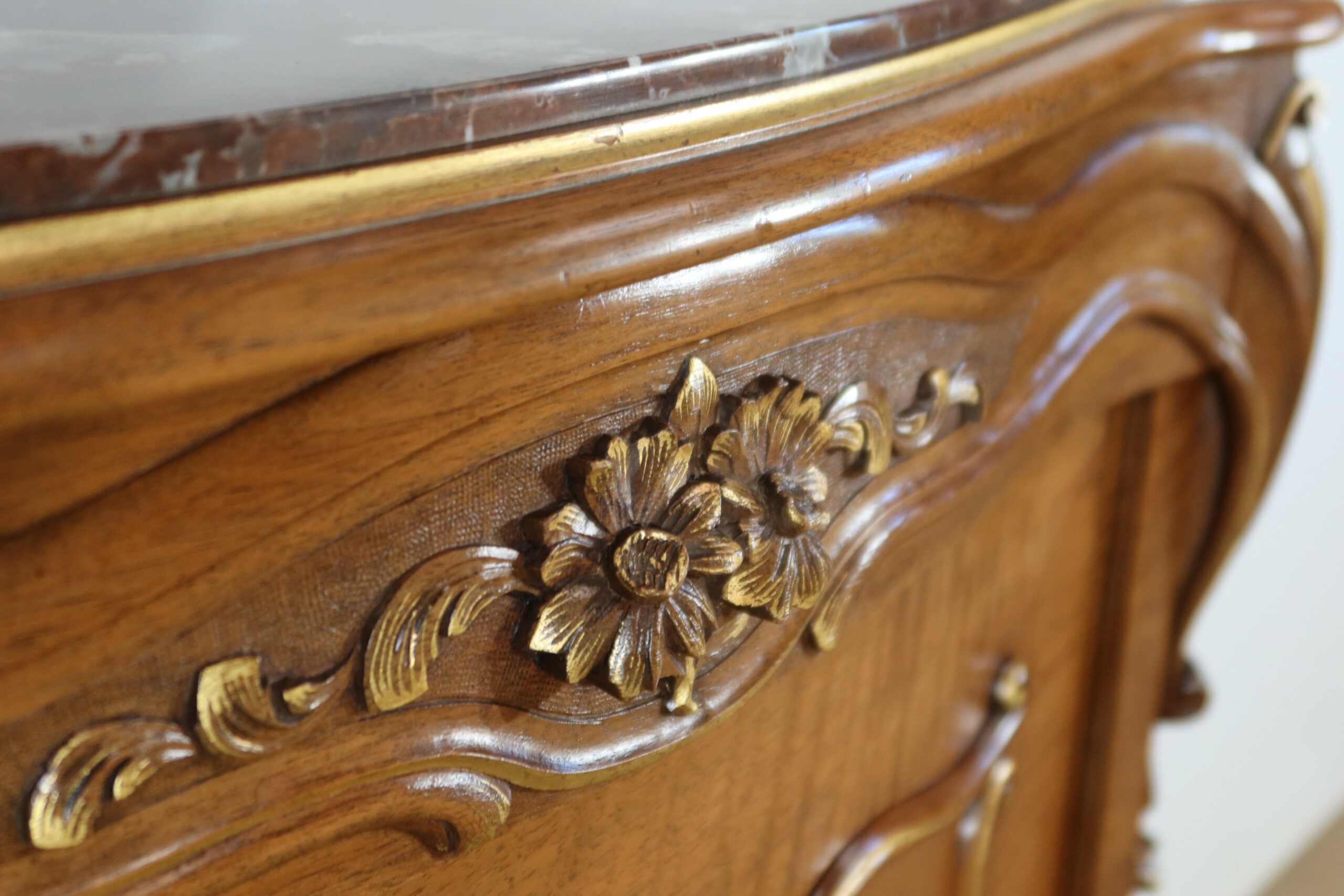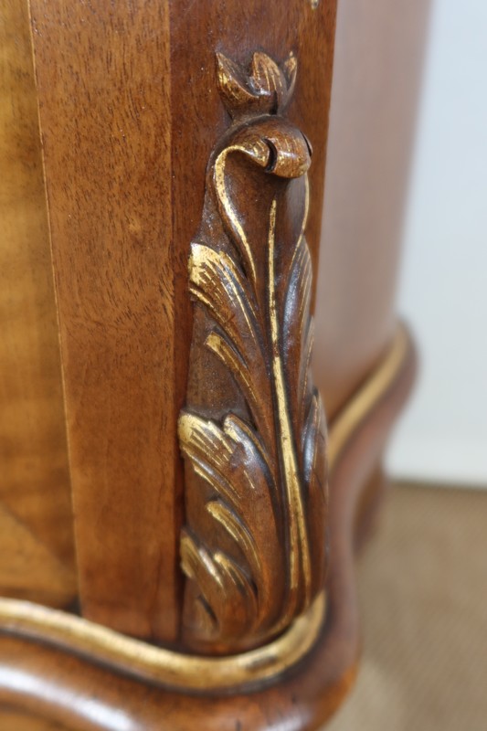 En dessous, une ceinture en noyer massif est munie d’un tiroir se fondant dans celle-ci. Une importante moulure à gorge orne la face avant de cet élément, dégageant au centre un motif de fleurs et de feuillages en relief, doré sur fond granité. De chaque coté de cette ceinture à tiroirs se profile, en partie basse, deux importantes consoles à volute légèrement dorées elles aussi. Ces éléments se prolongent sur un pied à pan coupé, se terminant par un motif de feuilles d’acanthe sculptées.