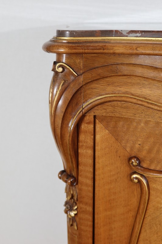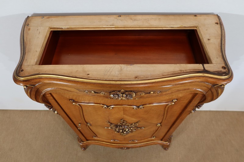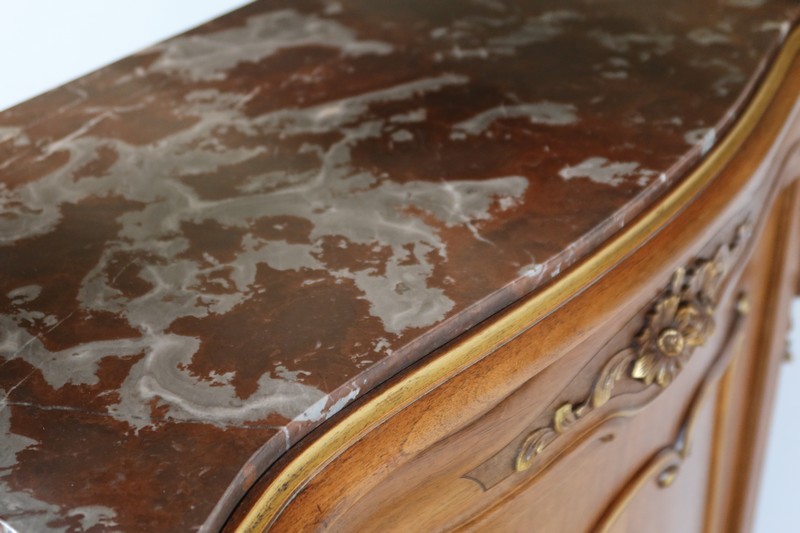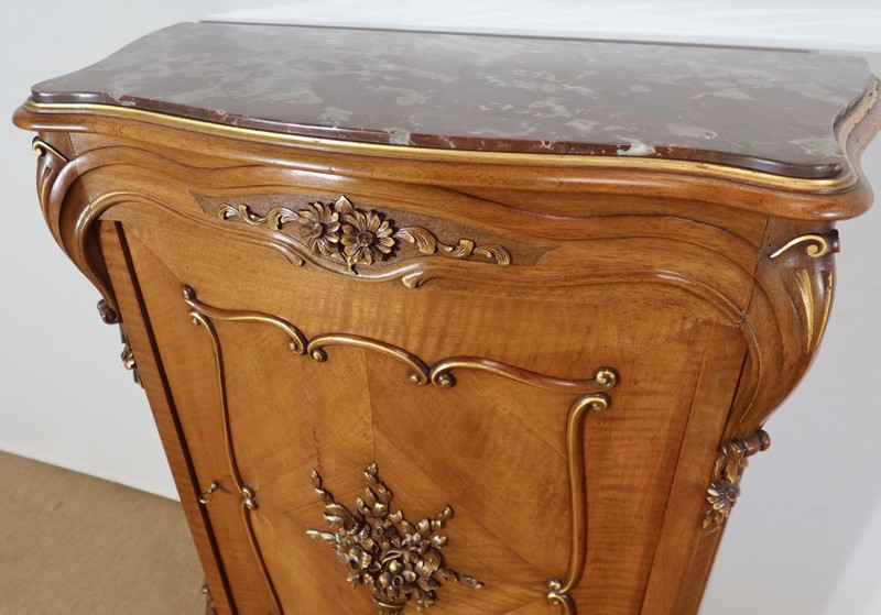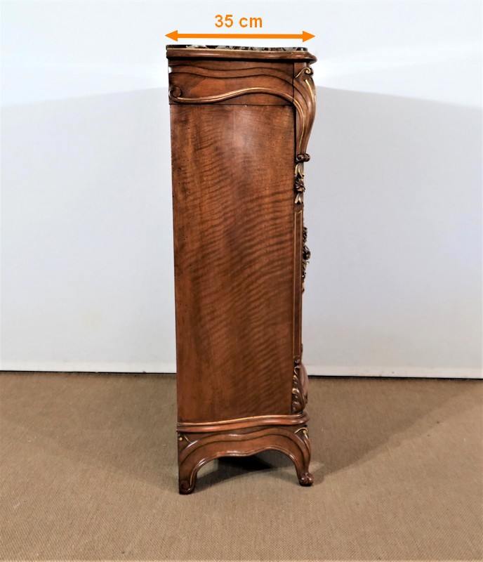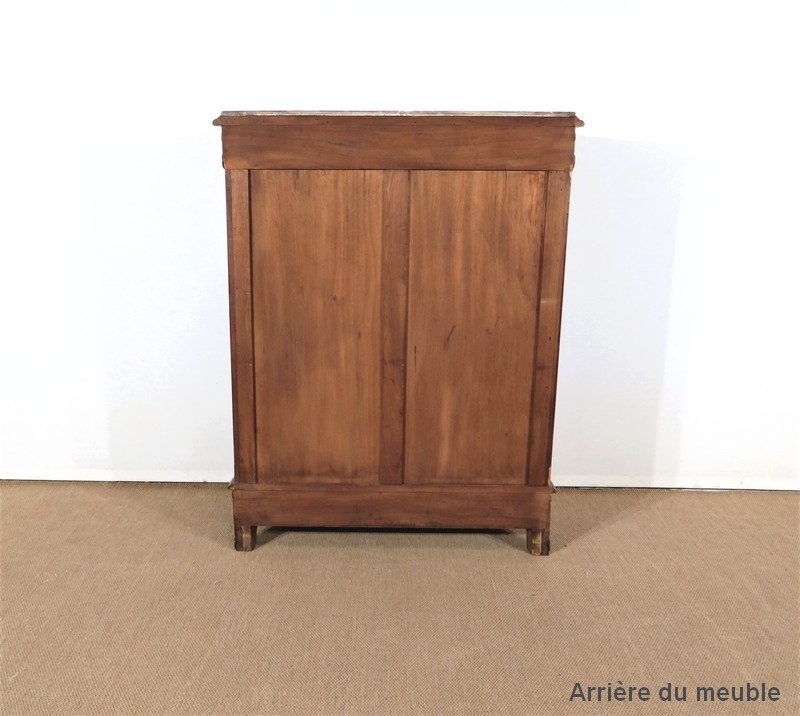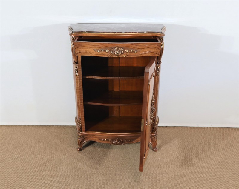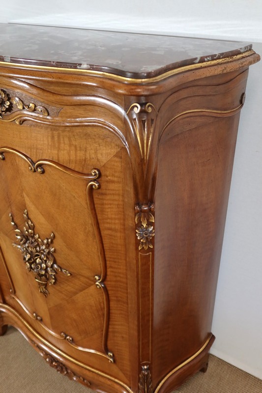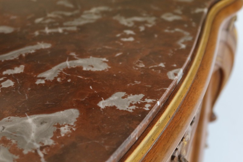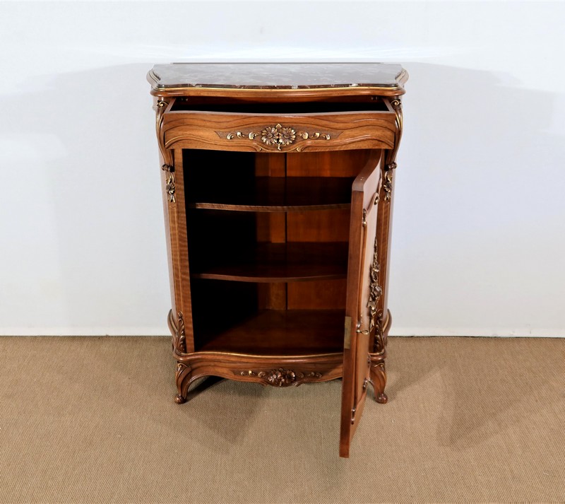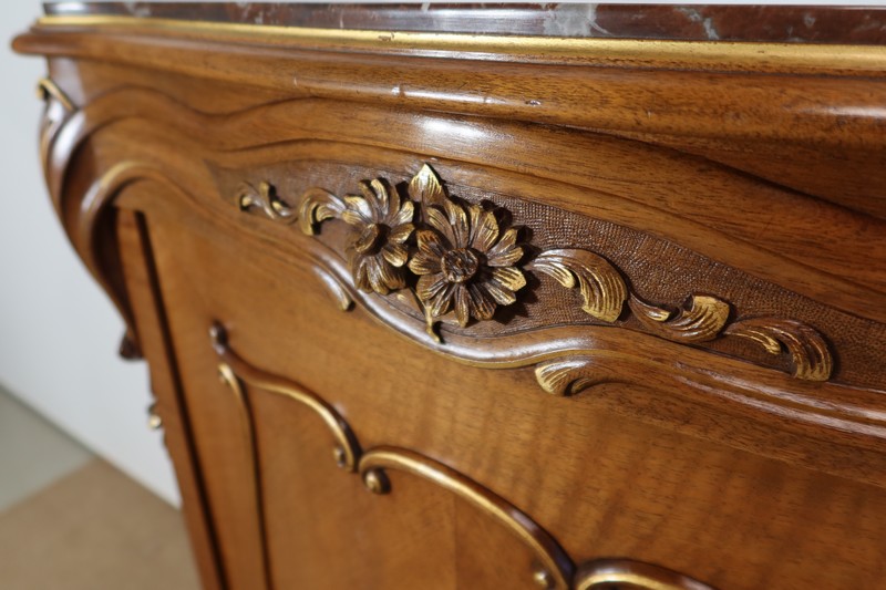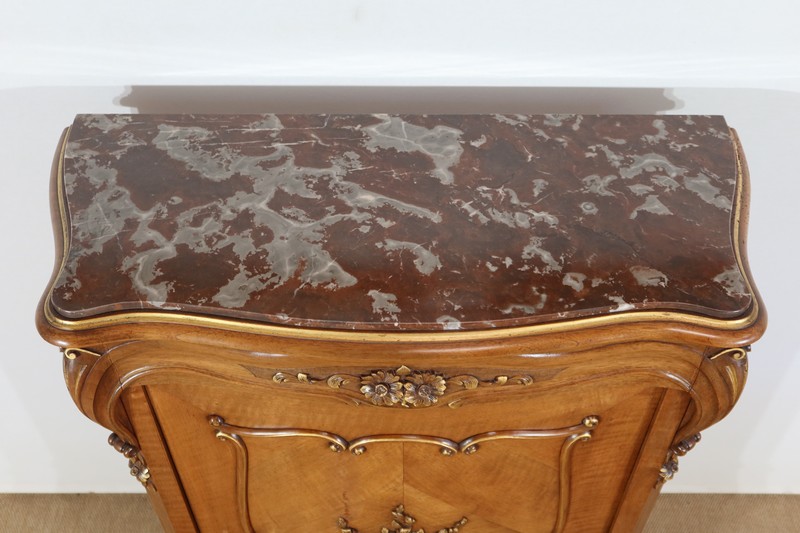 Ce meuble d’entre deux est doté d’un dessus en marbre rouge des Pyrénées légèrement encastré. Le pourtour est composé d’un bec de corbin et d’une gorge en noyer massif.