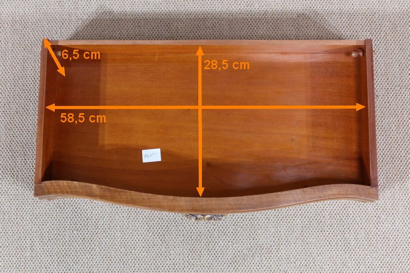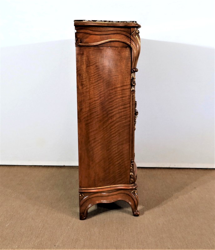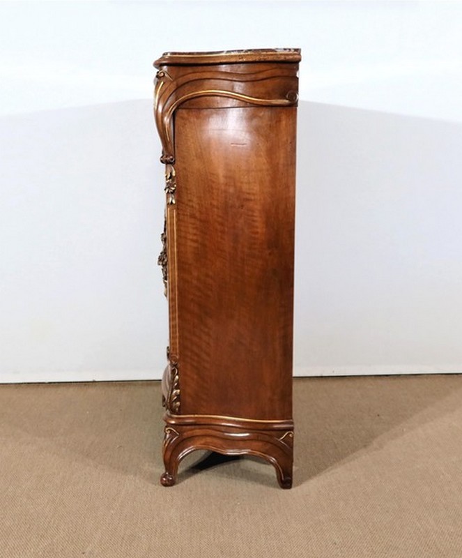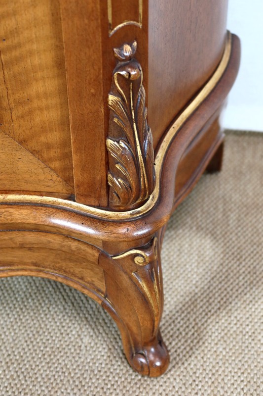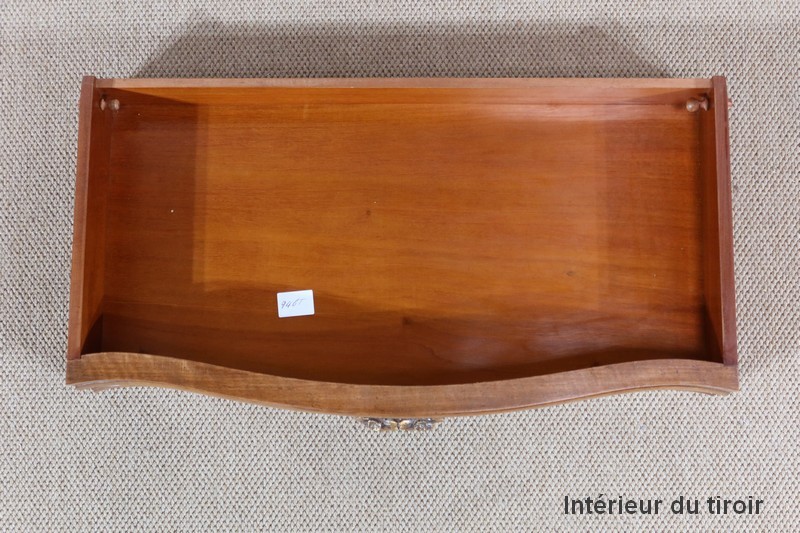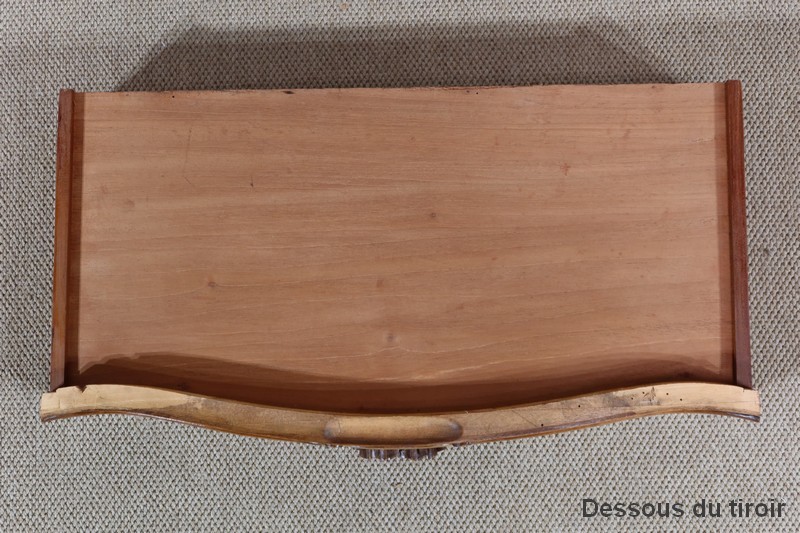 Épousant les lignes du meuble, les cotés également galbés, ont en partie haute une ceinture dans le même goût que la façade et les mêmes moulurations en partie basse.