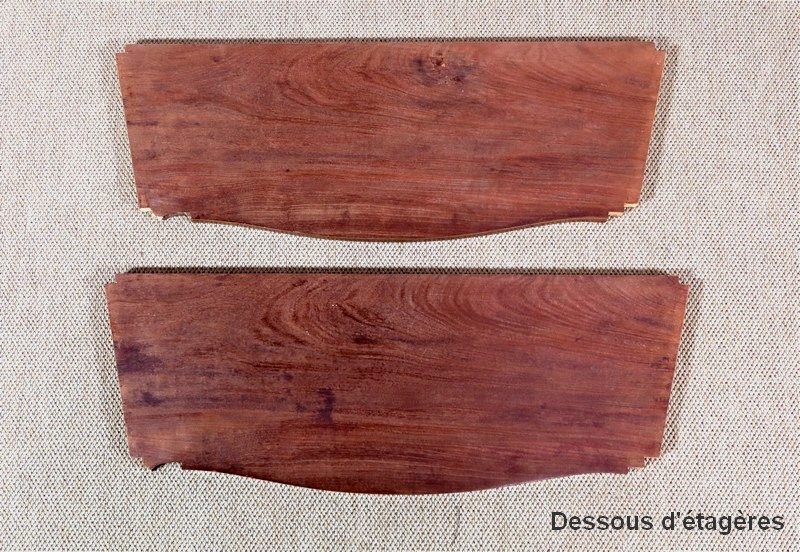 La partie basse de cet article est faite d’une traverse à découpe ayant le même motif en relief et la même moulure à gorge que la partie haute, cette dernière allant s’atténuer sur des pieds galbés à volute.