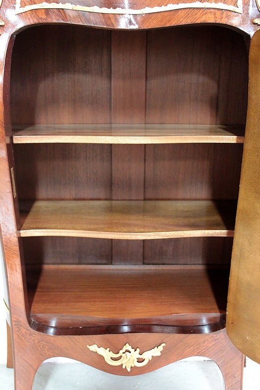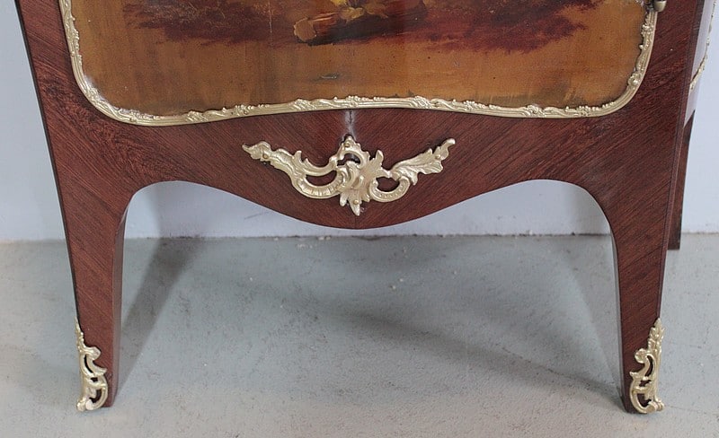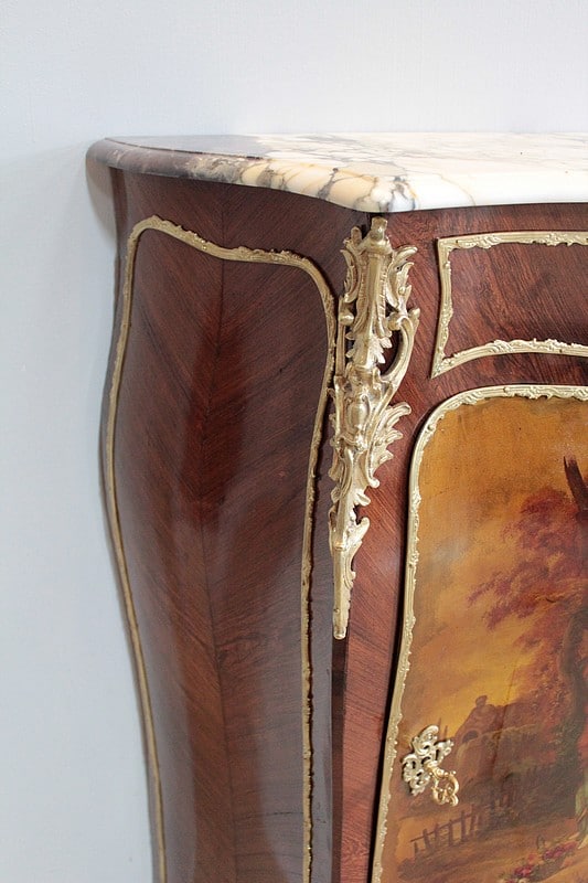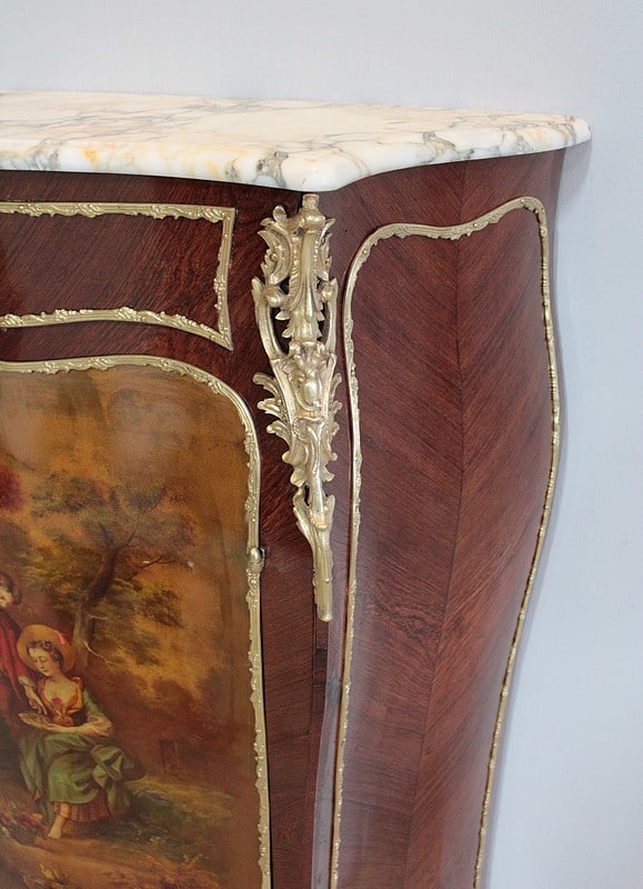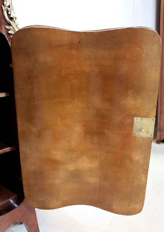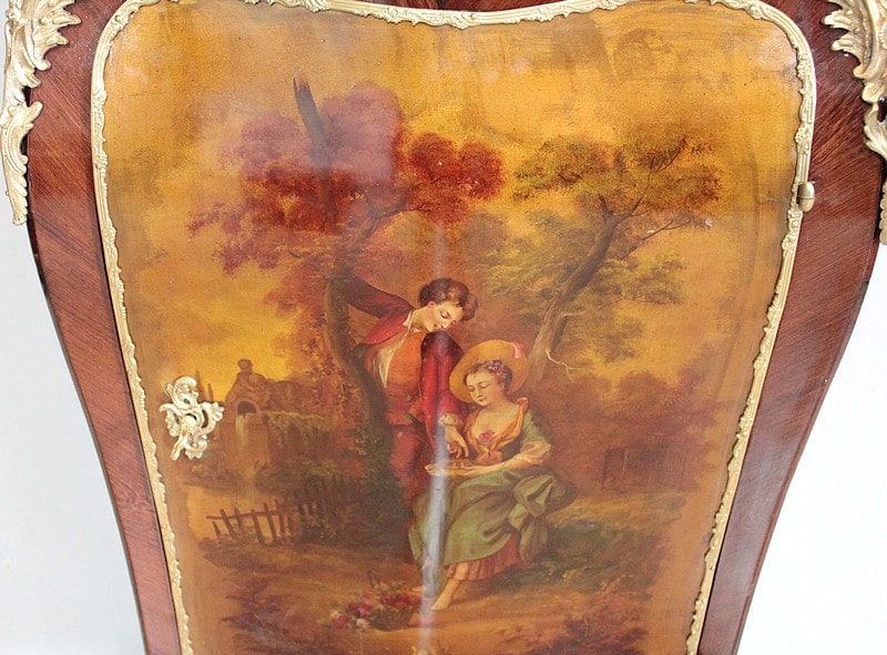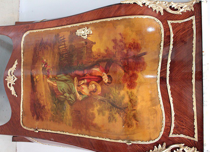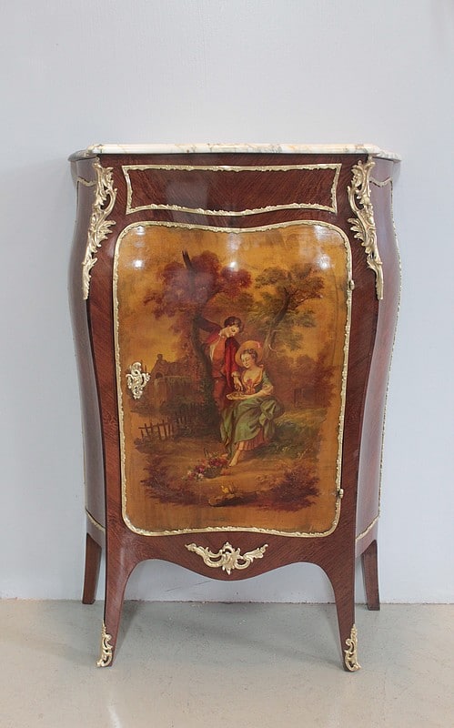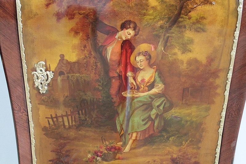Il ouvre par une porte peinte d’ une scène romantique représentant un couple dans un jardin. Elle est entourée d’une moulure en bronze et patinée d’un verni ‘Martin’.