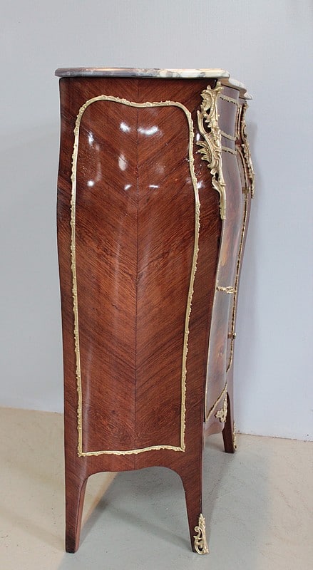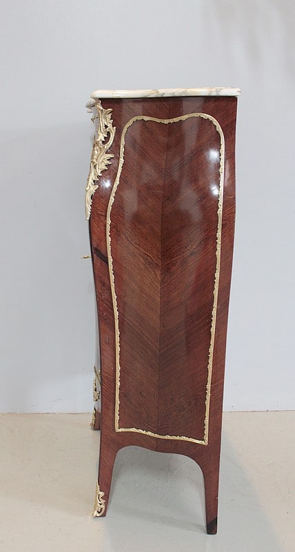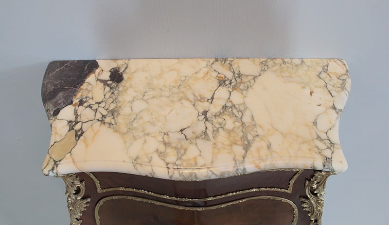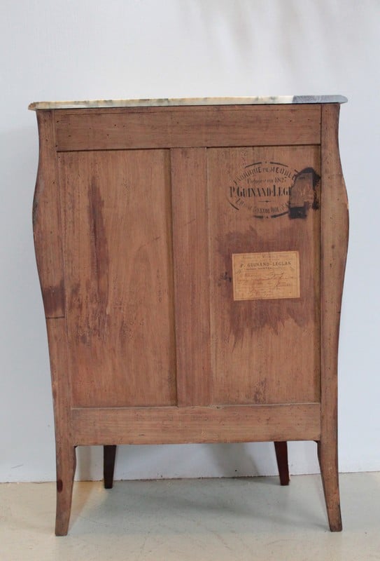 Meuble d’entre-deux de style Louis XV, façade galbée, en placage de bois de violette et dessus de marbre blanc veiné ‘Paonazo’ (Italie) du 19ème. Sous le marbre est apposé le pochoir du fabricant ‘P. GUINAND-LEGLAS à NANTES’