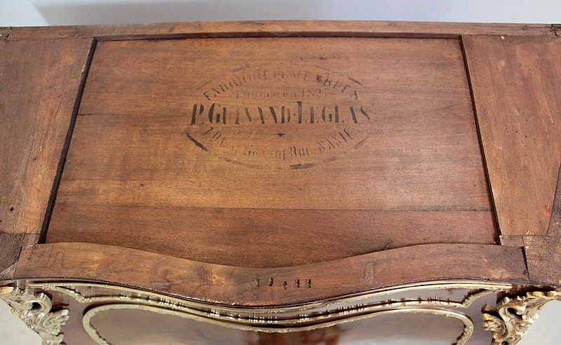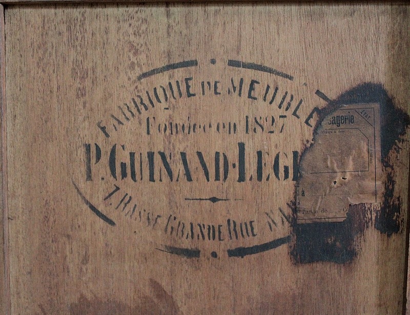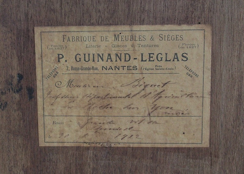 A l’arrière : pochoir et étiquette du fabricant : ‘Fabrique de Meubles et Sièges (fondée en 1827) P. GUINAND-LEGLAS 7, Basse-Grande-Rue NANTES (Près l’Eglise Ste Croix)’