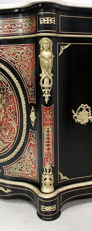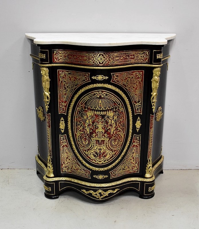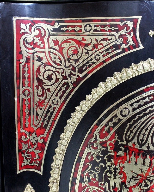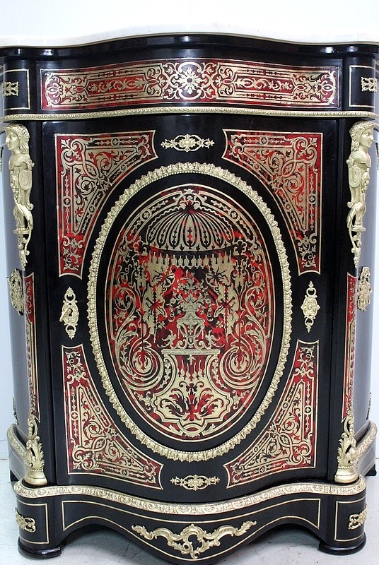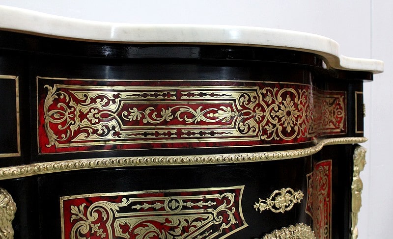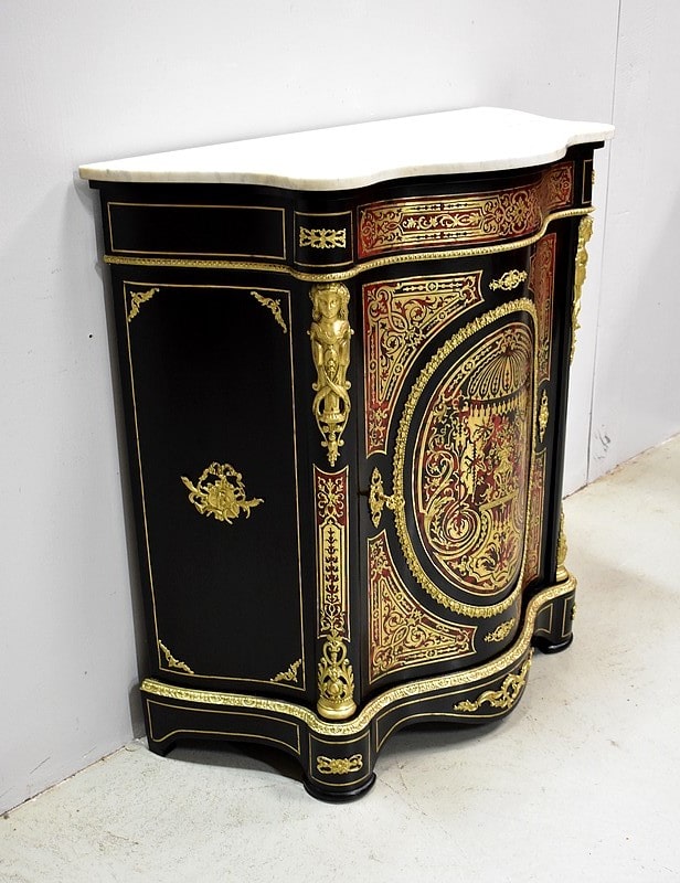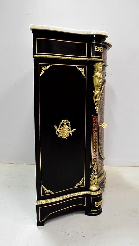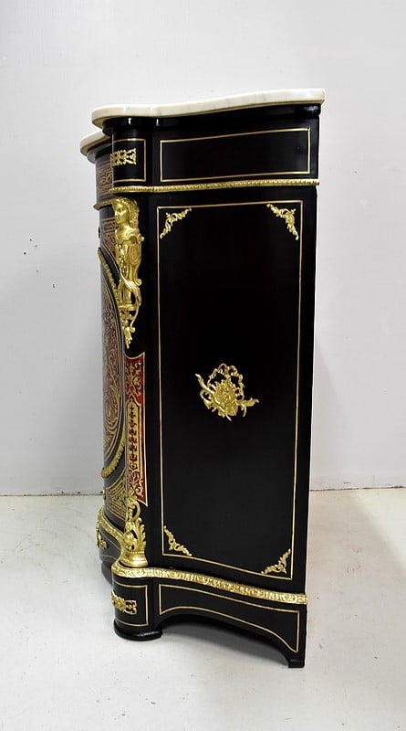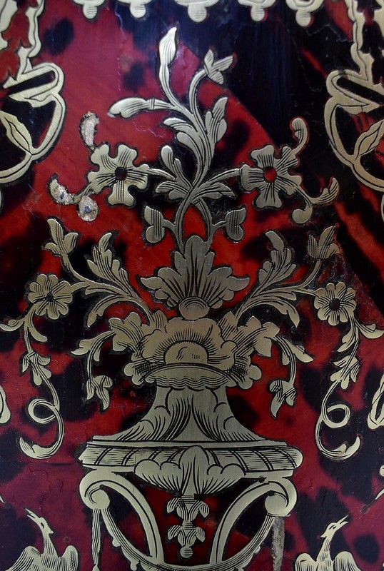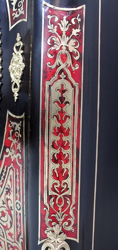 Meuble à hauteur d’appui en Marqueterie ‘Boulle’ d’Écailles de Tortue Rouges et de laiton découpé, sur fond de Poirier noirci.