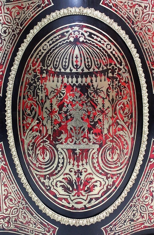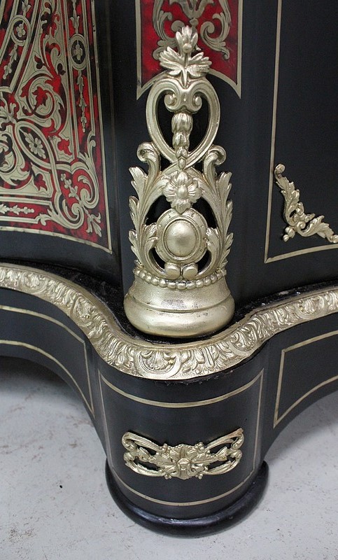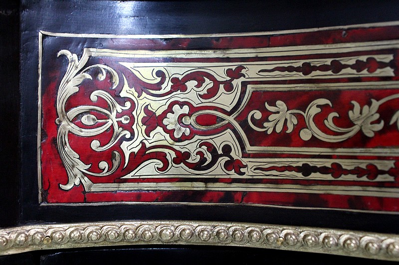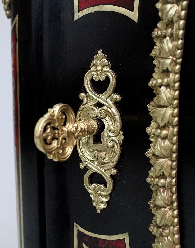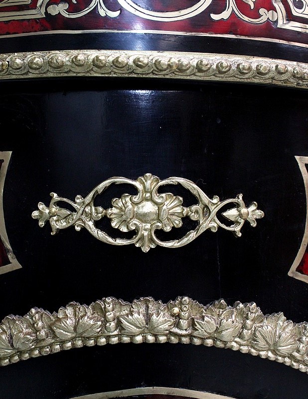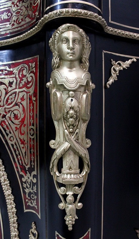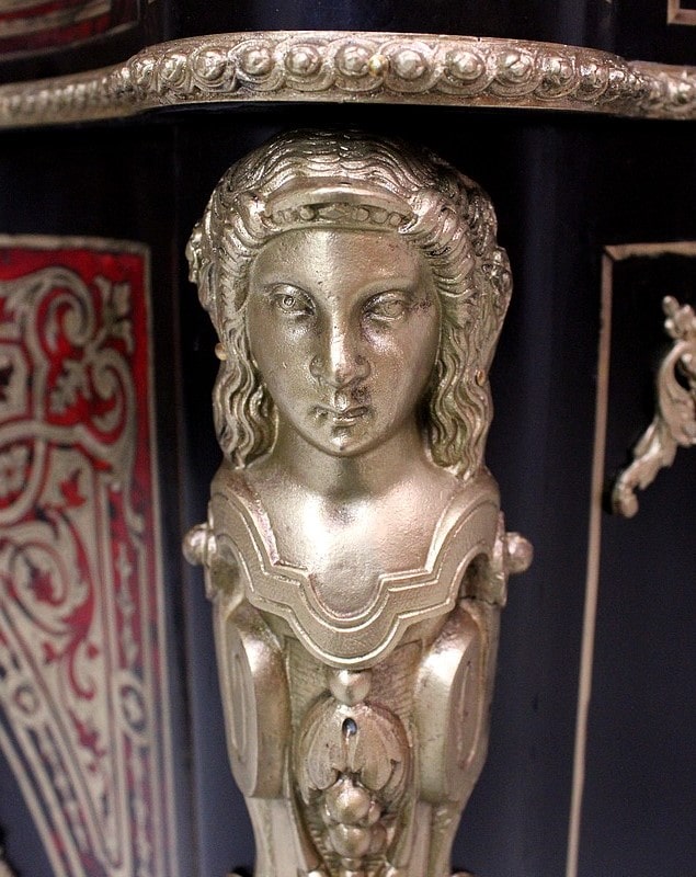 On retrouve de nombreux autres ornements sur l’ensemble de ce Meuble. Ainsi bustes de femmes, chutes en Bronze, écoinçons, filets et galeries de laiton, ou encore Marqueteries ‘Boulle’ enjolivent ses montants arrondis, ses côtés cintrés, et ses traverses haute et basse.