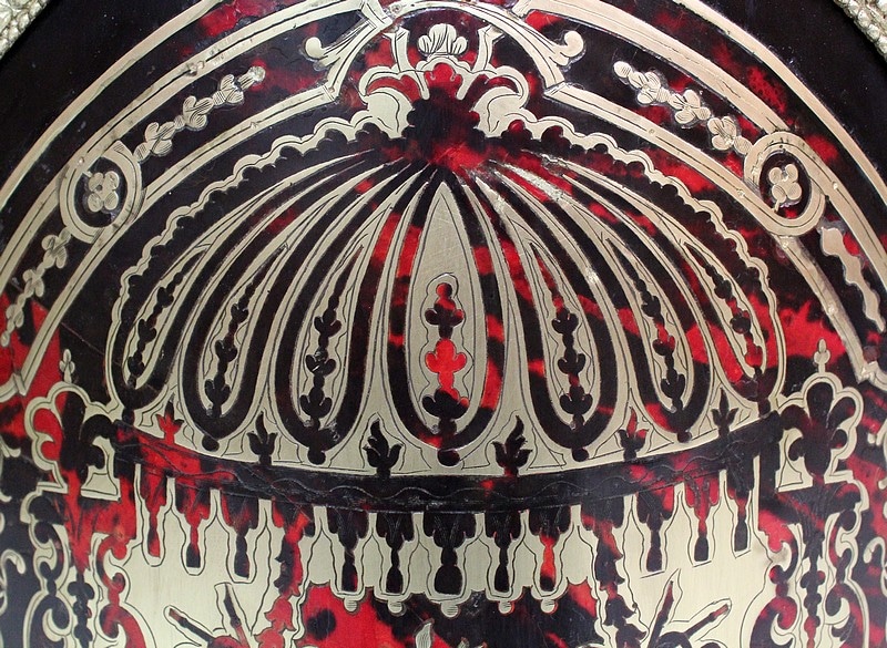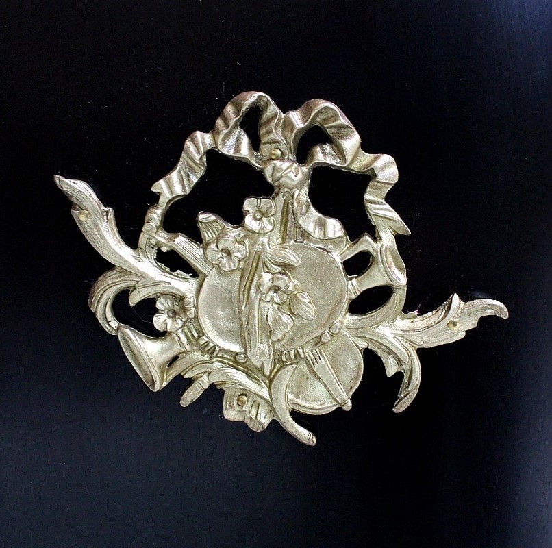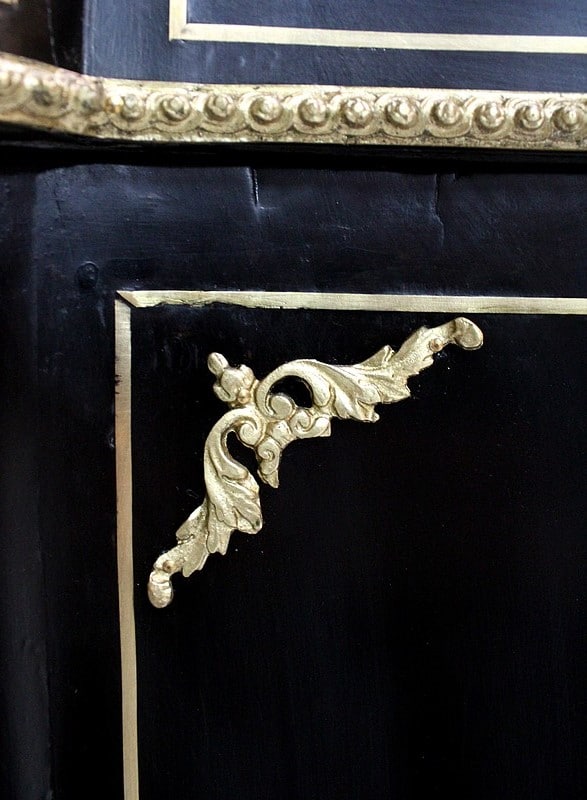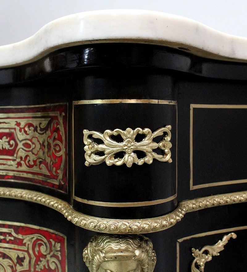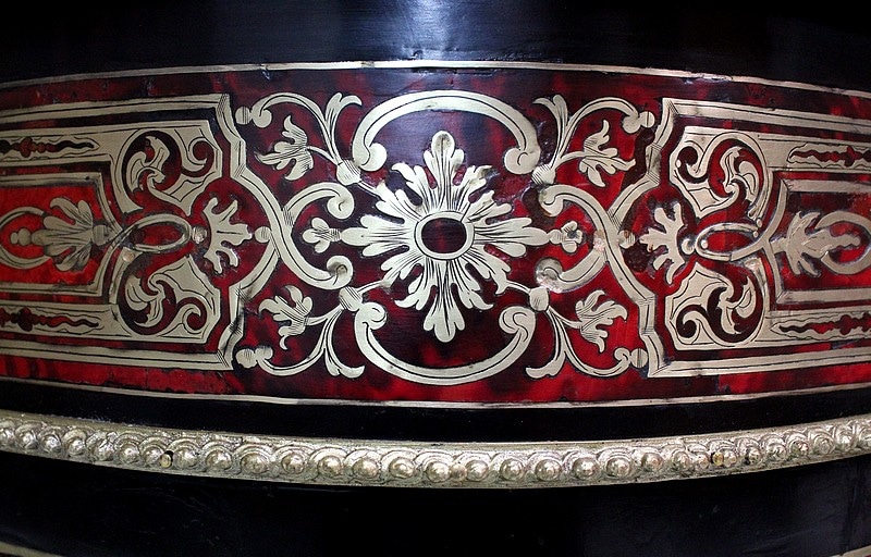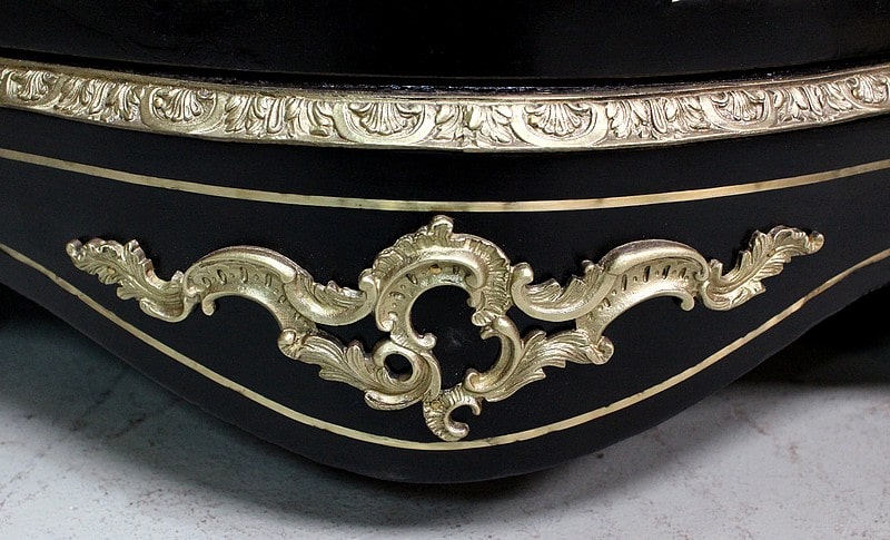 On retrouve de nombreux autres ornements sur l’ensemble de ce Meuble. Ainsi bustes de femmes, chutes en Bronze, écoinçons, filets et galeries de laiton, ou encore Marqueteries ‘Boulle’ enjolivent ses montants arrondis, ses côtés cintrés, et ses traverses haute et basse.