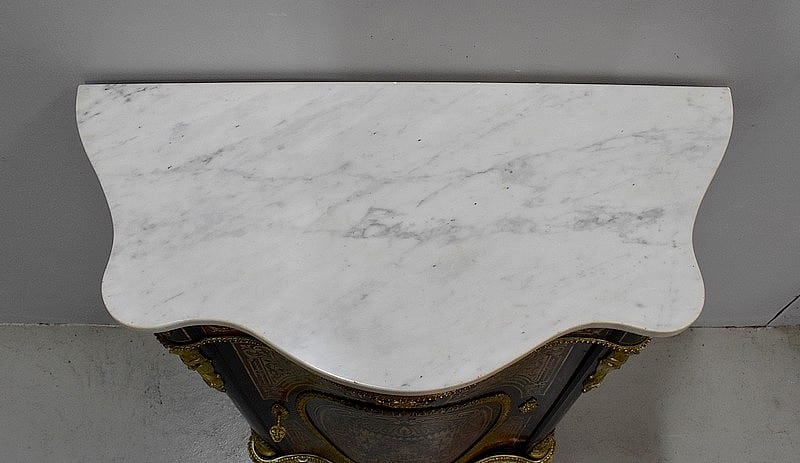 Son dessus est un Marbre Blanc, aux contours épousant les lignes courbes du Meuble.