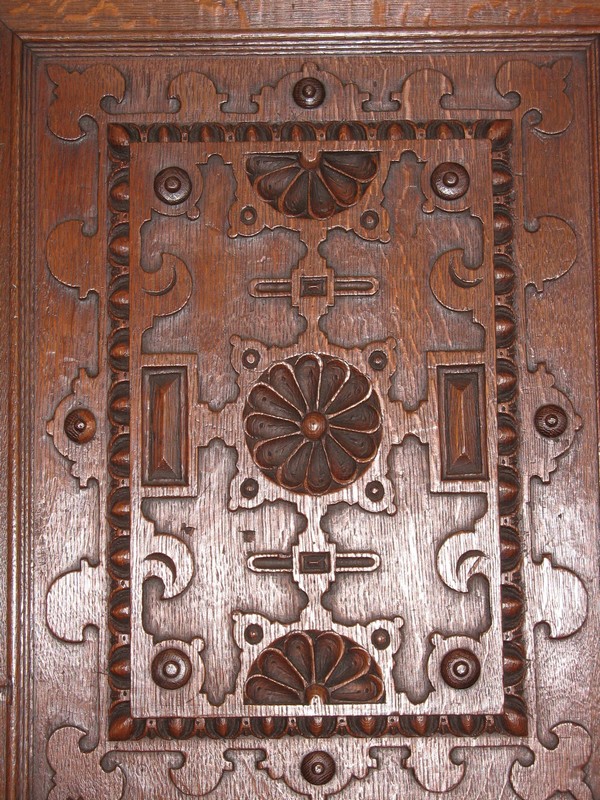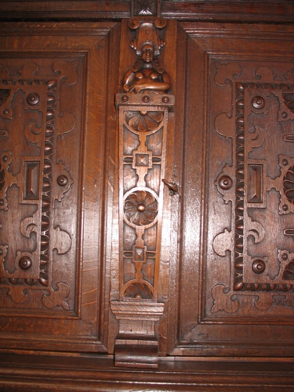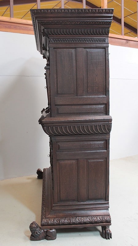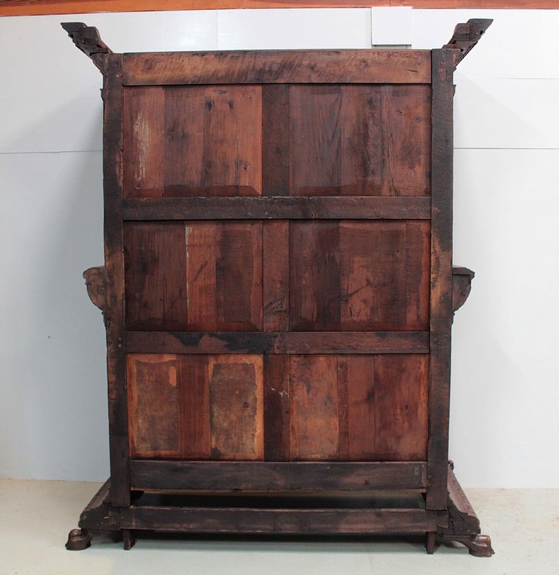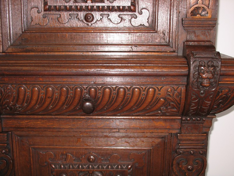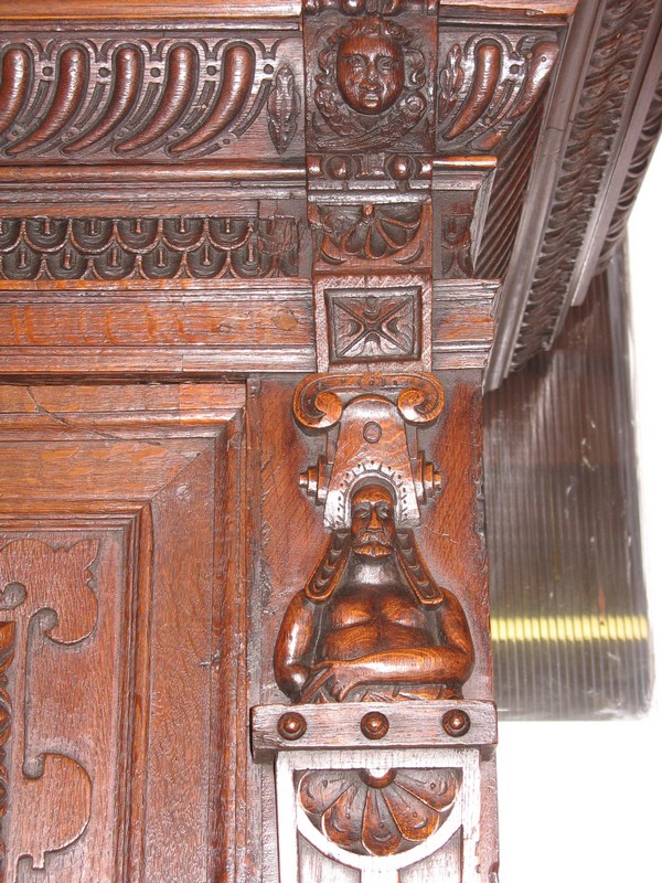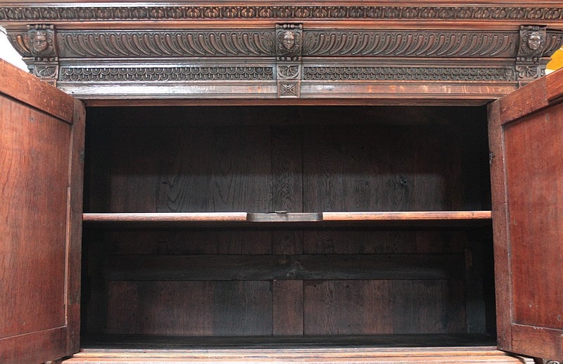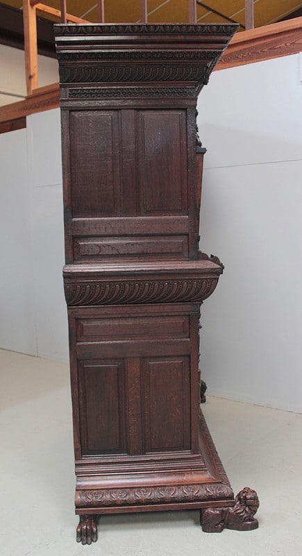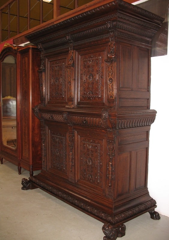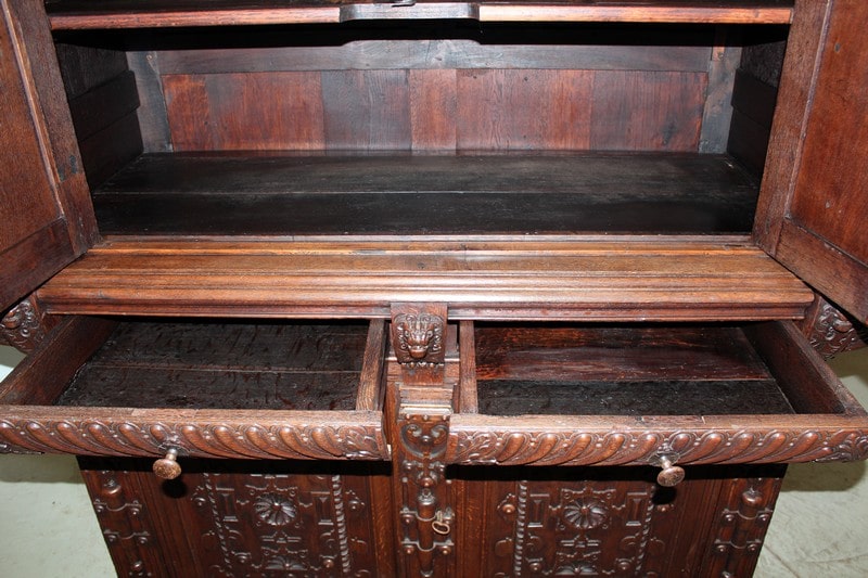 Très grand meuble 4 vantaux – 2 tiroirs en ceinture – en chêne mouluré et sculpté dans le goût Renaissance Flamande. Bustes de personnages antiques sur les pilastres, pieds en griffes.