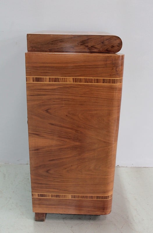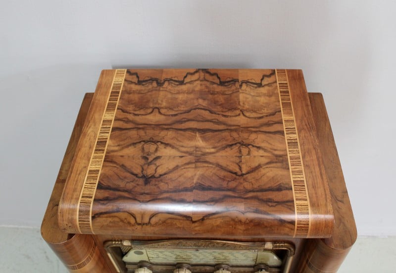 Meuble-radio Art-Déco en placage de noyer avec incrustation de bois exotique encadré de filets de citronnier.
