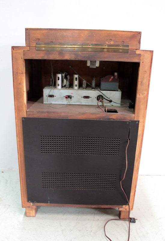 Il ouvre par le dessus sur un tourne-disques et en partie basse par une porte basculante découvrant deux compartiments à disques.