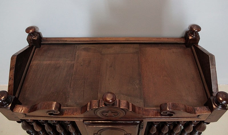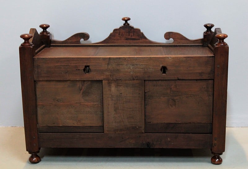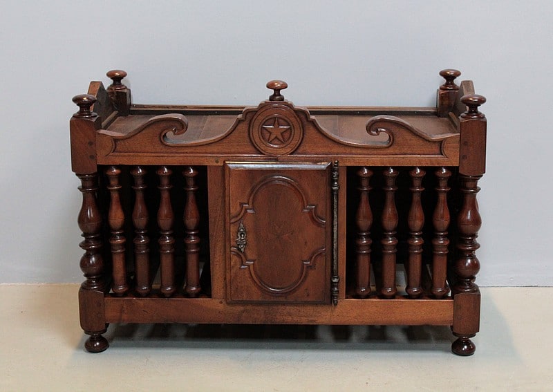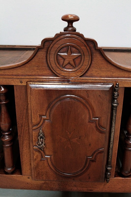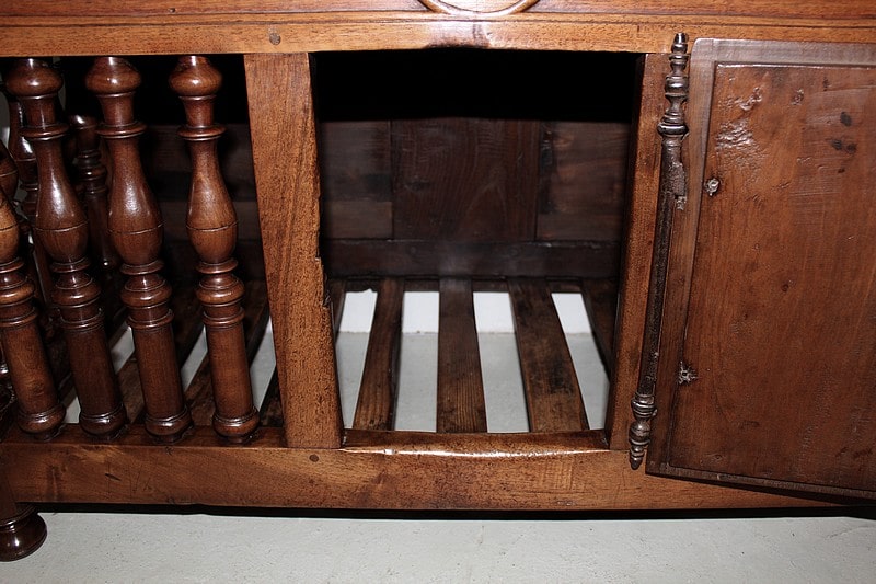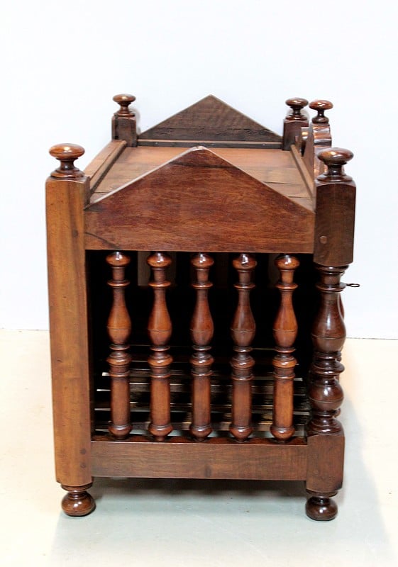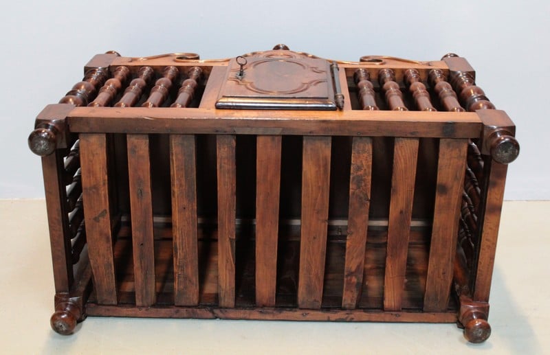 Panetière en noyer du Sud de la France. Elle est entourée de barreaux tournés, son fond est à claires-voies. Elle ouvre en façade par une petite porte avec fiche de fer.