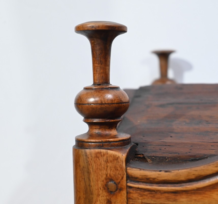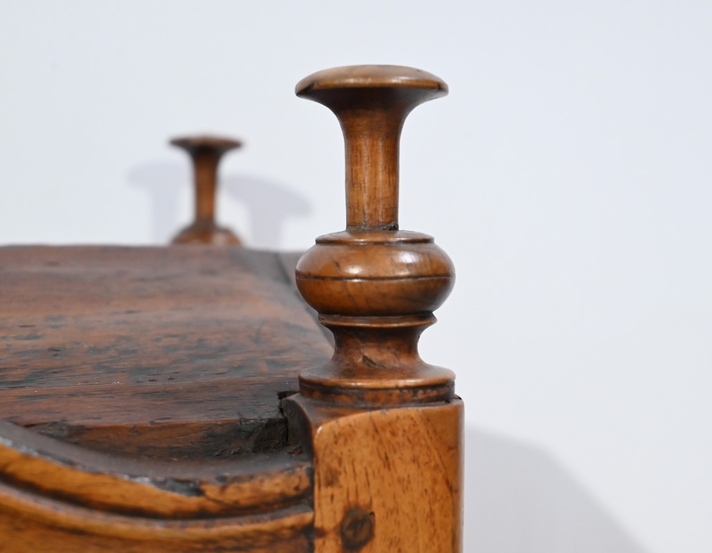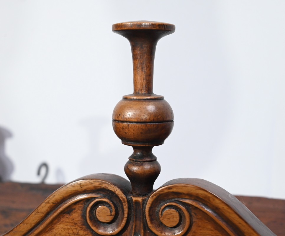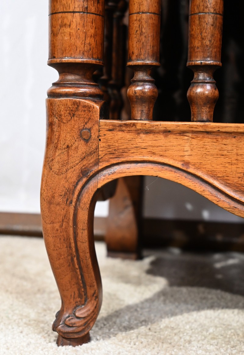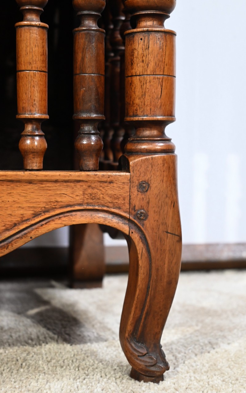 Les montants avant, également tournés, se terminent par de petits pieds de biche.