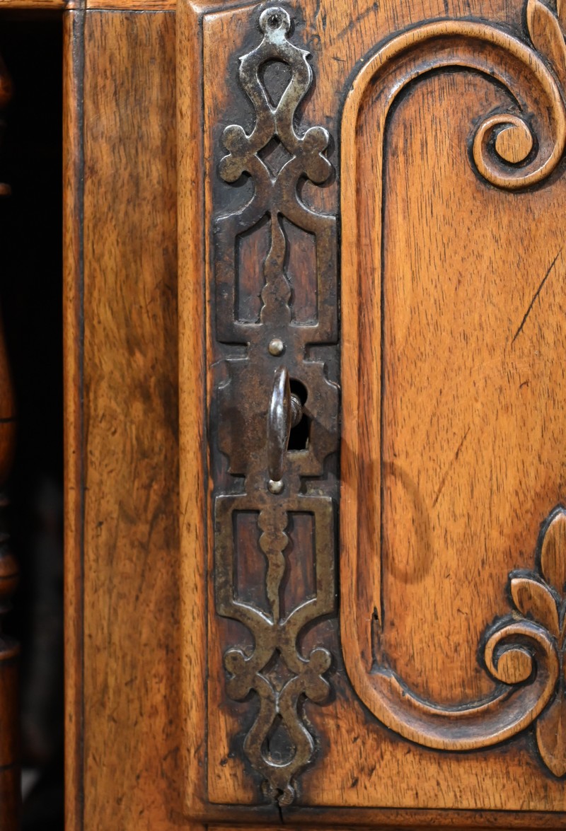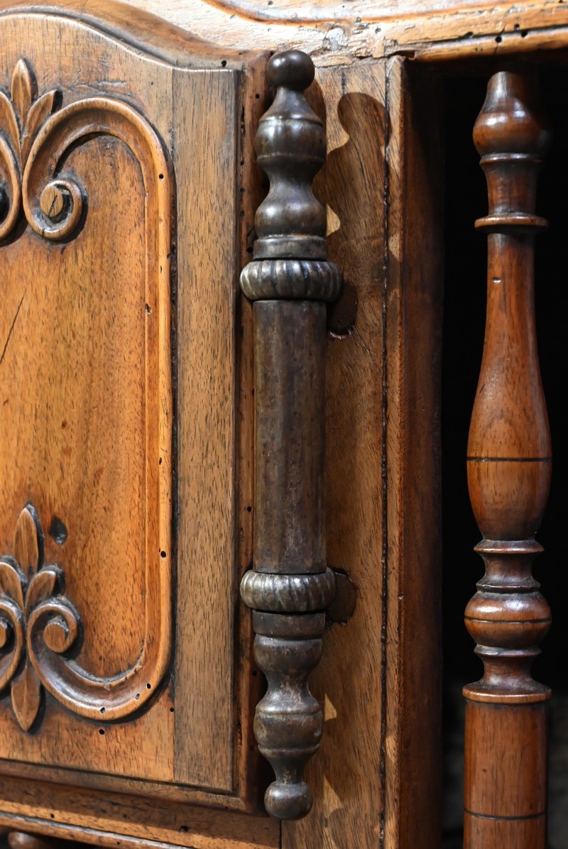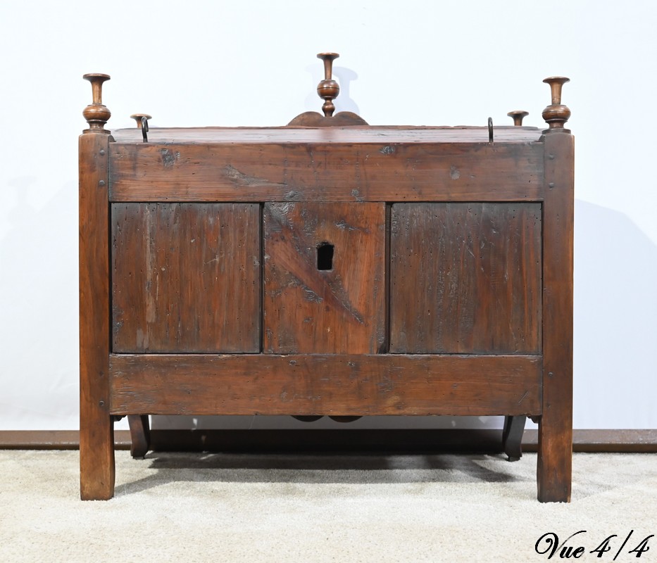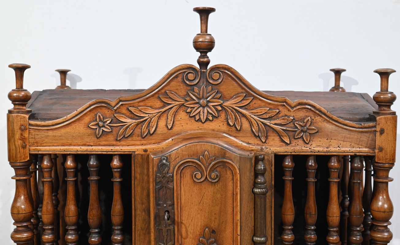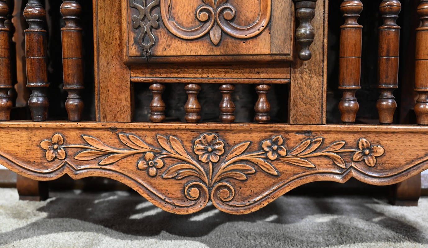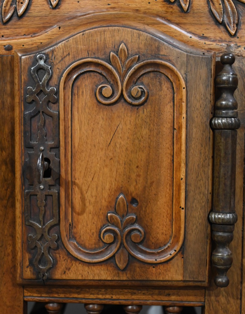 Ce meuble régional de conservation est sommé aux quatre angles, ainsi qu’en façade, de plumets également appelés mouchets ou bobèches.