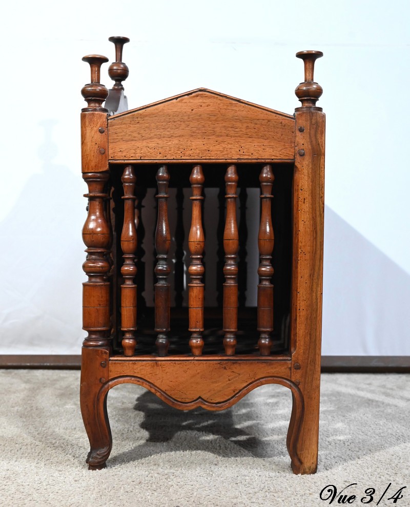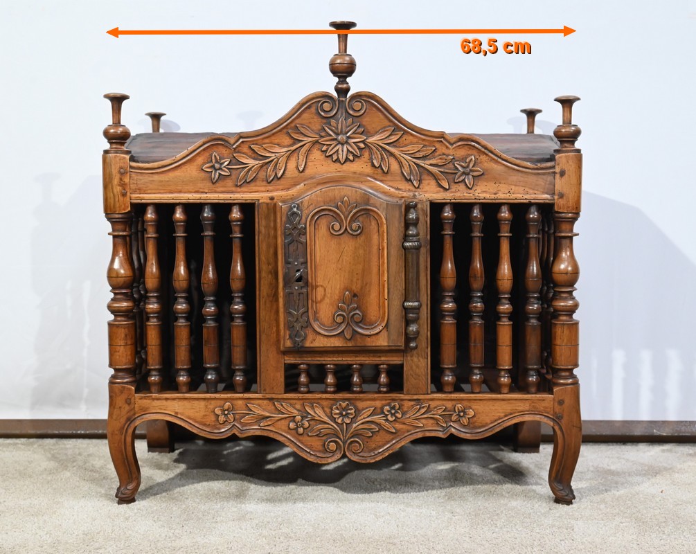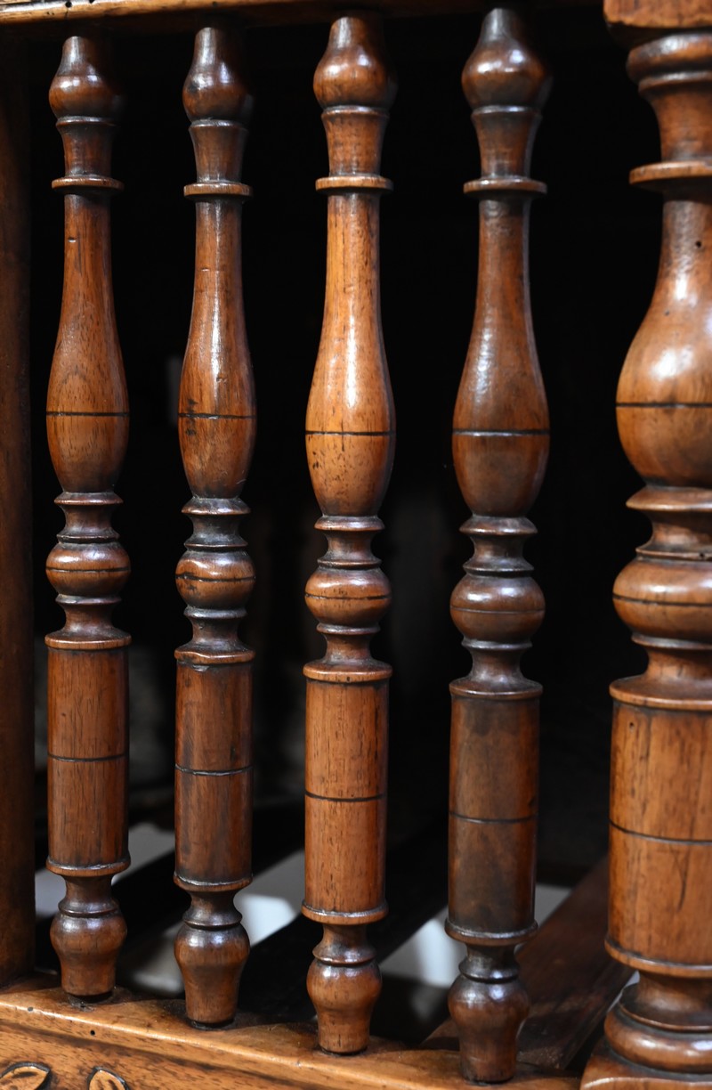 La façade et les côtés, ajourés, sont garnis d’une succession de barreaux tournés en fuseau.