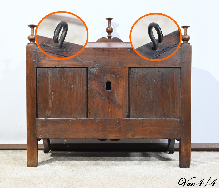 Elle ouvre par une porte en applique montée sur gond de fer avec serrure d’origine fonctionnelle dite coffre-fort avec entrée et clé.