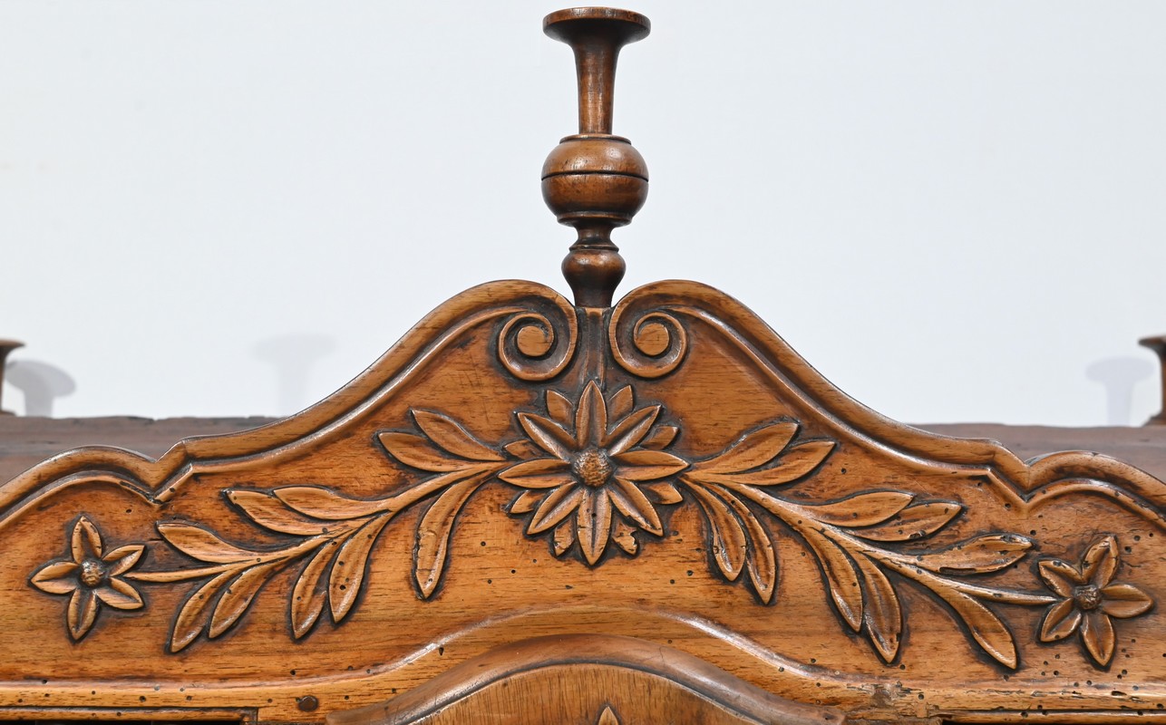 La traverse basse et le fronton, découpés, sont agrémentés de motifs de fleurs et de volutes.