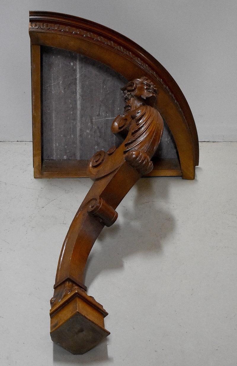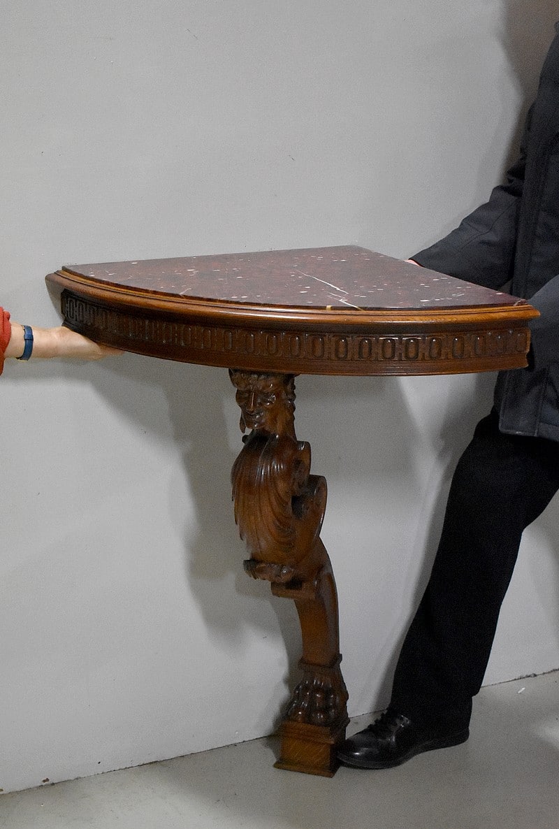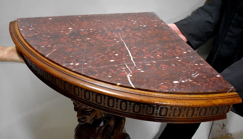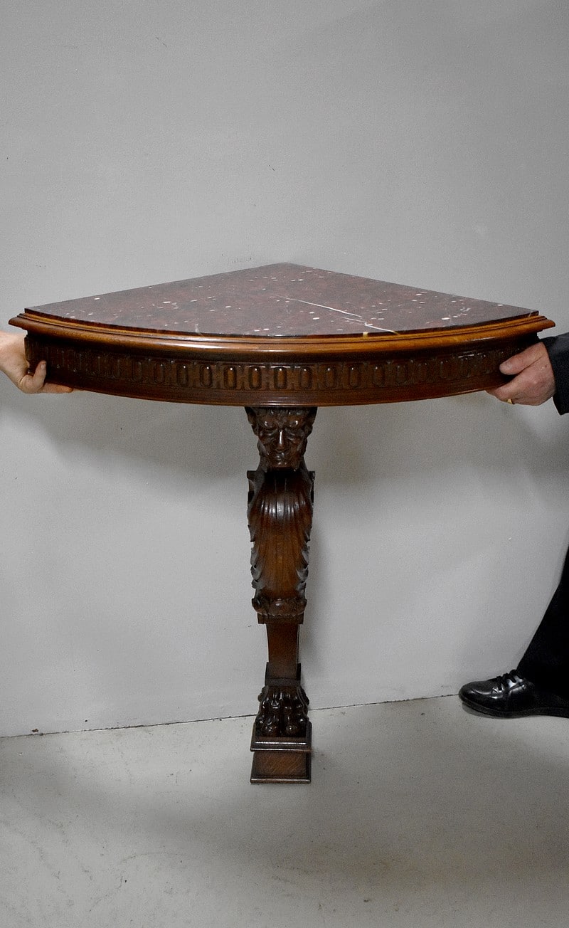 Petite console d’angle en Chêne à dessus en marbre collé Griotte Rouge décoré ‘d’œils de perdrix’. Un léger accident réparé est à noter.