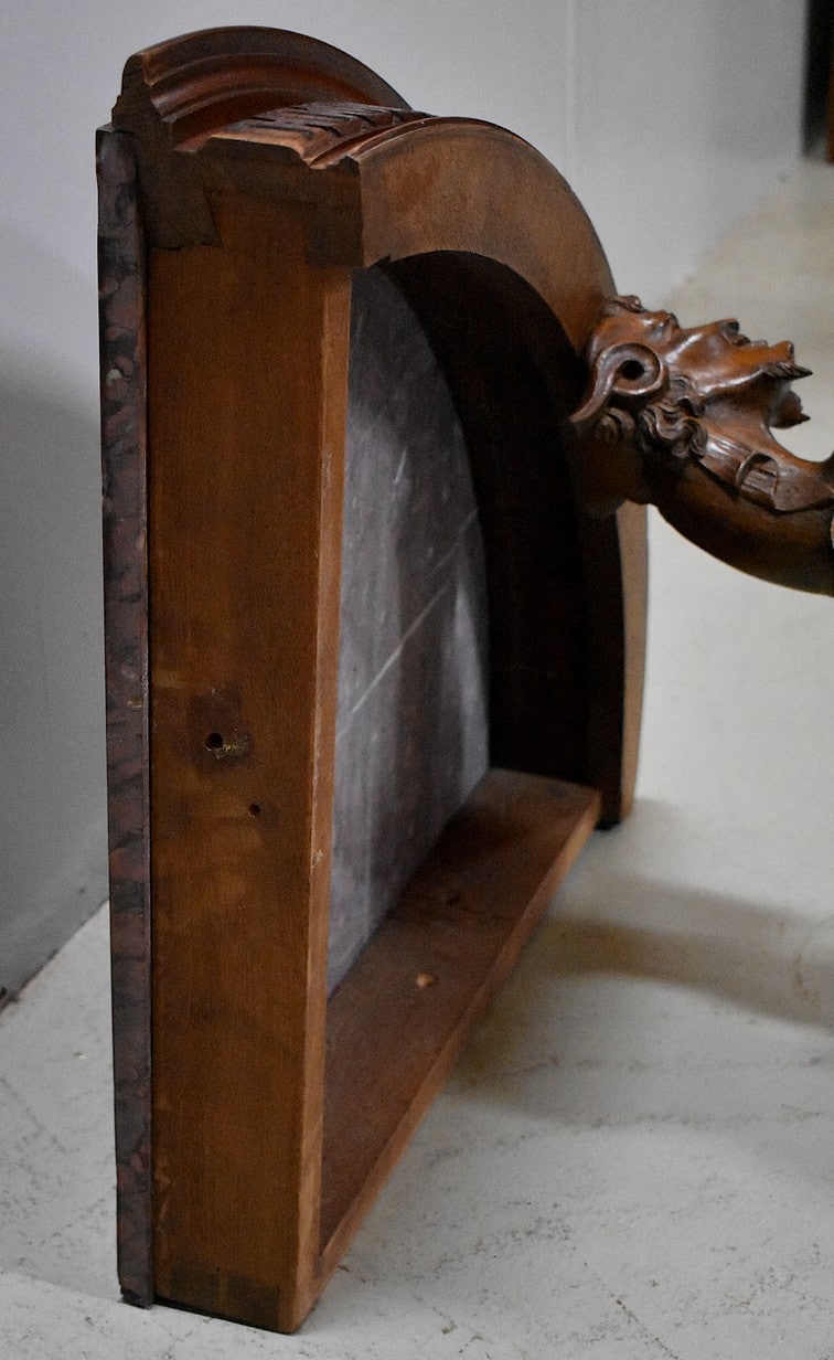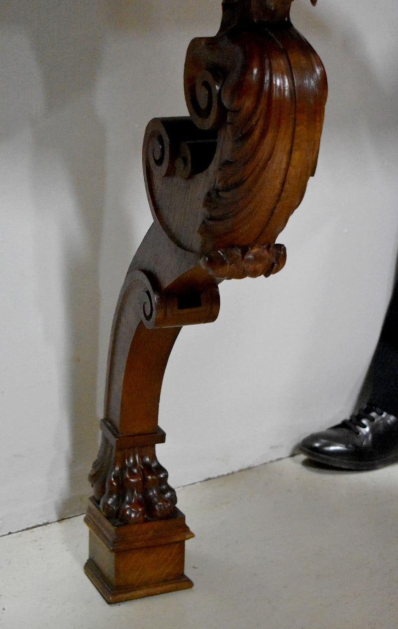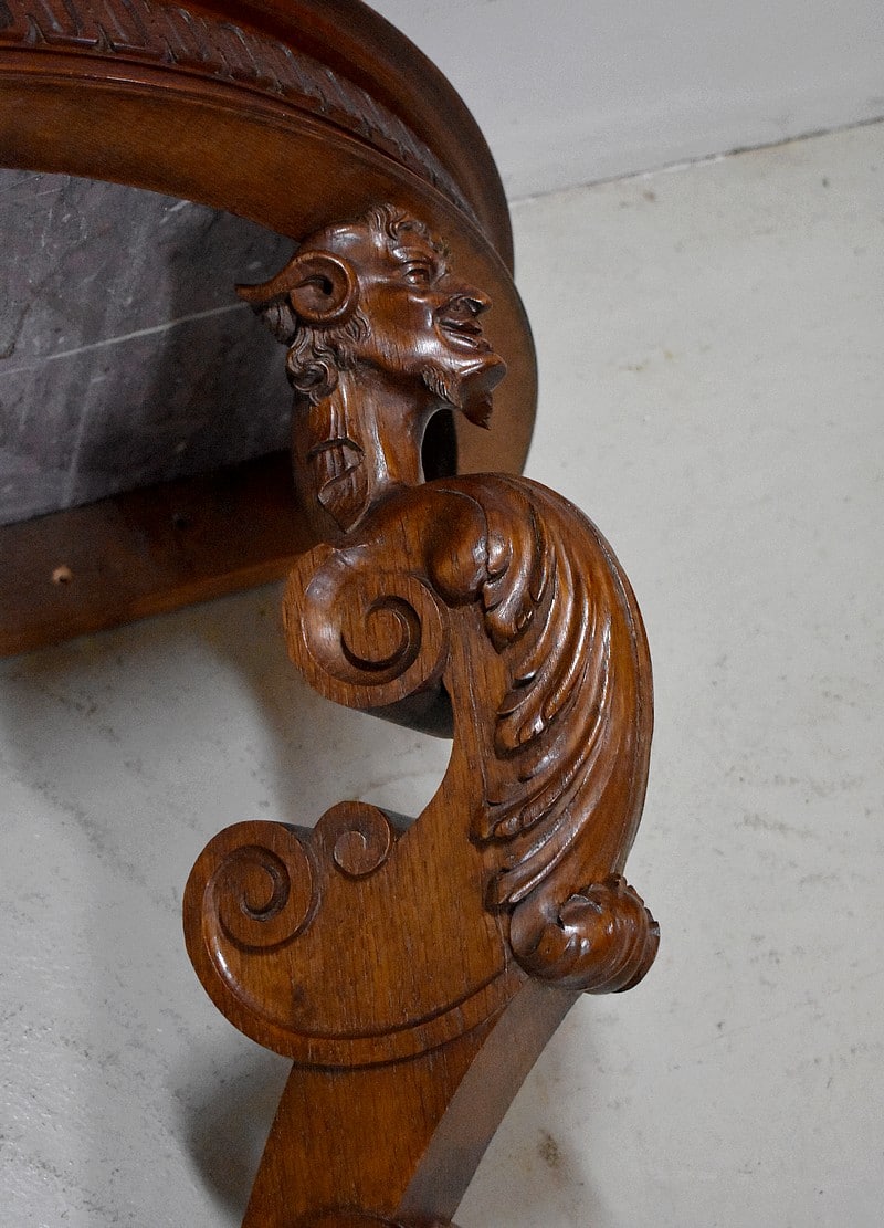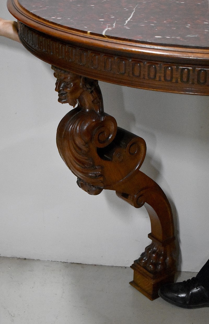 Elle repose sur un seul et unique pied à décor de tête de faune orné de rinceaux et de volutes sculptés terminé en patte de lion sur un socle carré et mouluré.