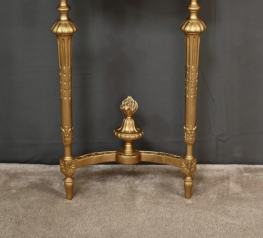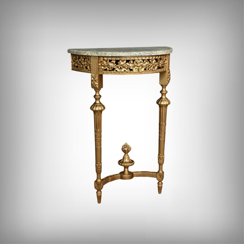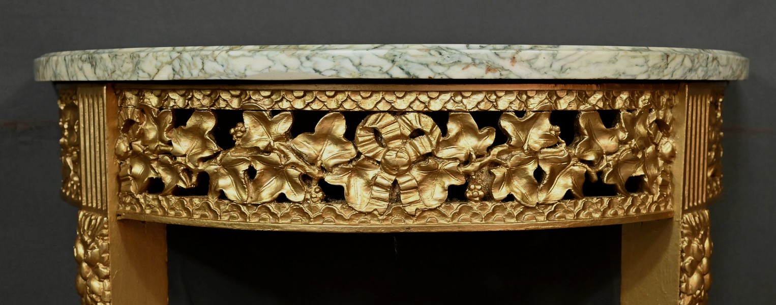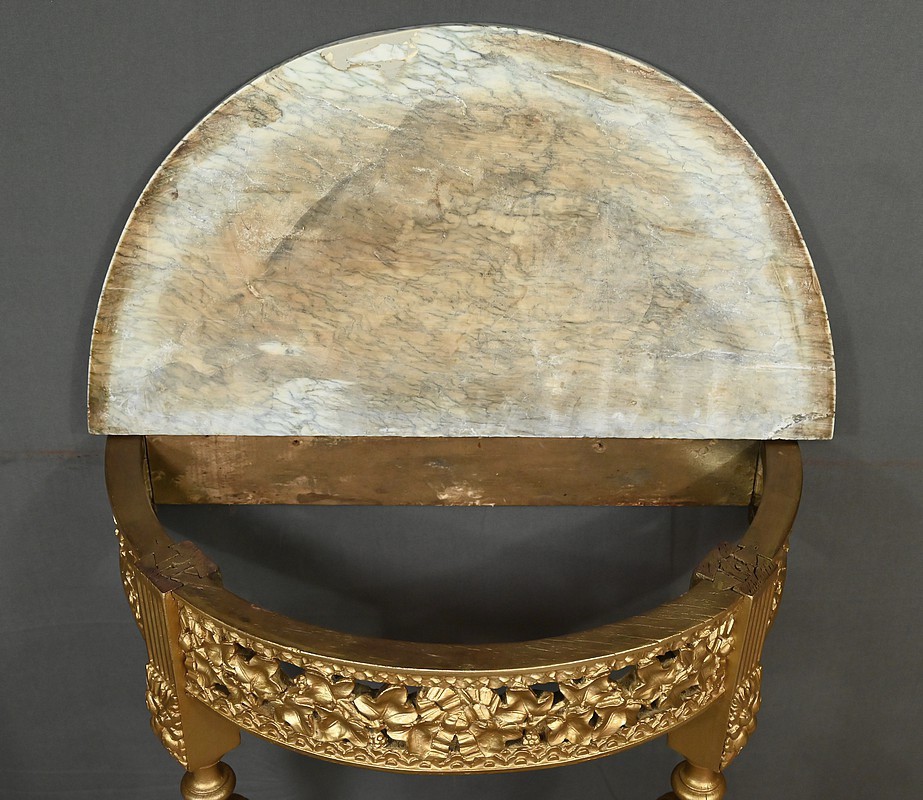 Cette console d’applique demi-lune en bois doré sculpté illustre l’élégance du style Louis XVI. La ceinture est ornée d’une frise ajourée de lierres finement ciselés et noués de rubans, créant un jeu d’ombres et de reliefs qui capte la lumière. Le plateau demi-lune entouré d’une gorge est en marbre vert d’Estours, dont les veines riches contrastent avec la chaleur de la dorure. Les pieds sont fuselés et cannelés, rudentés d’asperges, et offrent une silhouette élancée et harmonieuse. Une entretoise courbe relie les pieds et supporte un pot à feu central sculpté en ronde-bosse, qui sert de point d’appui esthétique et structurel. La dorure chatoyante met en valeur les détails et renforcent le caractère classique de la pièce. Cette console se placera sous un miroir ou entre deux appliques murales dans un salon ou une chambre à la décoration raffinée.