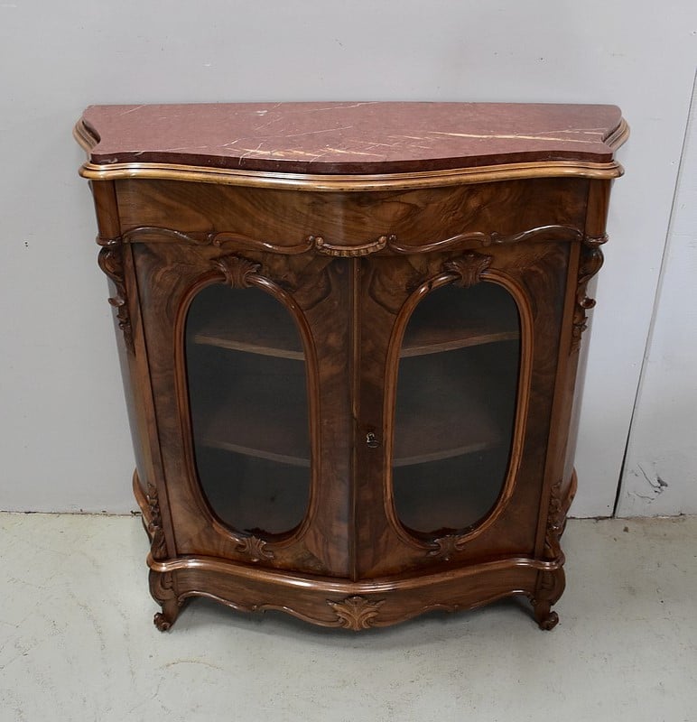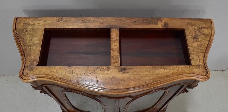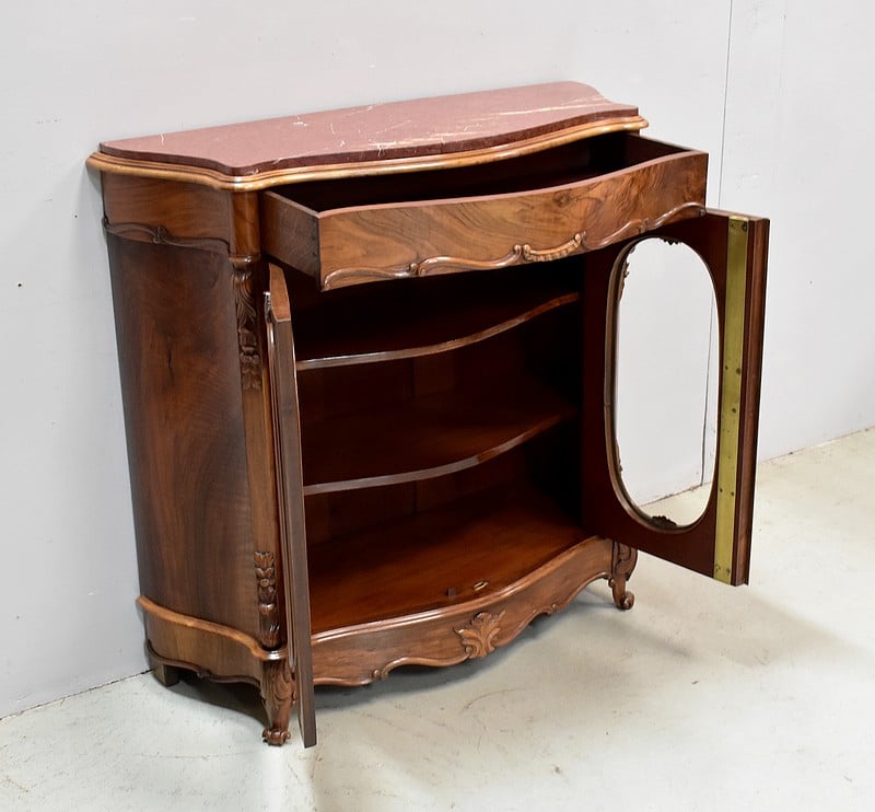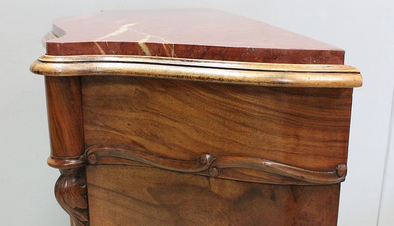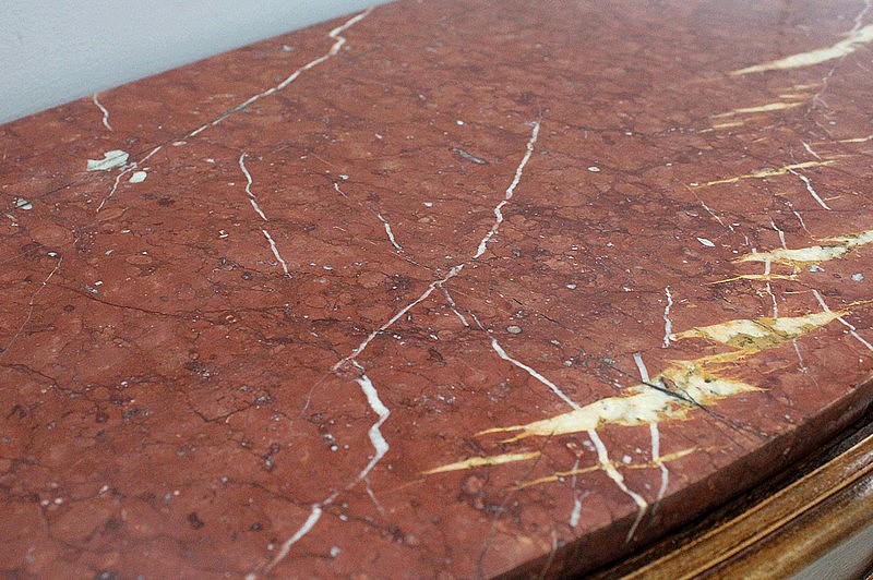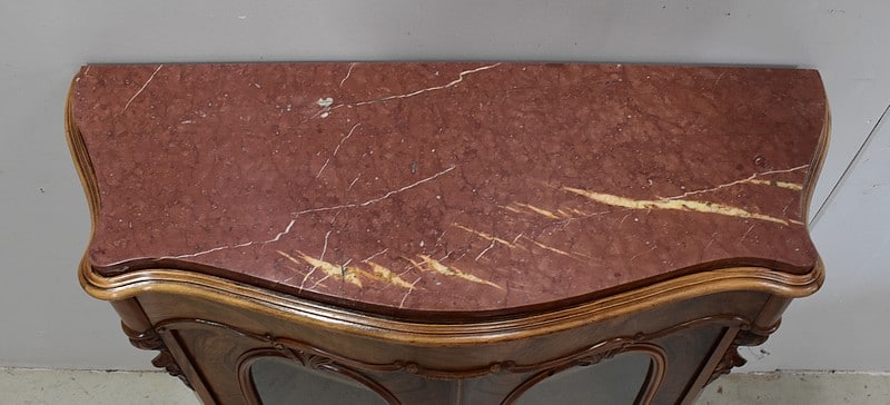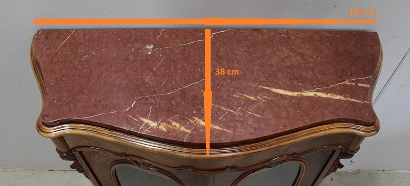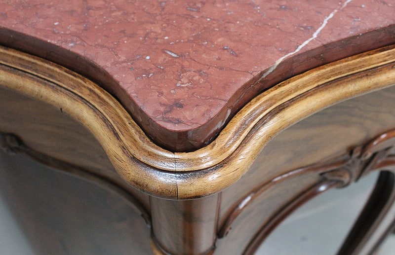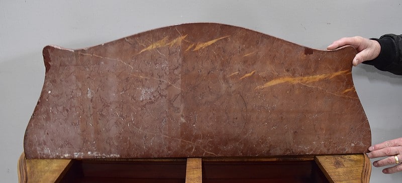 Le dessus est un Marbre Griotte à dominante Rouge, encastré dans un entourage bois mouluré. L’ensemble est découpé selon les courbes du meuble.