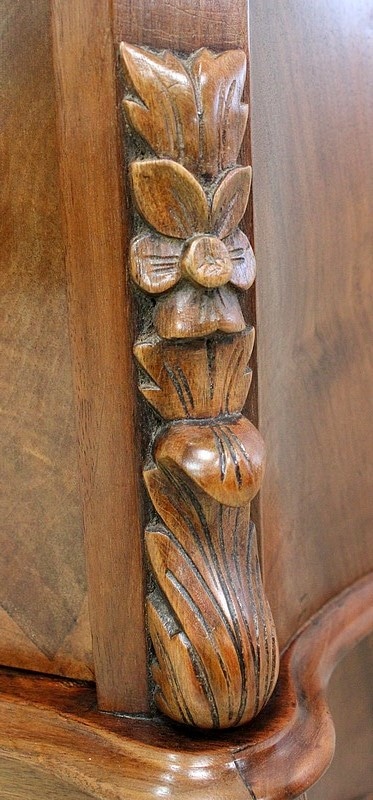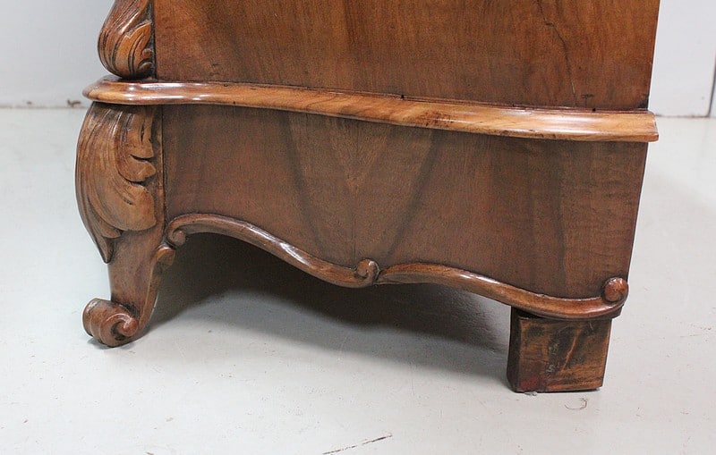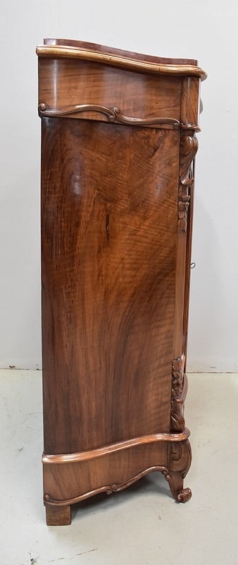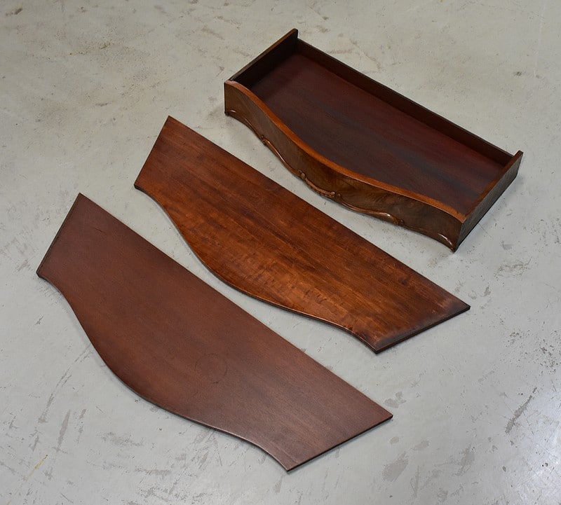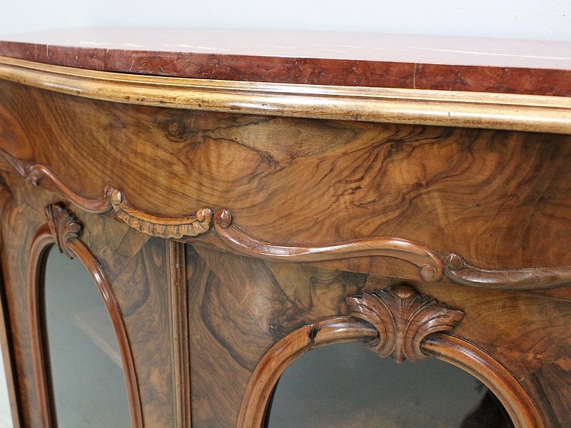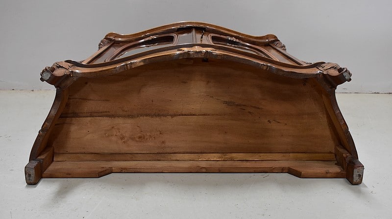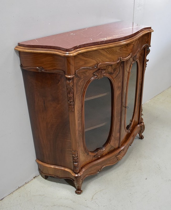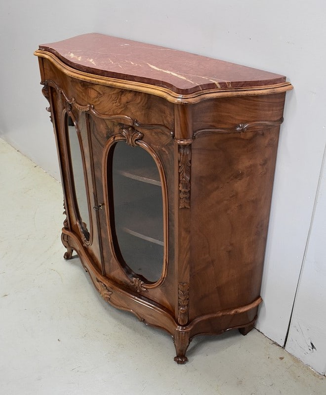 Le dessus est un Marbre Griotte à dominante Rouge, encastré dans un entourage bois mouluré. L’ensemble est découpé selon les courbes du meuble.