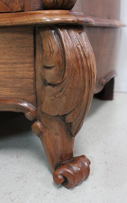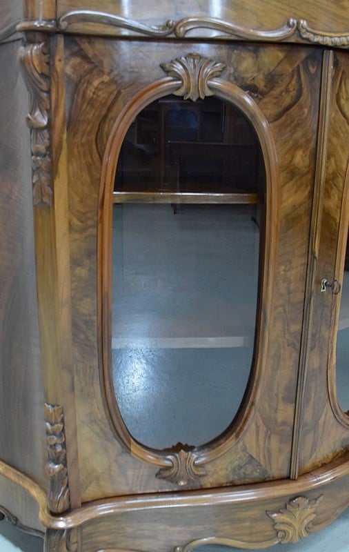 Cette Vitrine se termine par une plinthe moulurée et chantournée, reposant sur deux pieds avant ouvragés en enroulements et deux pieds arrières droits. On retrouvera au centre de la traverse basse un Décor sculpté rappelant ceux décrits précédemment.