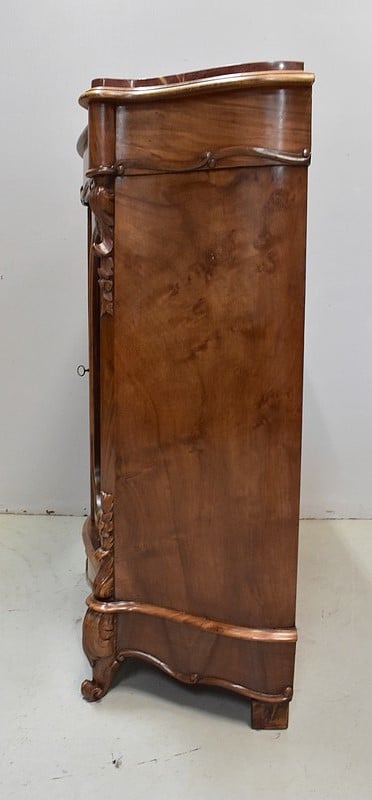On retiendra notamment de ce meuble la teinte et l’essence de son bois, particularité qui, associée à la couleur Chaude de son Marbre, contribue au Charme de cette Vitrine Napoléonienne.