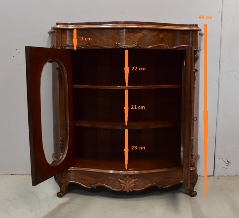 Cette Vitrine ouvre par un tiroir de 7 cm de profondeur, dissimulé dans la ceinture mais néanmoins agrémenté de Guirlandes sculptées en partie basse qui se poursuivent sur les côtés.