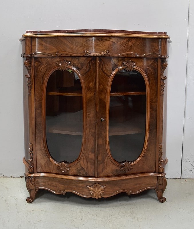 Petite Vitrine en Placage de Noyer Blond, à hauteur d’appui et aux lignes arrondies : façade galbée et côtés cintrés.