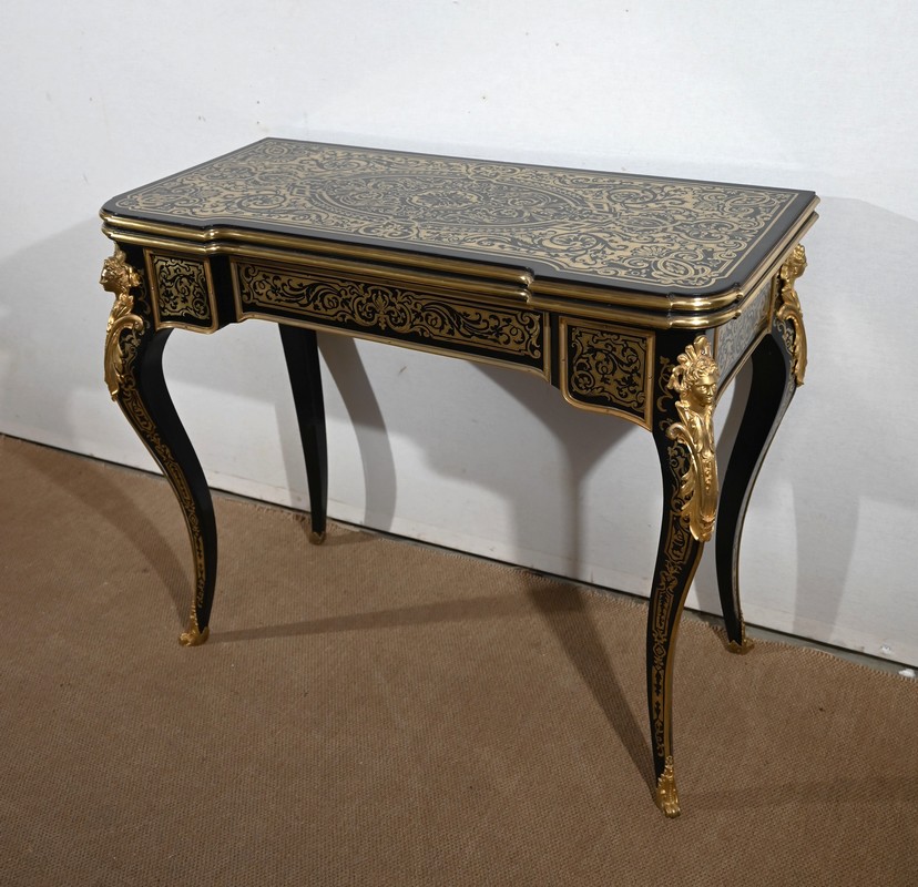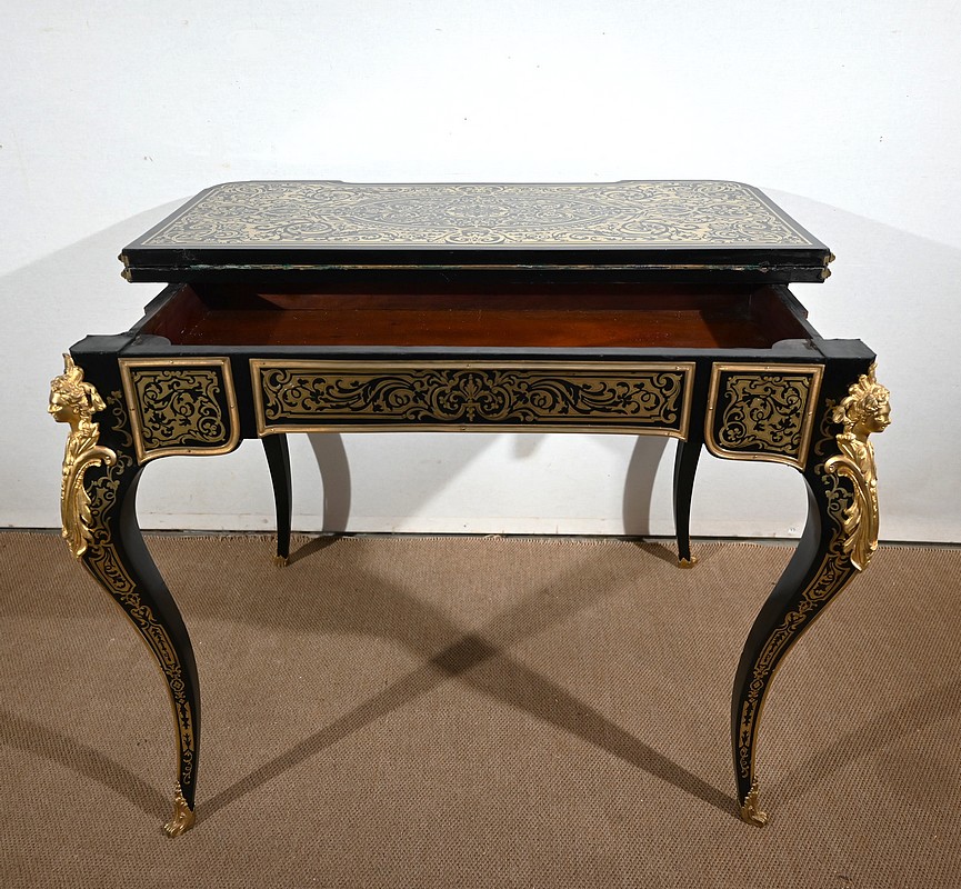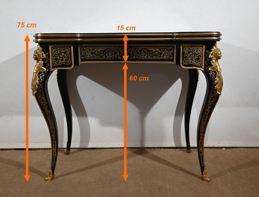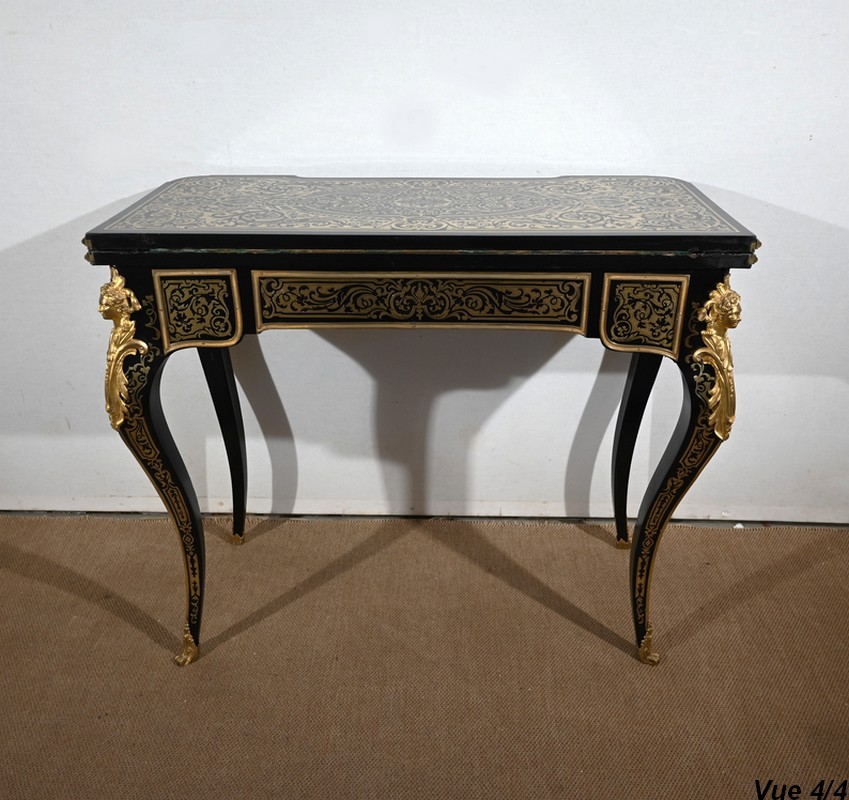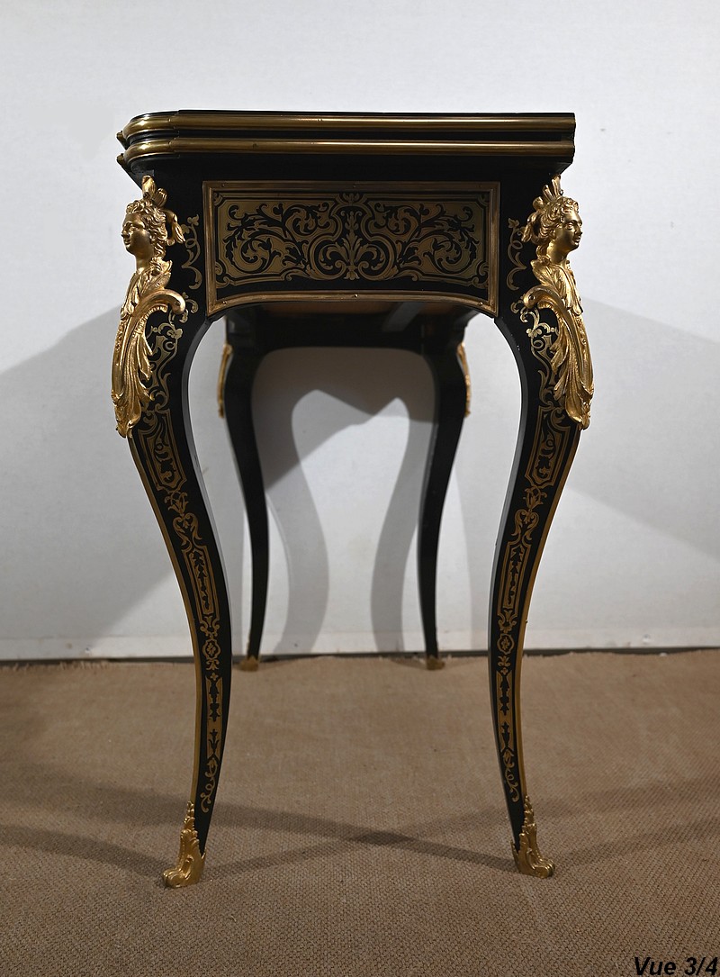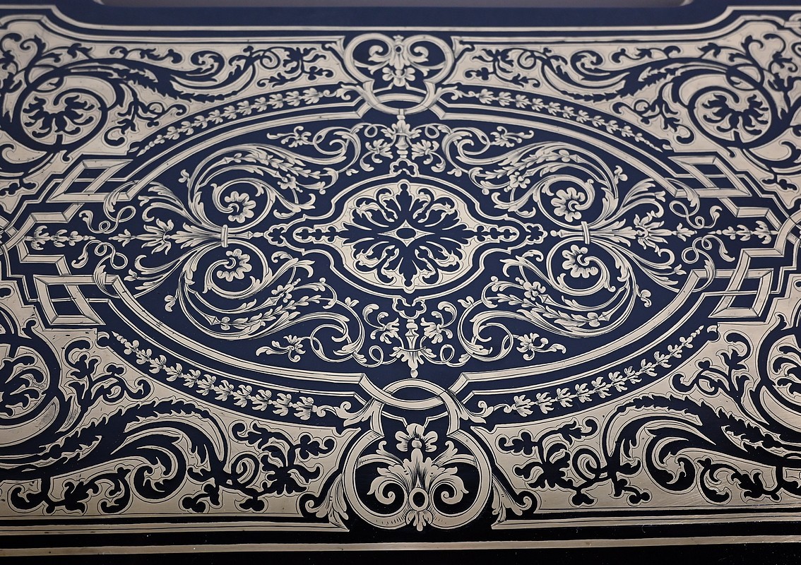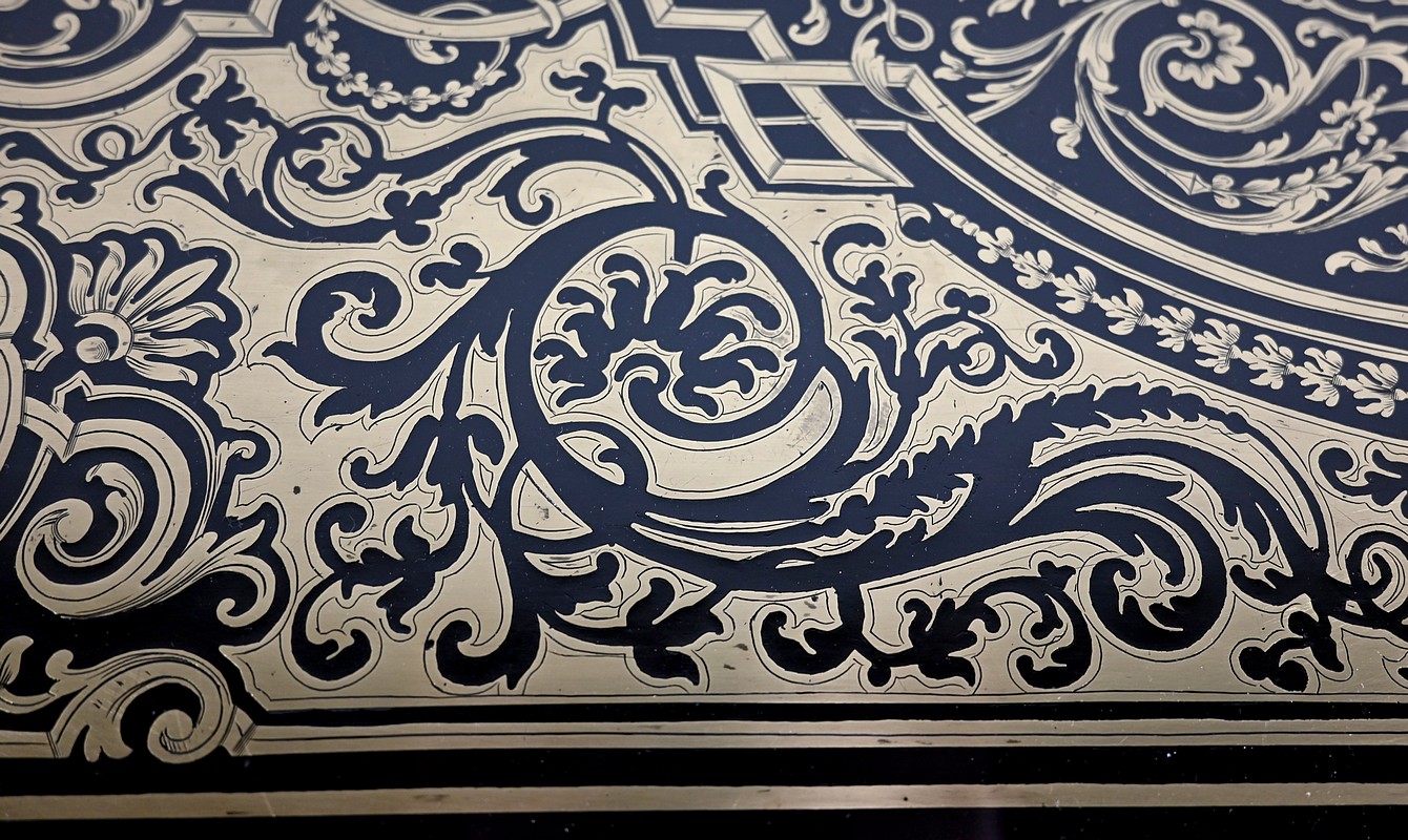 Son dessus portefeuille arbore en son centre un décor marqueté de volutes, de rinceaux, de feuillage et de fleurs en laiton finement ciselé. Ce double plateau est bordé d’une moulure en façade et sur les côtés.