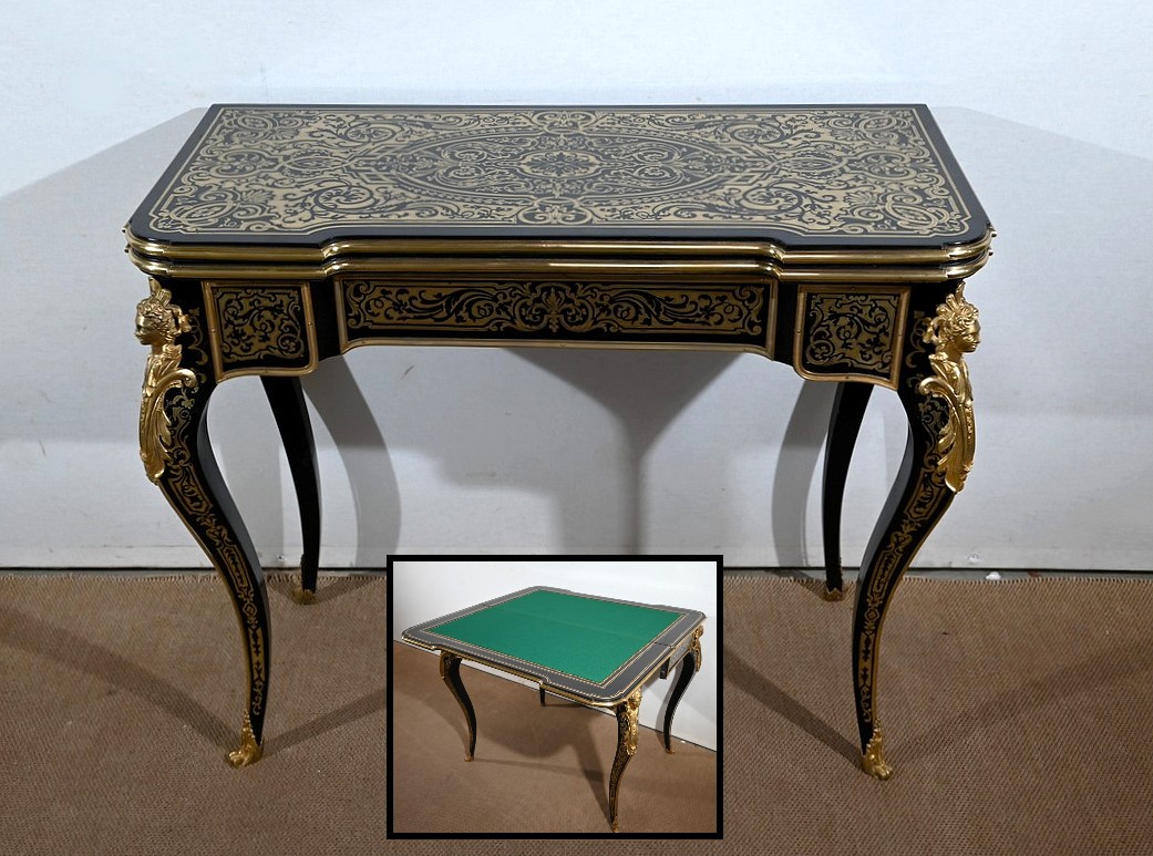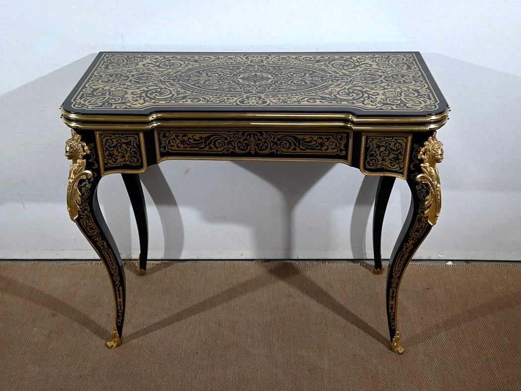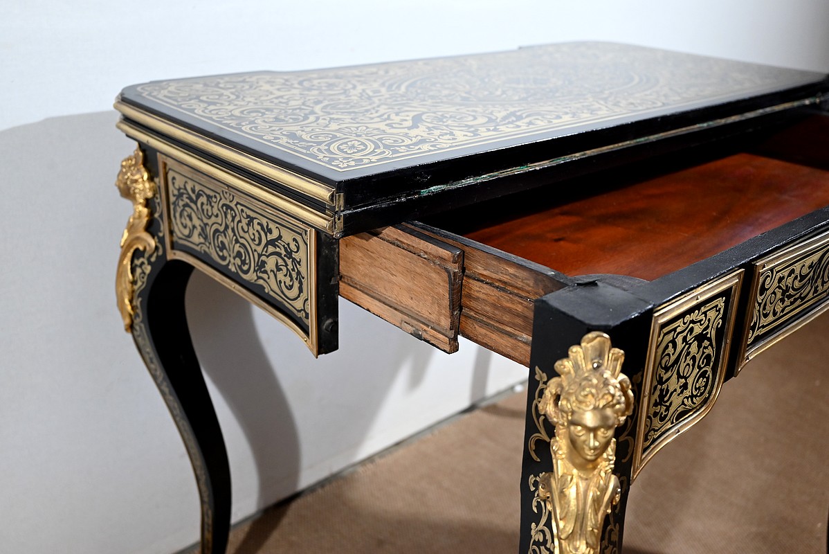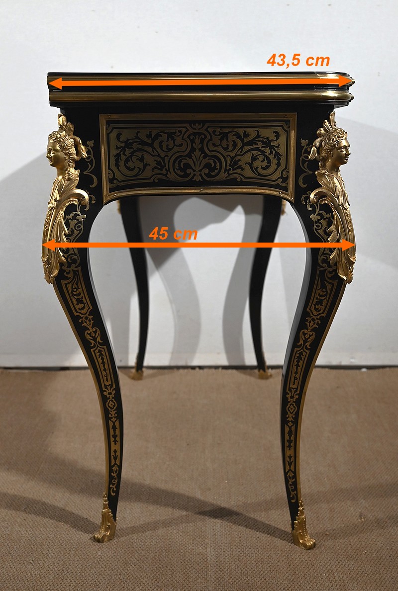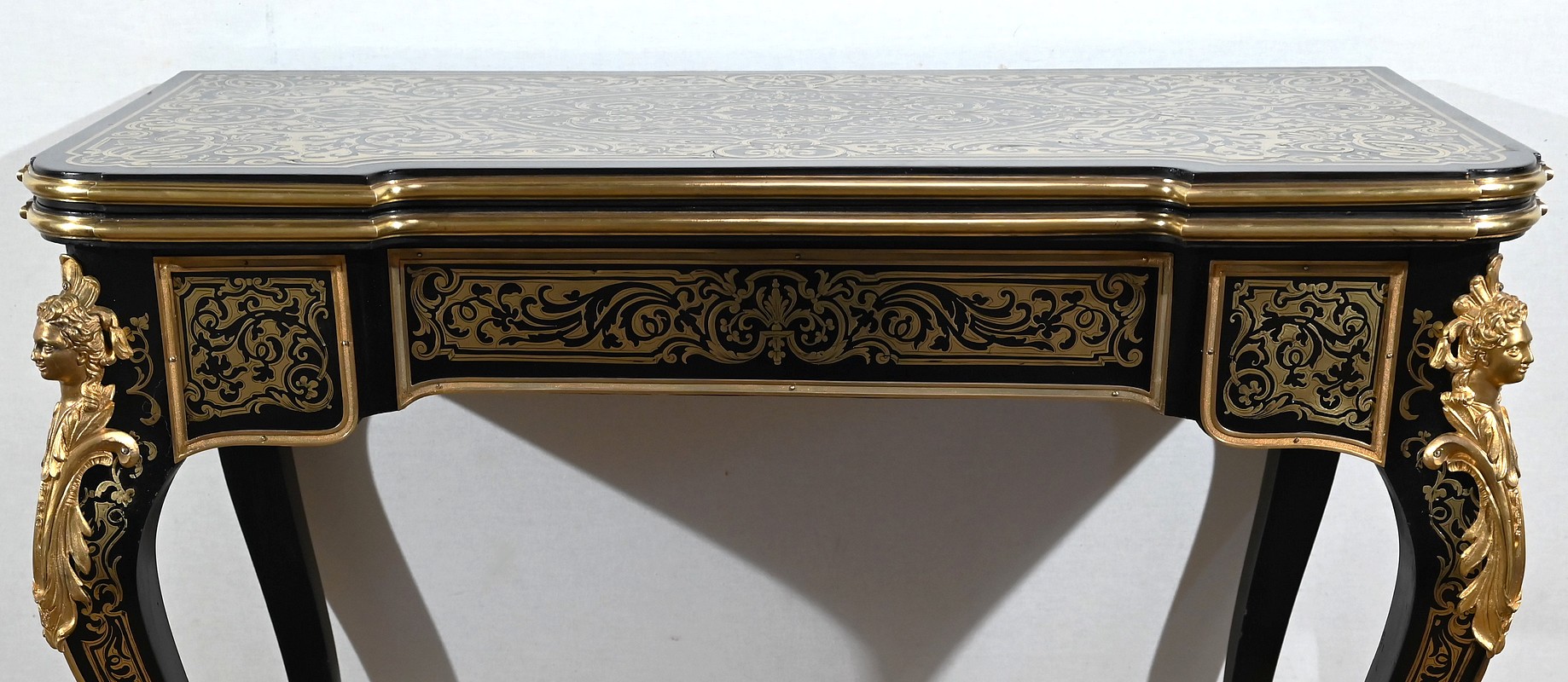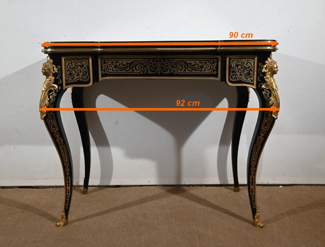 Son dessus portefeuille arbore en son centre un décor marqueté de volutes, de rinceaux, de feuillage et de fleurs en laiton finement ciselé. Ce double plateau est bordé d’une moulure en façade et sur les côtés.