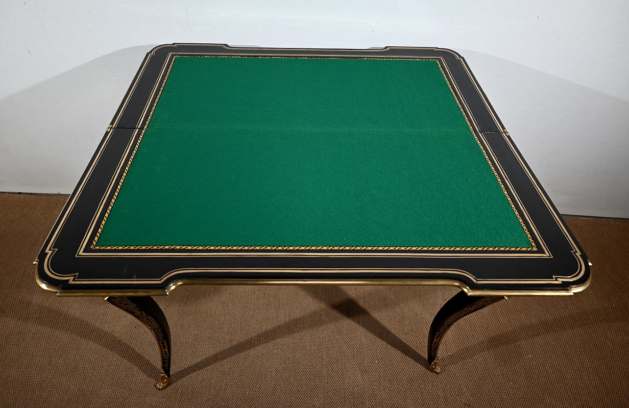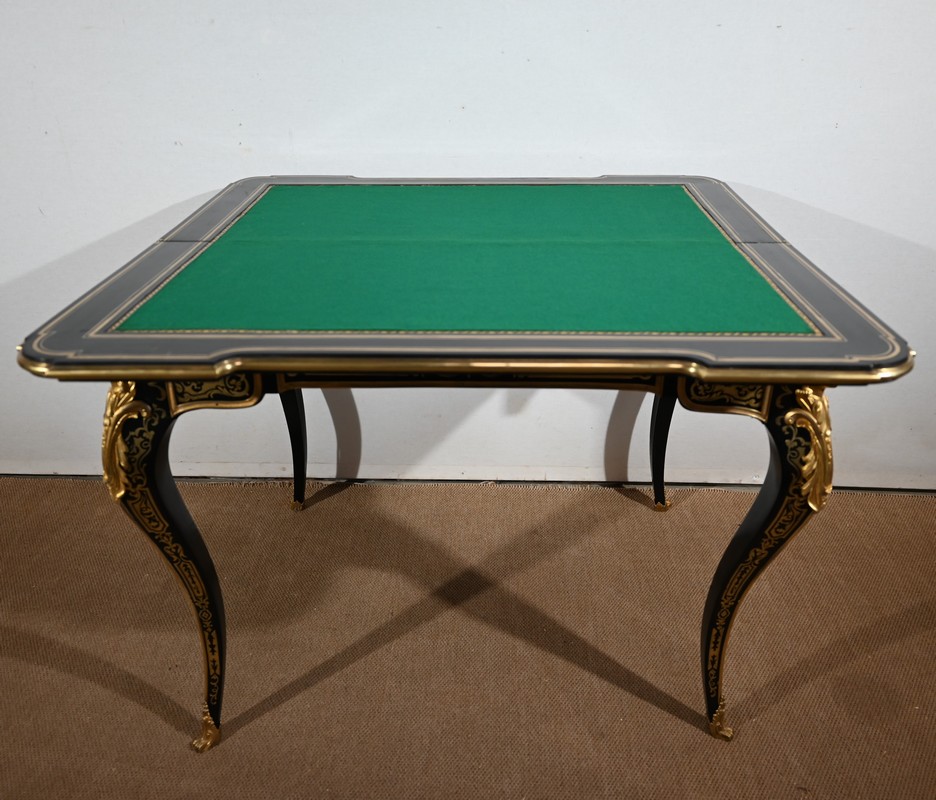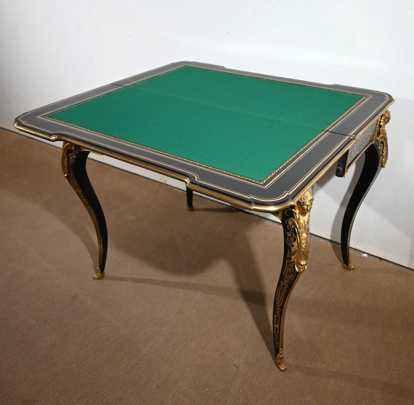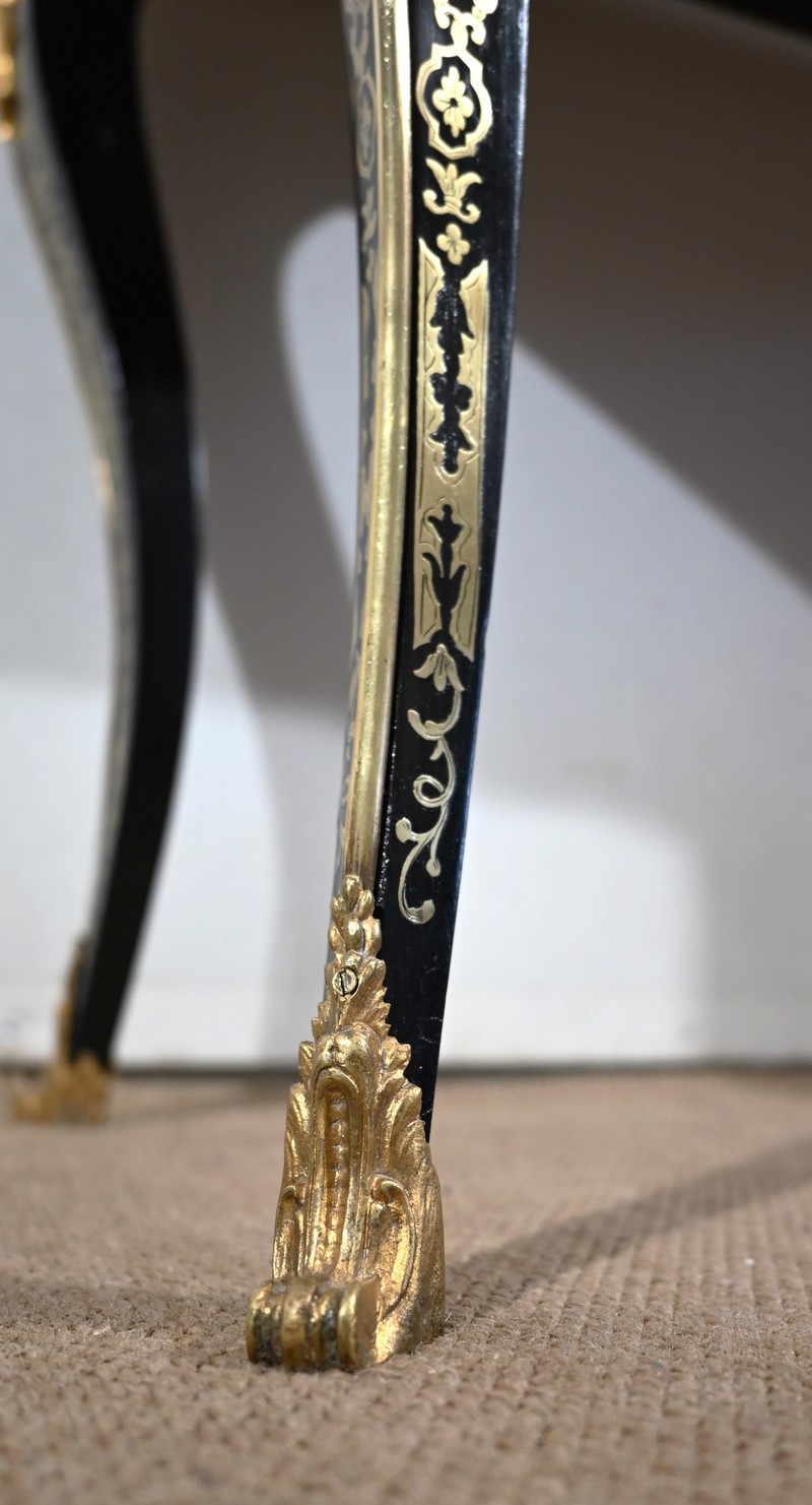 Cet ensemble repose sur quatre pieds galbés Louis XV, également incrustés de compositions en laiton et moulurés au chant. Ils sont agrémentés d’espagnolettes en parties hautes, et se terminent par des sabots encastrés.