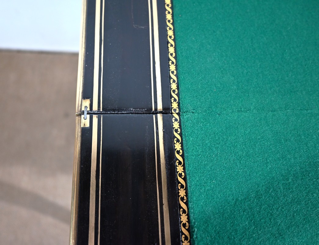 Ouvert, ce dernier présente un encadrement à décrochement à l’avant et à l’arrière, des côtés droits et des angles à ressaut légèrement arrondis. Le centre est foncé d’une feutrine verte, entourée d’un galon à motifs dorés.