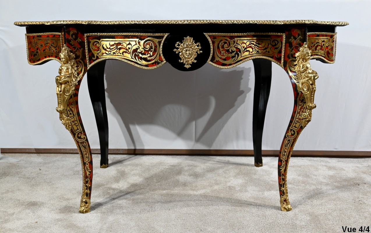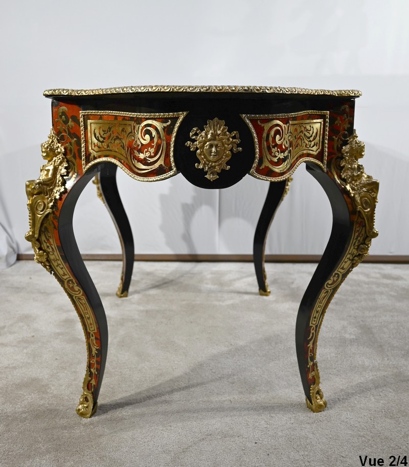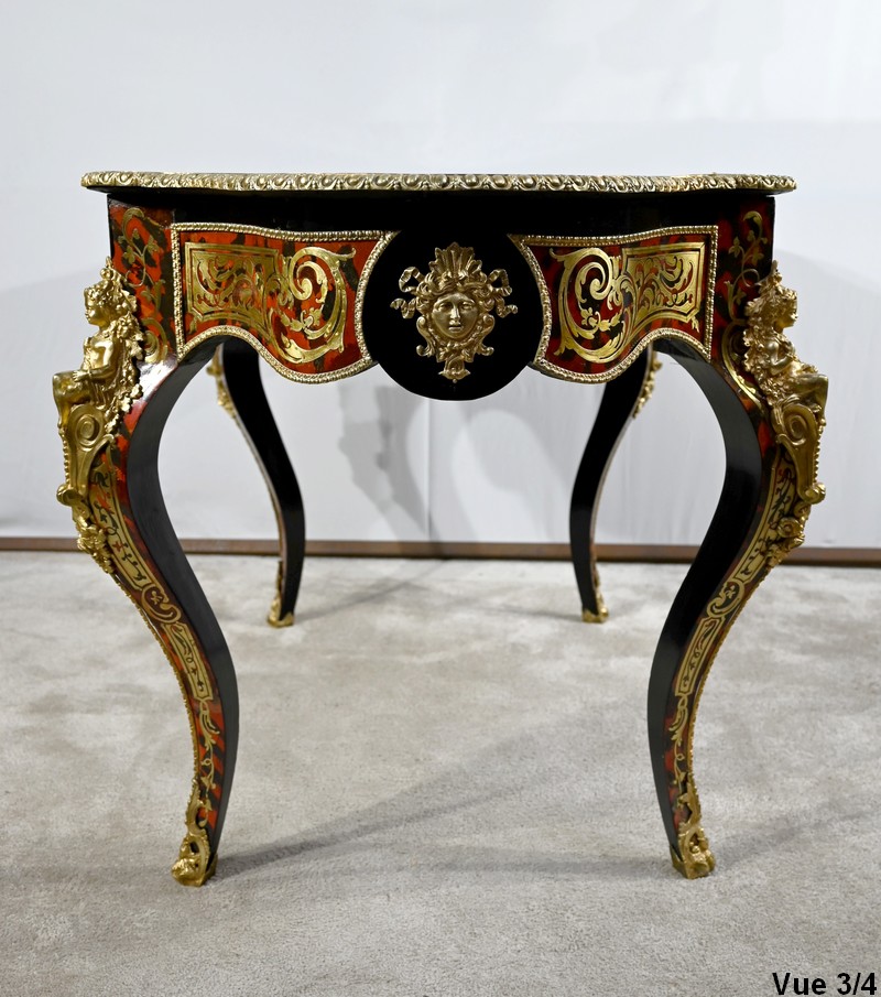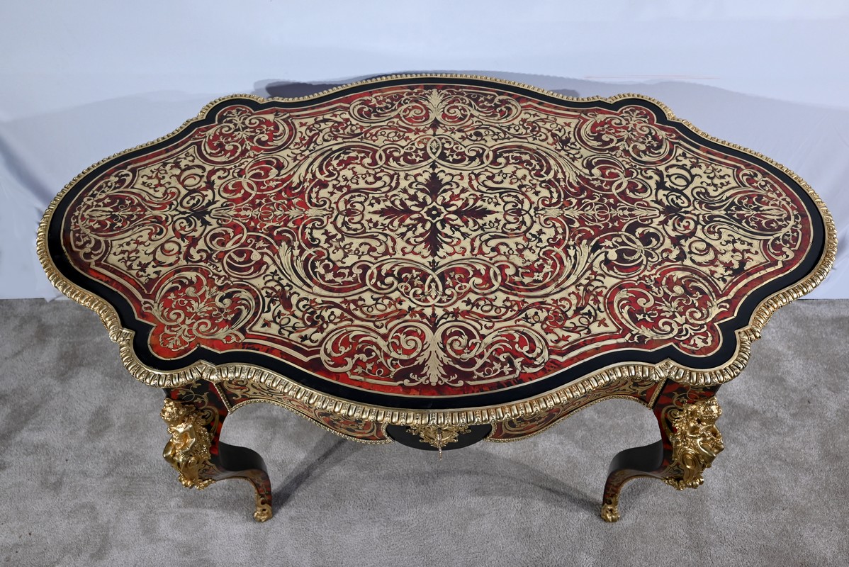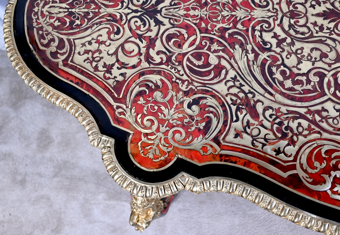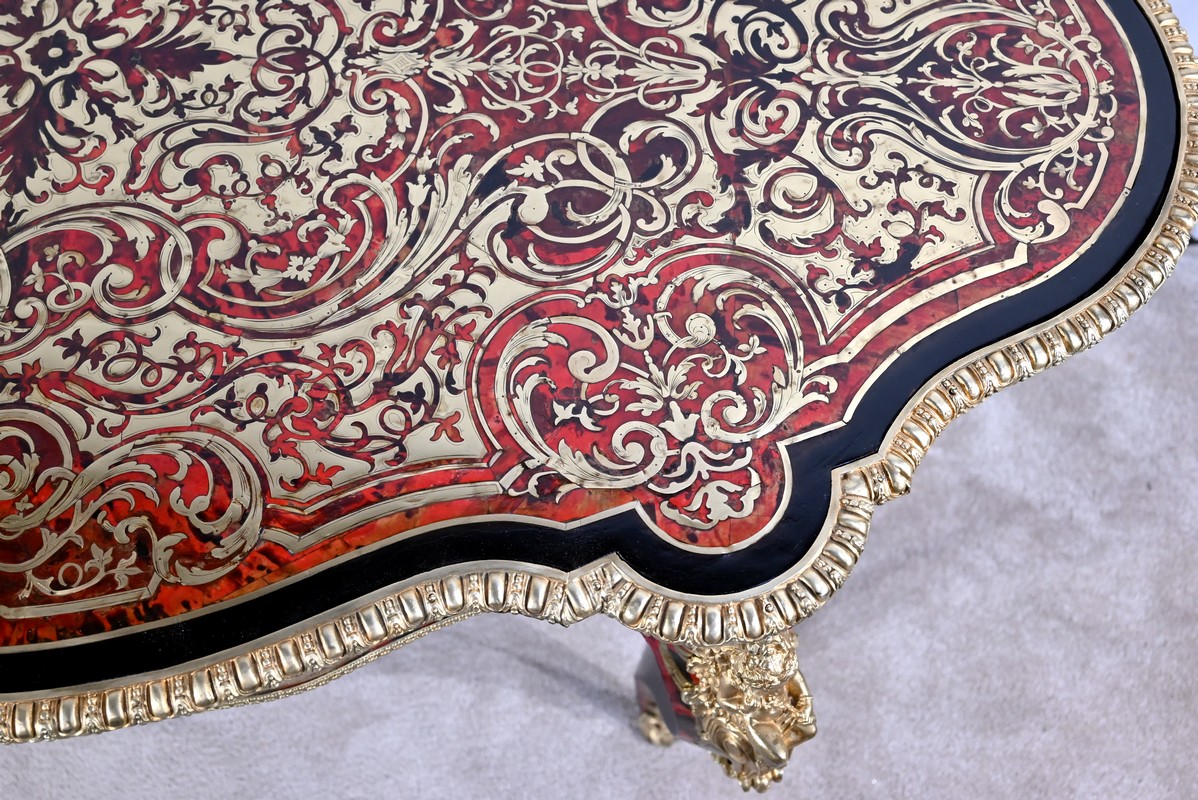 Table d’apparat violonée en poirier noirci intégralement marquetée dans le style Boulle, du nom de André-Charles BOULLE, maître ébéniste du Roi Louis XIV.
