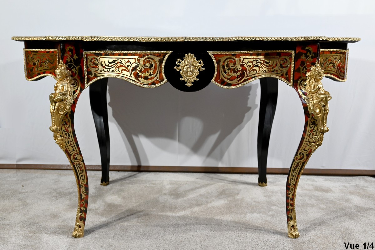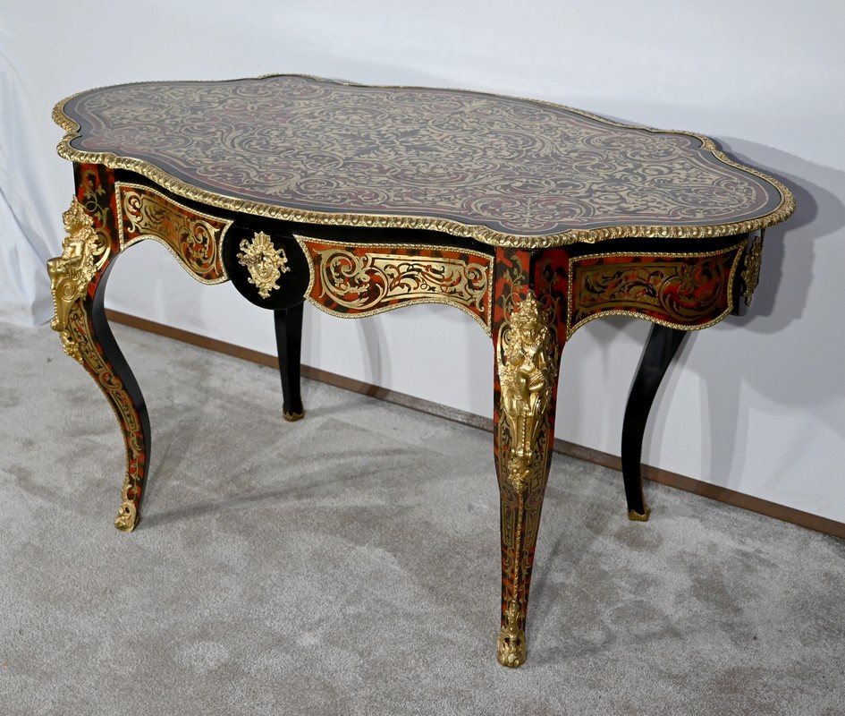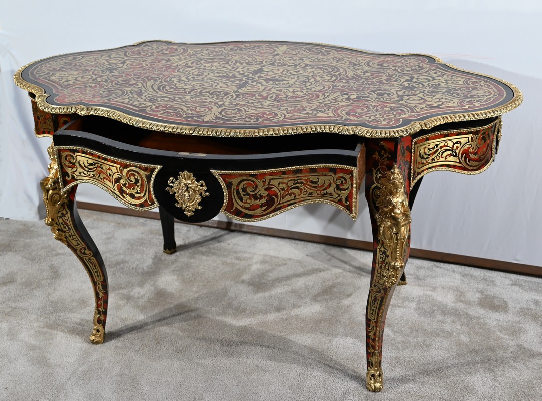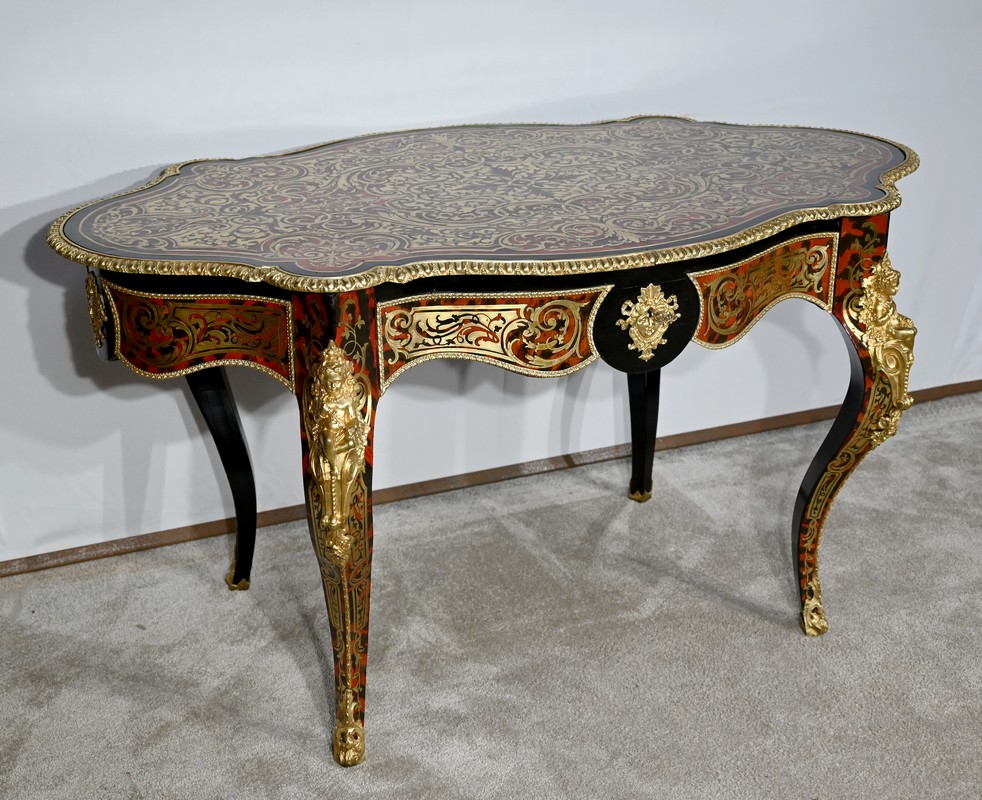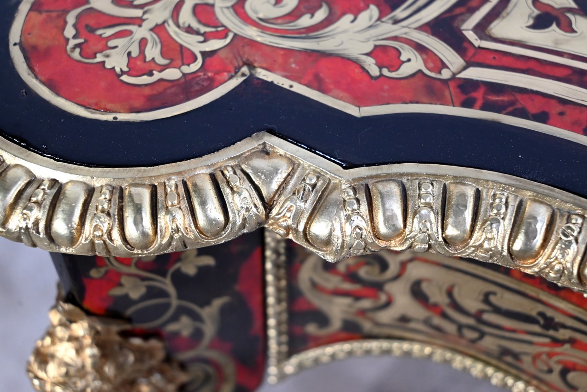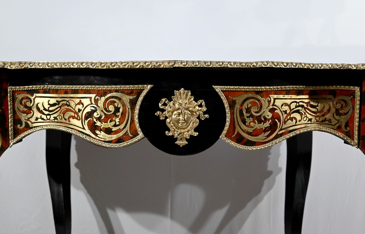 Table d’apparat violonée en poirier noirci intégralement marquetée dans le style Boulle, du nom de André-Charles BOULLE, maître ébéniste du Roi Louis XIV.