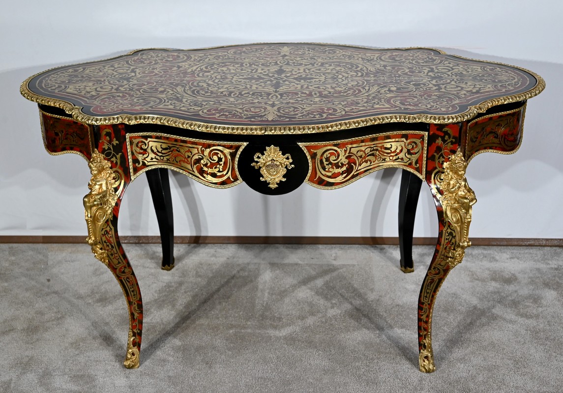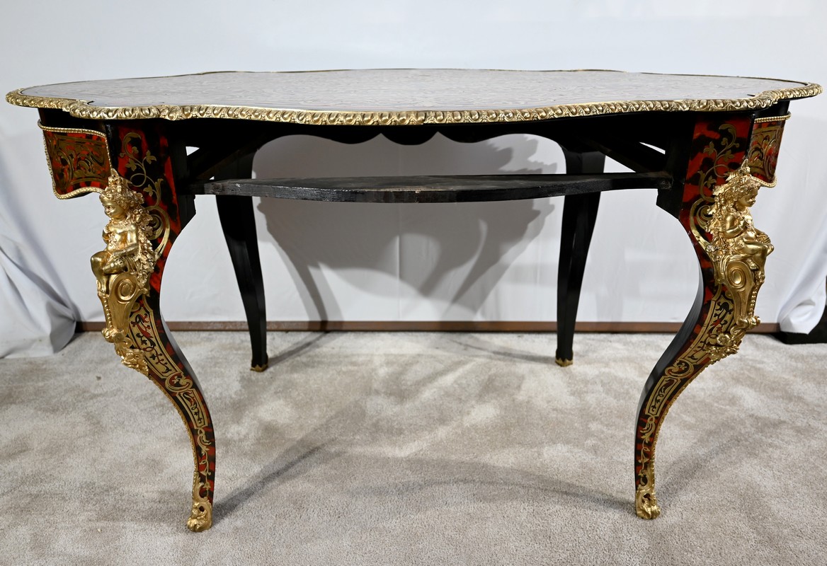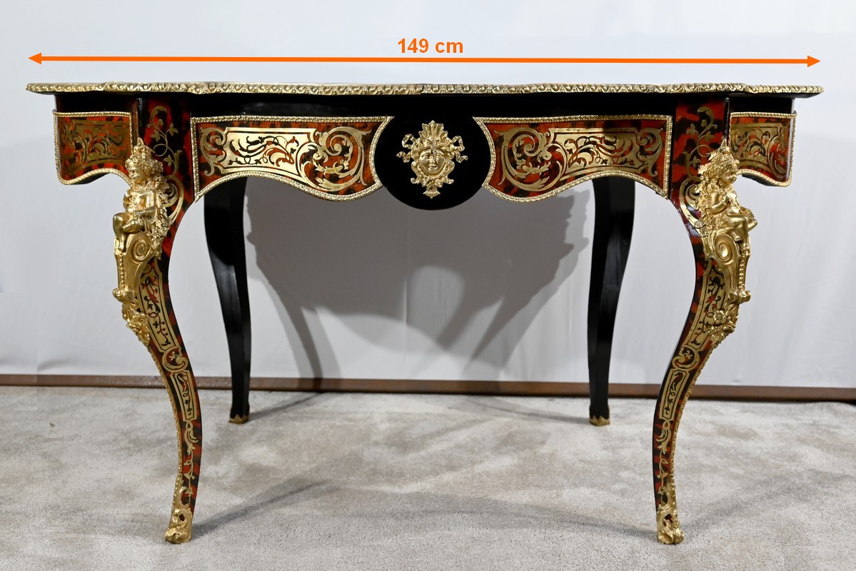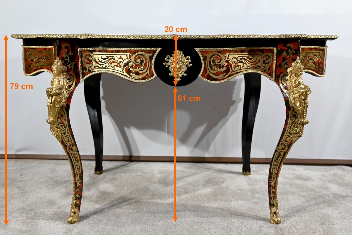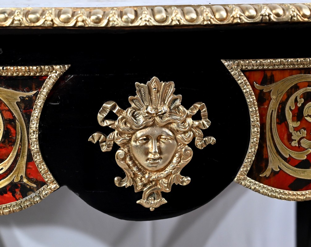 Table d’apparat violonée en poirier noirci intégralement marquetée dans le style Boulle, du nom de André-Charles BOULLE, maître ébéniste du Roi Louis XIV.