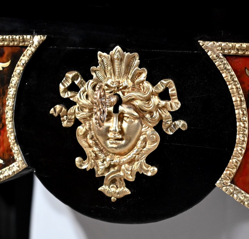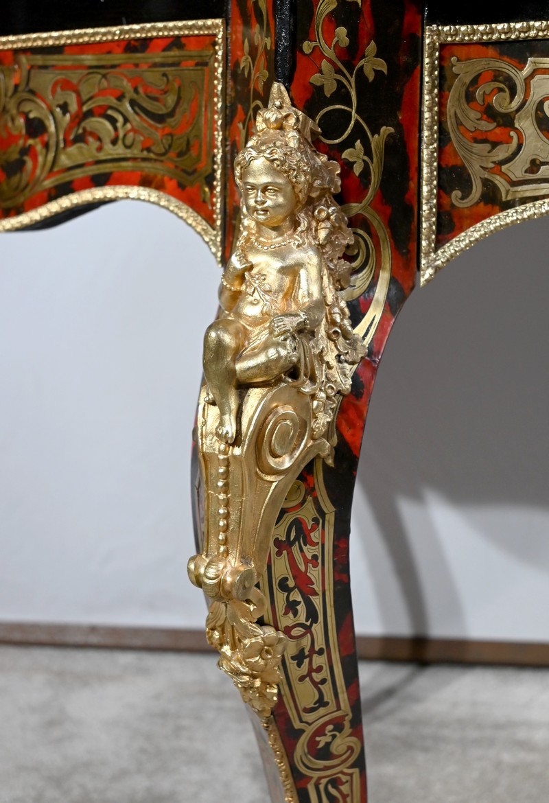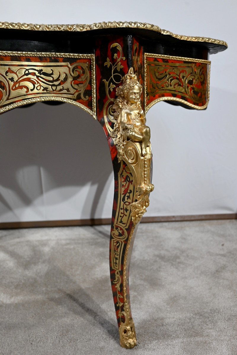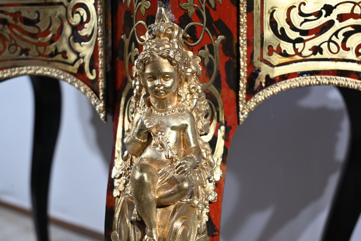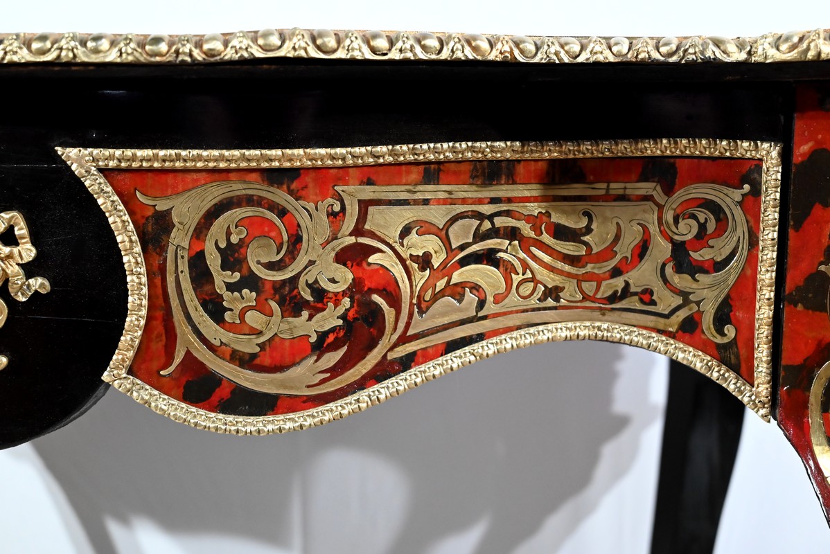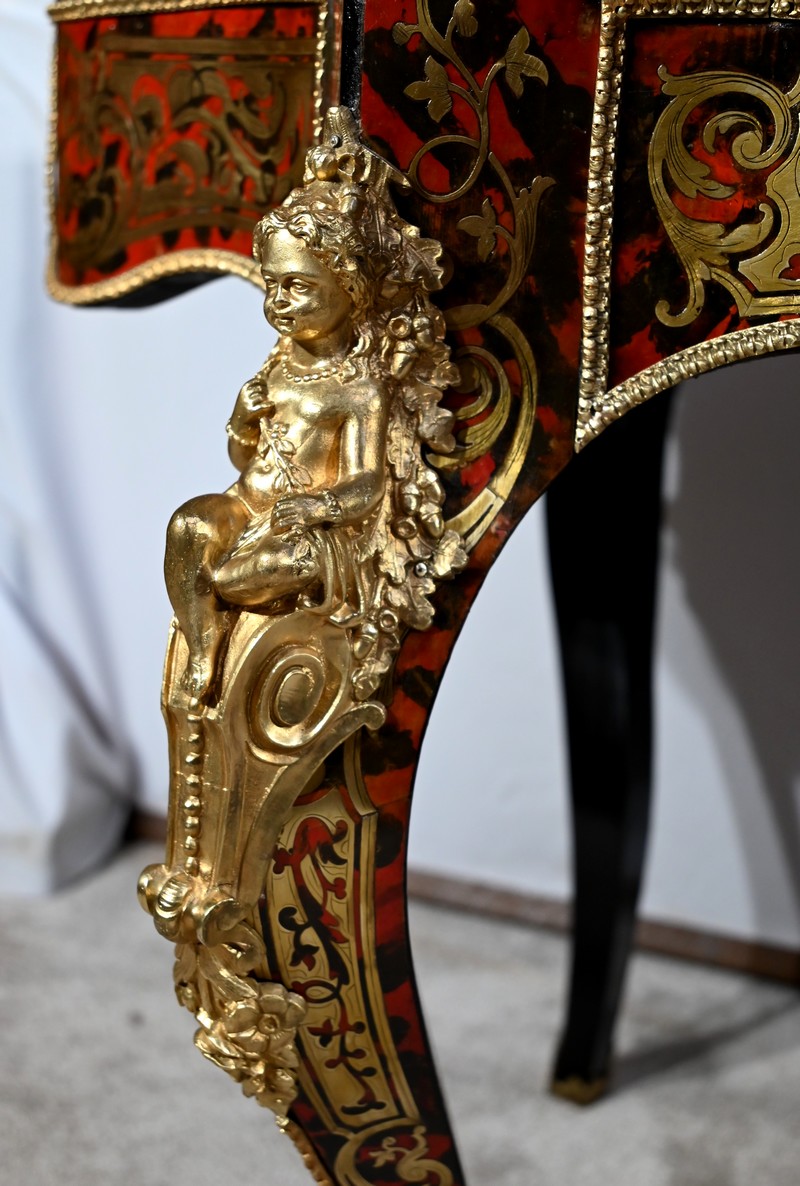 Table d’apparat violonée en poirier noirci intégralement marquetée dans le style Boulle, du nom de André-Charles BOULLE, maître ébéniste du Roi Louis XIV.